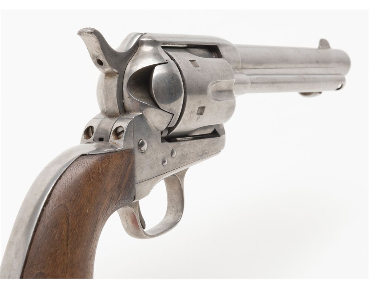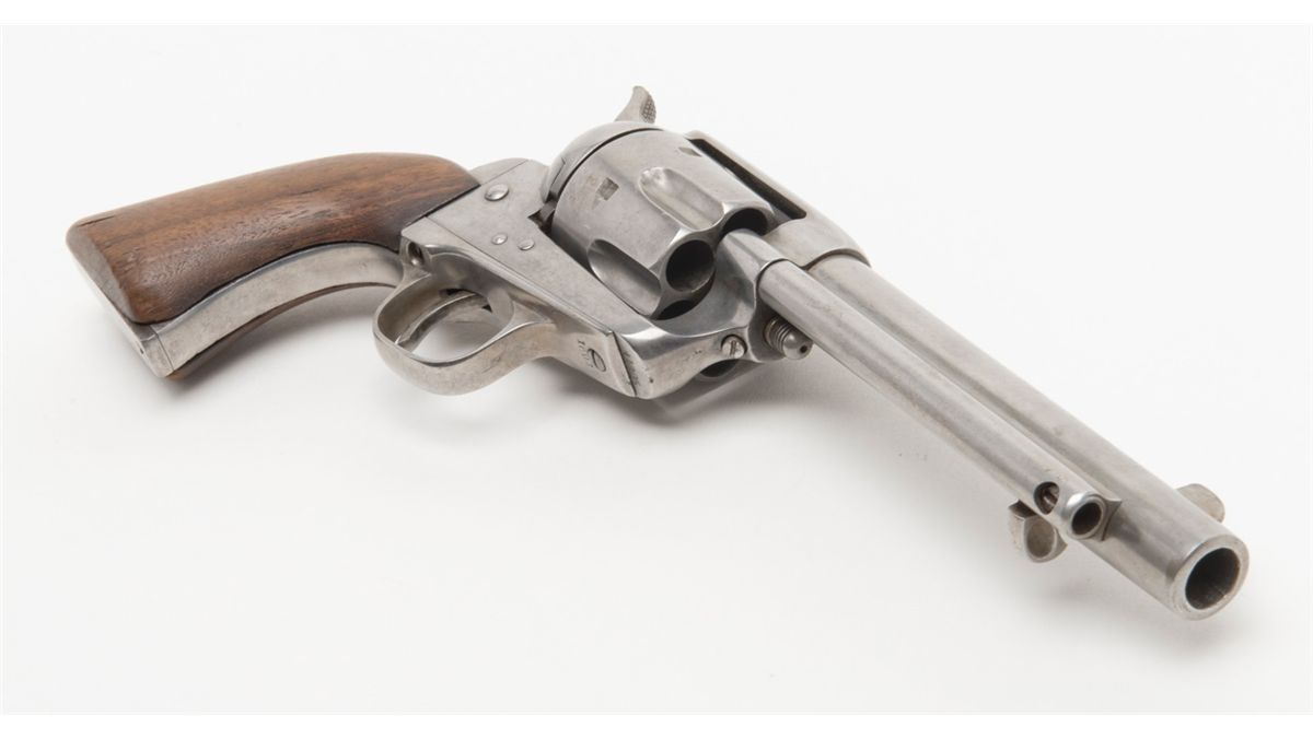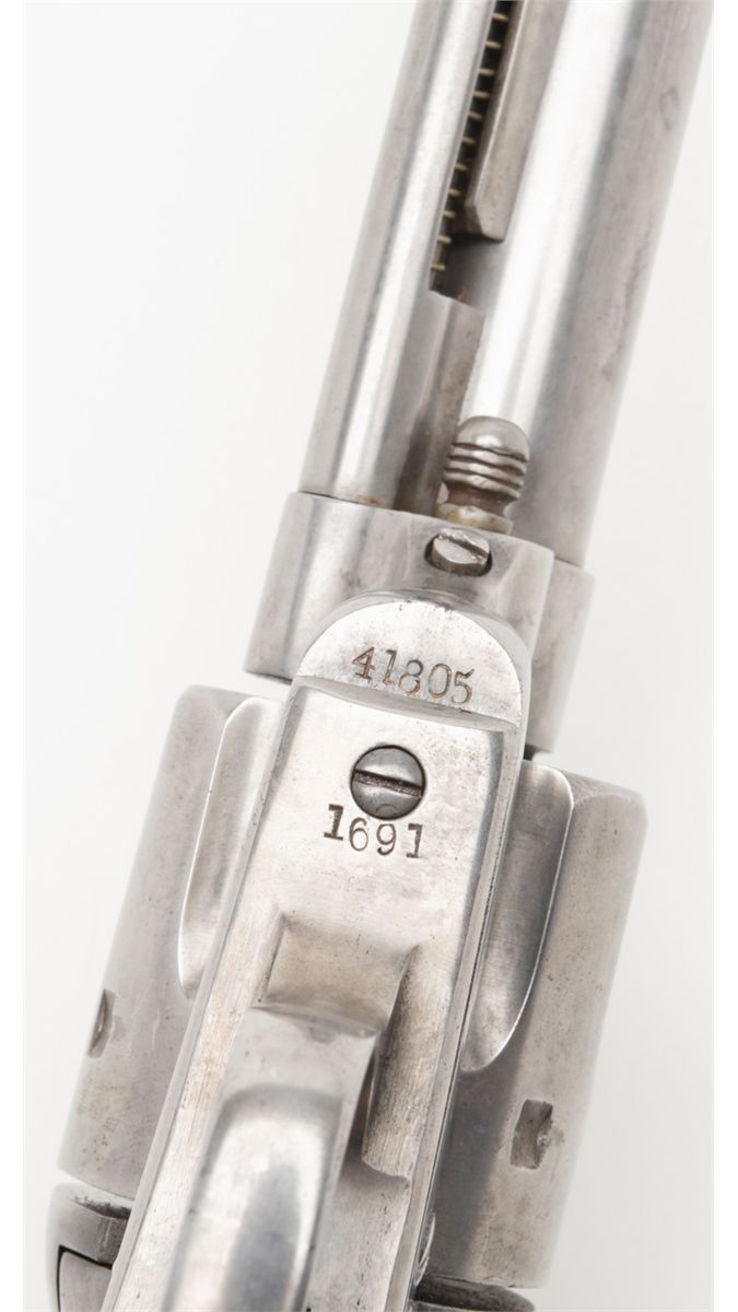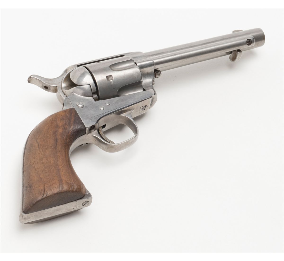 Colt SAA revolver, .45 cal., 5-1/2” barrel, wood grips, mixed numbers, frame #41805. This gun is in overall fair to good condition as re-worked and heavily buffed; good action, fair to good bore, overall fair to good grips; barrel is numbered419, trigger guard is 1691, backstrap number is only partially visible and there is no visible serial number on the cylinder. The barrel address appears to have been freshened as has the three-lined patent address; there is aquestionable U.S. marking on the left side of the frame and there are no observable inspector initials on any of the metal parts of the revolver and no observable inspector’s cartouches on the grips. Est.: $500-$1,000.