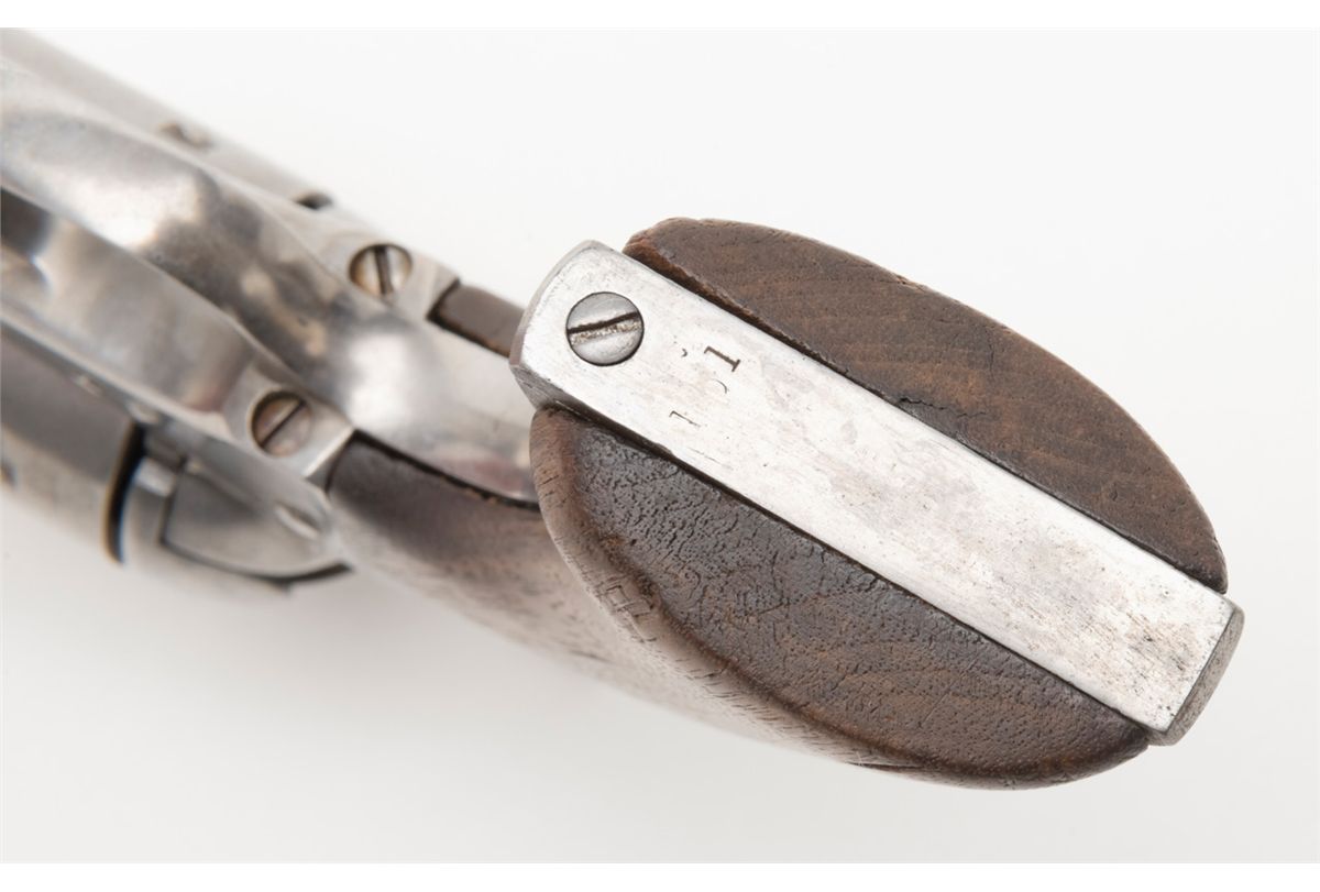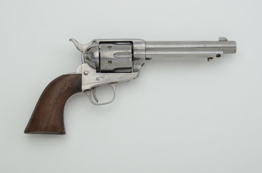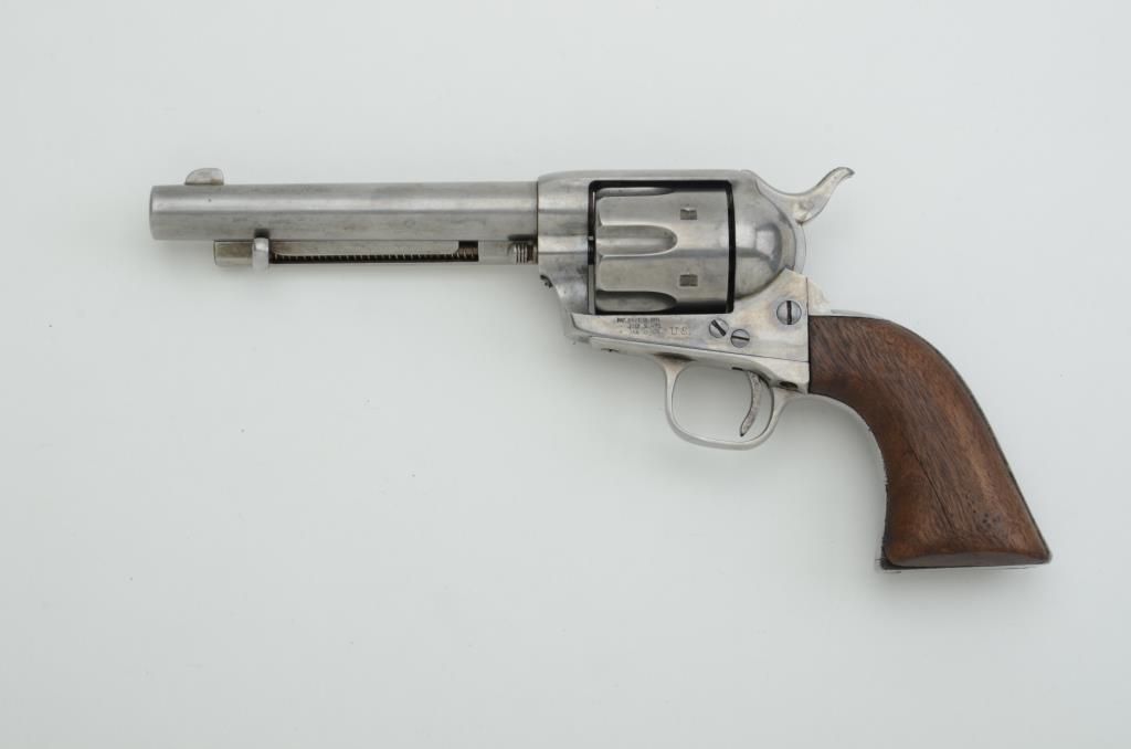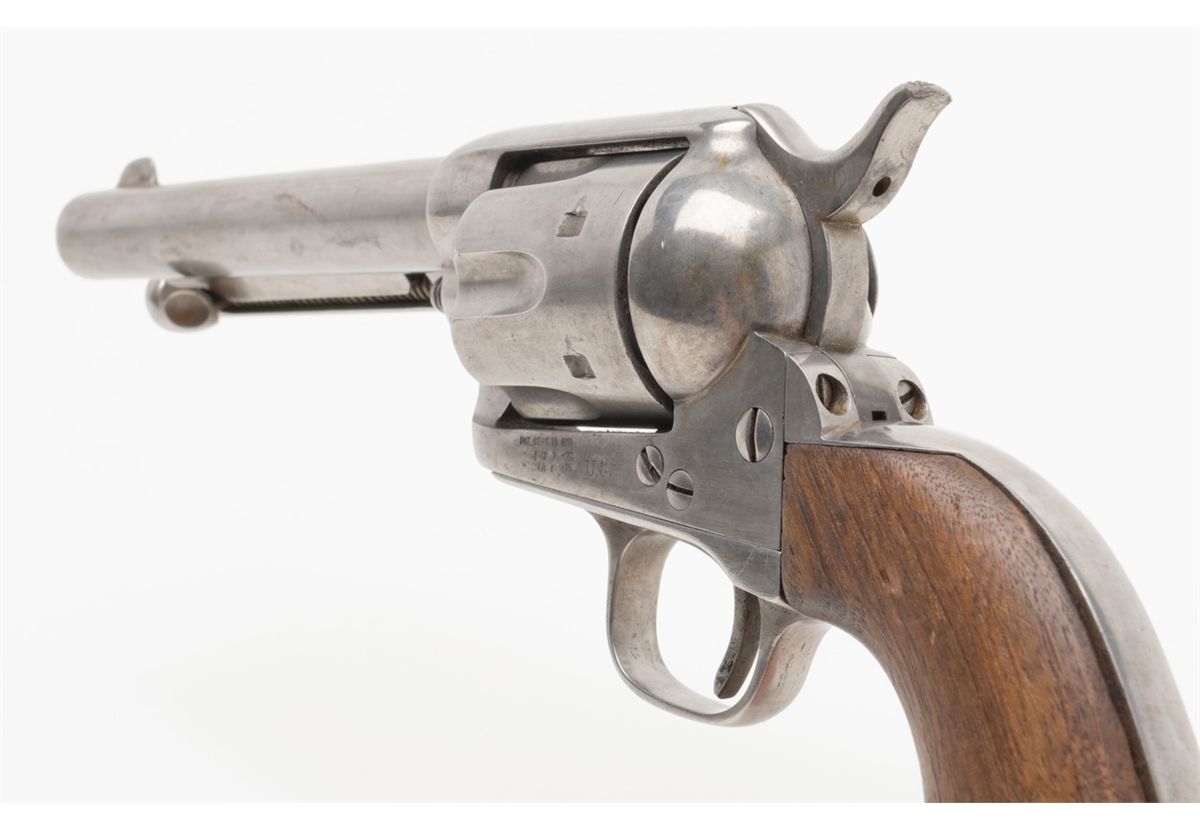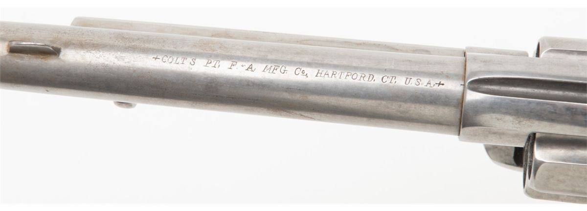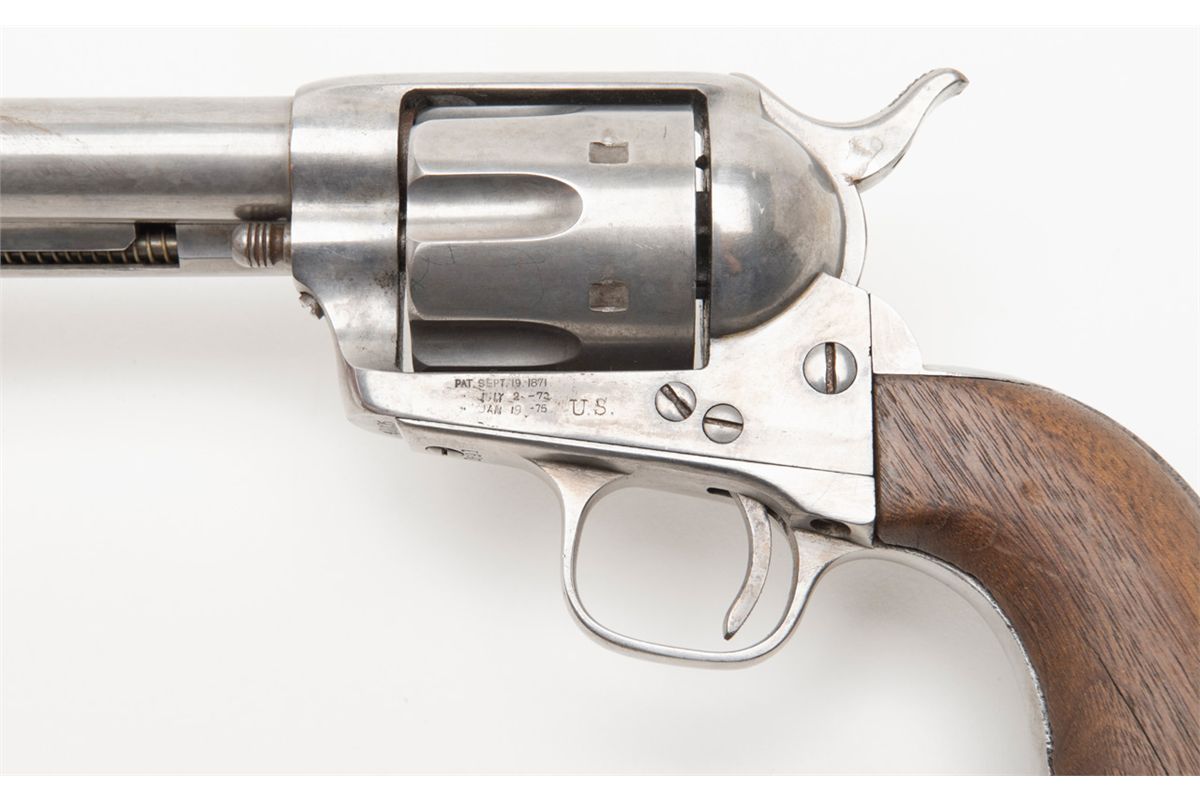 Colt SAA revolver, .45 cal., 5-1/2” barrel, wood grips, mixed numbers, frame #41805. This gun is in overall fair to good condition as re-worked and heavily buffed; good action, fair to good bore, overall fair to good grips; barrel is numbered419, trigger guard is 1691, backstrap number is only partially visible and there is no visible serial number on the cylinder. The barrel address appears to have been freshened as has the three-lined patent address; there is aquestionable U.S. marking on the left side of the frame and there are no observable inspector initials on any of the metal parts of the revolver and no observable inspector’s cartouches on the grips. Est.: $500-$1,000.