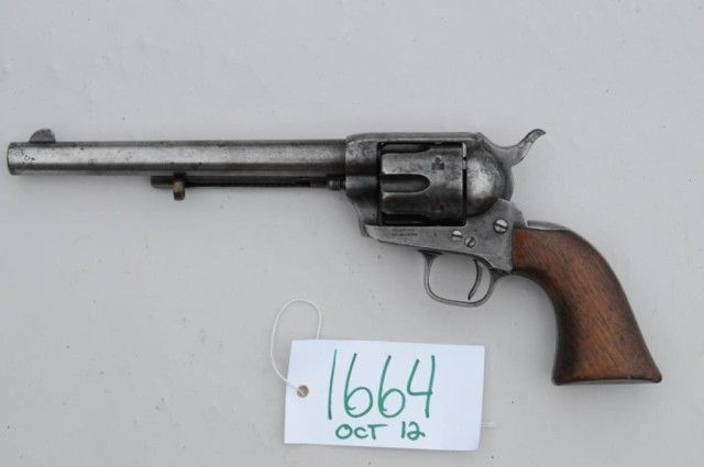 Colt SAA revolver, .45 cal., 7-1/2” barrel, #24511. This early Colt shows 2 line patent dates and large block letter address circa 1874-1875. The Colt shows traces of finish in protected areas with a grey patina and somelight to moderate scattered pitting and erosion; good sharp edges and markings; all matching numbers; good grips showing slight edgewear and minor imperfections; front sight trimmed a little at top; good action, verygood bore; some great blue and case where protected (about 5-10%). A well-cared for and very early frontier Colt that is original down to its cylinder pin and ejector rod head. Est.: $2,500-$5,000.