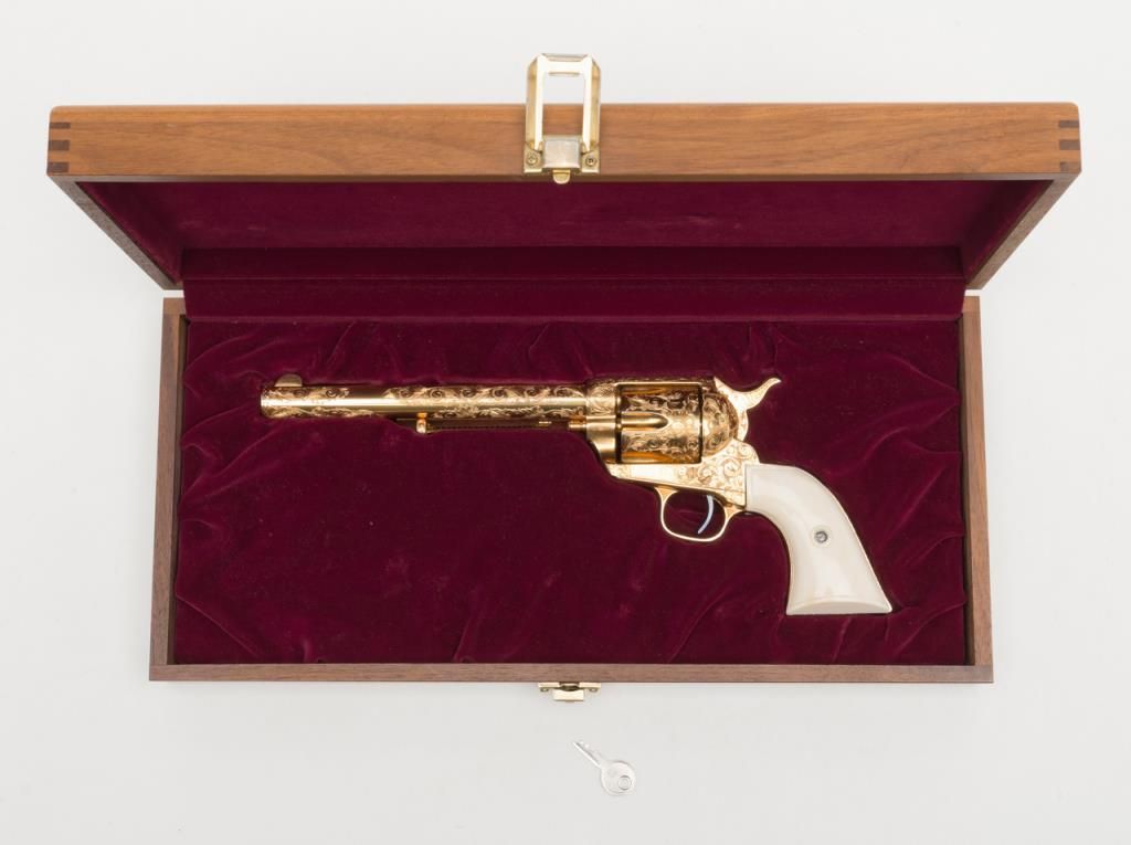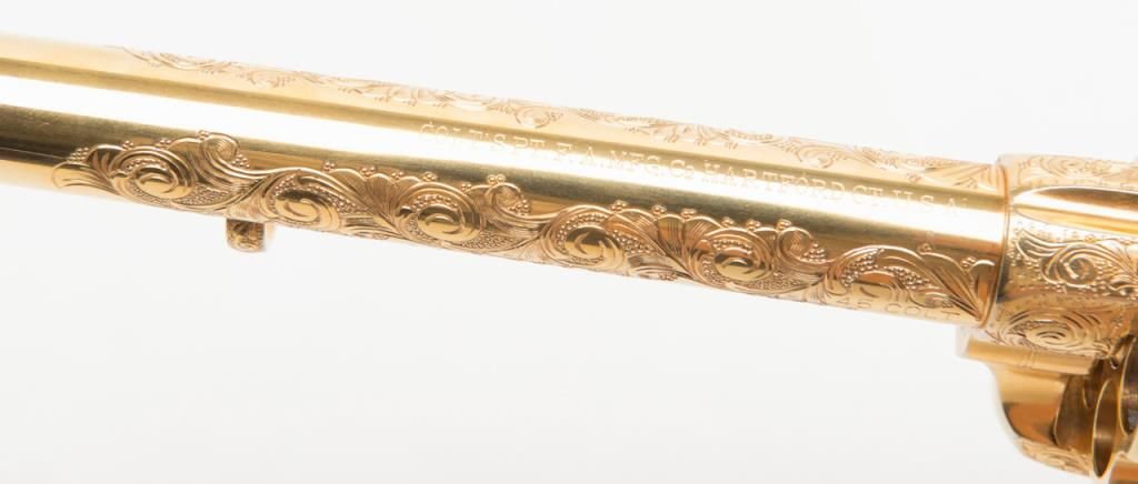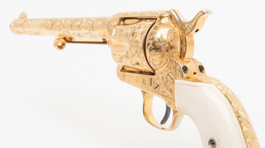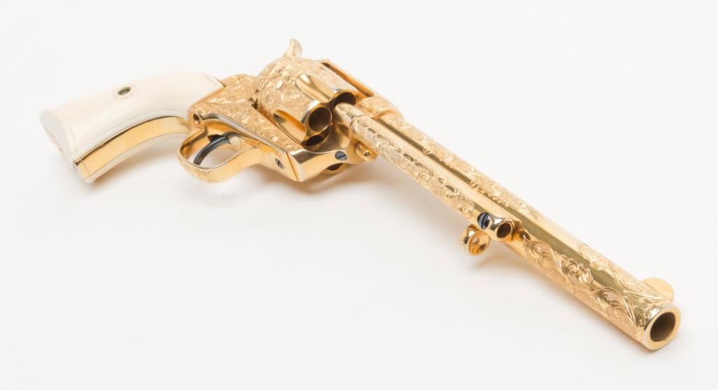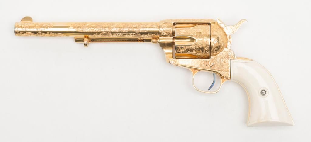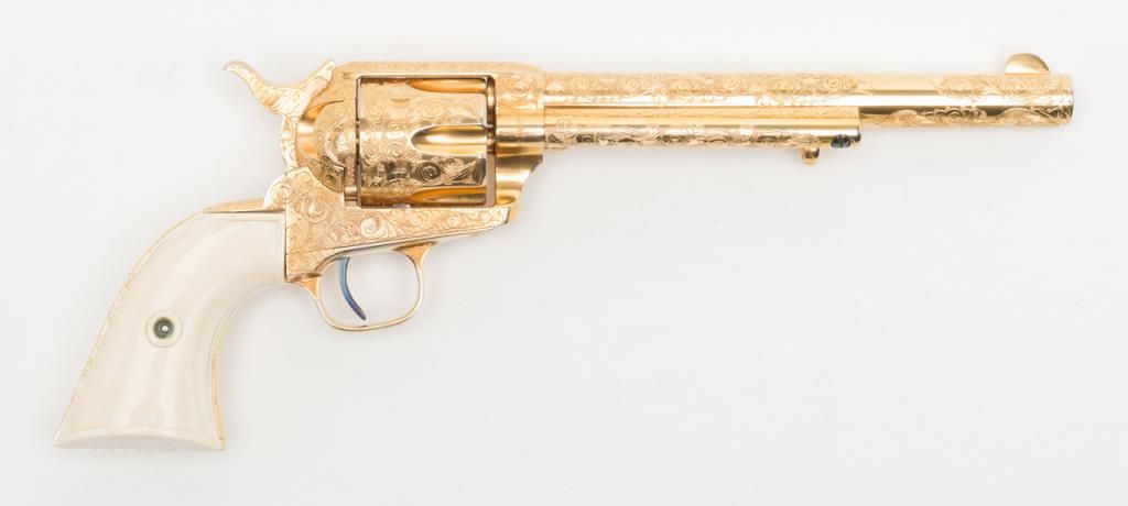 Colt SAA revolver, .45 cal., 7-1/2” barrel, Western style scroll engraved, gold plated, well-made ivory grips, #63983 in presentation style fitted case with maroon velvet interior. This revolver is beautifully engraved in BobBarlow style Western scroll engraving with stylized wolf-head on the hammer and other motifs taken from old West and Santa Fe design ideas; Barlow’s engraving is somewhat unique and he had his own style which was not a copy of the factorystyle but influenced by it. The markings are refreshed, the grips are very nicely border carved and beautifully made and would cost $1,000 to $1,500 to replace by themselves. The pistol has been nicely refinished and shows good edges,refreshed markings, matching serial numbers, blued small parts, good action, fair to good bore. The quality of the plating is also excellent in a rich gold appearance. Accompanied by factory letter confirming caliber, indicating barrel length of7-1/2” and noting shipment to Hartley and Graham of New York, NY on Nov. 4, 1881, 50 guns in shipment. (Antique). Est.: $4,000-$8,000.