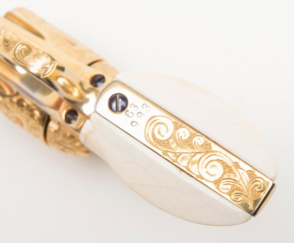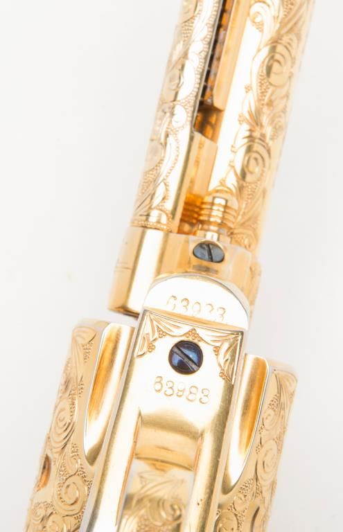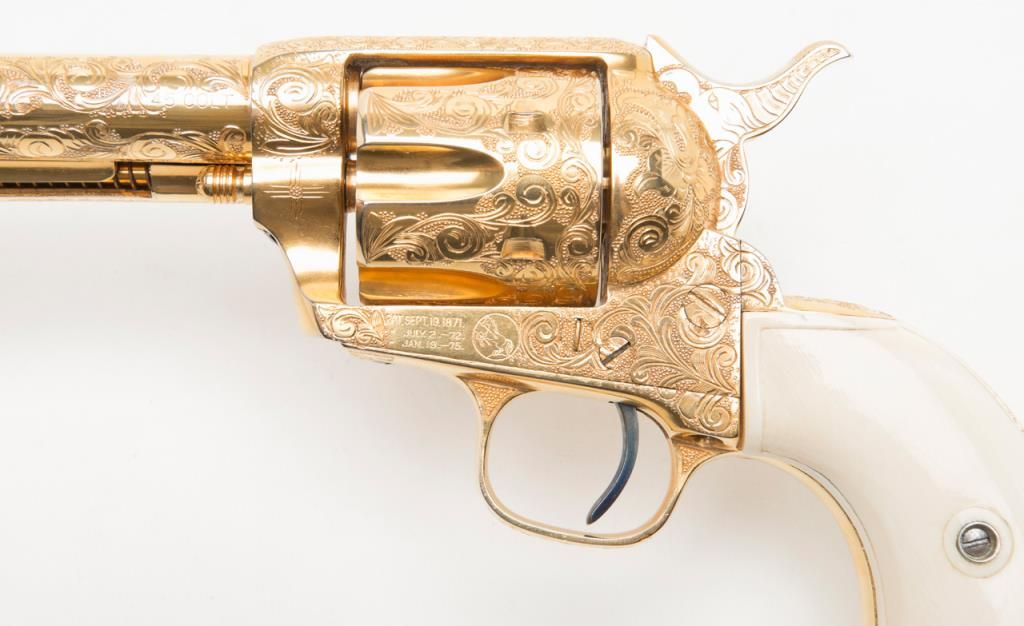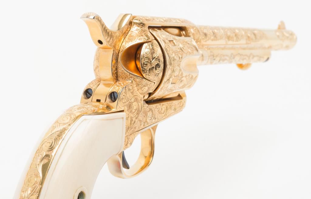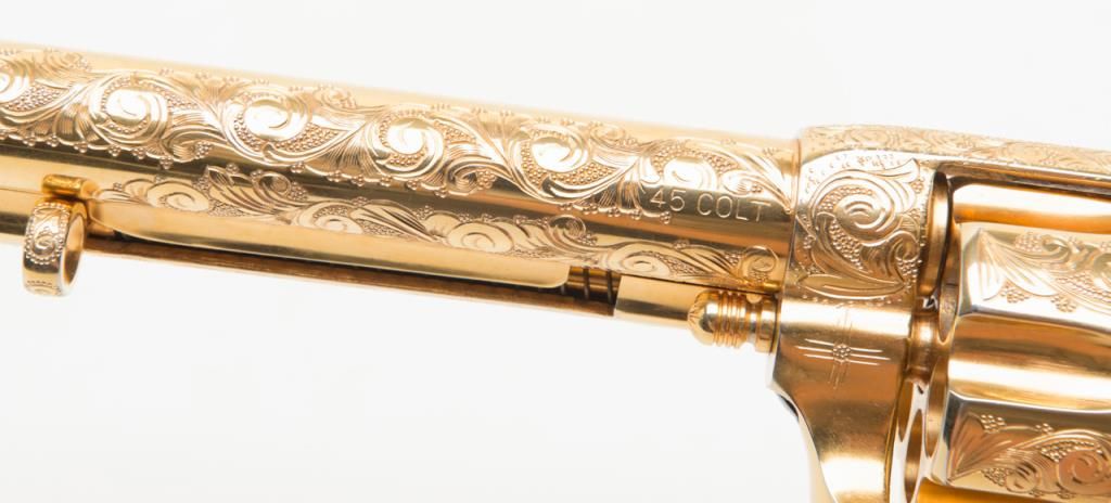 Colt SAA revolver, .45 cal., 7-1/2” barrel, Western style scroll engraved, gold plated, well-made ivory grips, #63983 in presentation style fitted case with maroon velvet interior. This revolver is beautifully engraved in BobBarlow style Western scroll engraving with stylized wolf-head on the hammer and other motifs taken from old West and Santa Fe design ideas; Barlow’s engraving is somewhat unique and he had his own style which was not a copy of the factorystyle but influenced by it. The markings are refreshed, the grips are very nicely border carved and beautifully made and would cost $1,000 to $1,500 to replace by themselves. The pistol has been nicely refinished and shows good edges,refreshed markings, matching serial numbers, blued small parts, good action, fair to good bore. The quality of the plating is also excellent in a rich gold appearance. Accompanied by factory letter confirming caliber, indicating barrel length of7-1/2” and noting shipment to Hartley and Graham of New York, NY on Nov. 4, 1881, 50 guns in shipment. (Antique). Est.: $4,000-$8,000.
