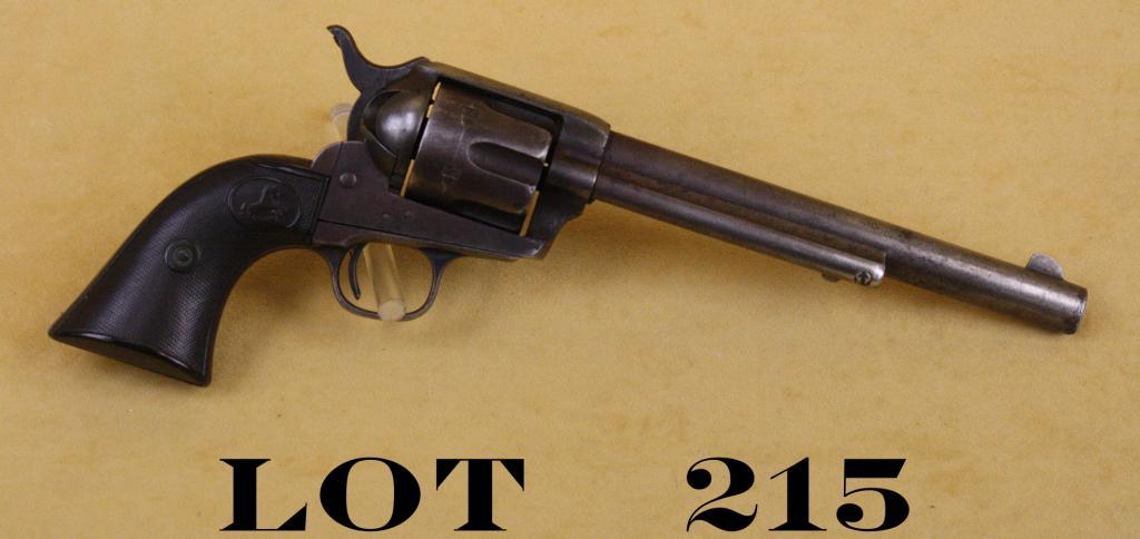 Colt SAA revolver, .45 cal., 7-1/2” barrel, blue and case hardened finish, checkered black Colt hard rubber grips, #77380. This gun is in overall good untouched condition showing traces of original blue in protectedareas with the balance gone to a brown and gray patina; dark bore that may clean to good; good action and markings, all matching visible serial numbers, cylinder pin head broken off decades ago; grips are overallworn but good showing some scattered old mars. This gun is accompanied by an old double loop holster and cartridge belt that is dry and separated in several places with some of the cartridge loops loose as theylost their stitching. This is the first time this rig has been offered on the collector’s market as it descended directly thru the family of our consignor who indicated his wife’s grandfather, Oscar James King, was the original owner. King was reportedly born in Iowa and moved to Fresno, California in 1902. An untouched blackpowder single action Colt and period rig with family history. Est.: $1,500-$3,000.