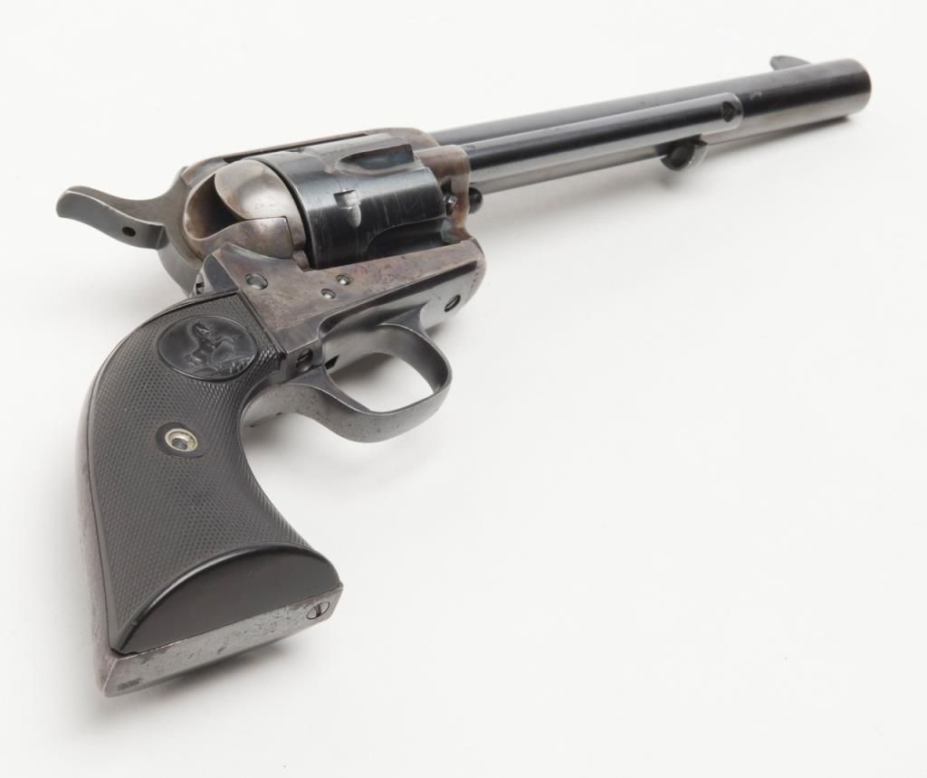 Colt SAA revolver, .45 cal., 7-1/2” barrel, blue and case hardened finish, checkered hard rubber grips, #346783 (circa 1924) in overall near fine condition with 80%-90% original blue, 50%-70% case hardening; some high point and edge wear, minorlosses of finish due to harry and use; small areas of minor erosion and pinprick pitting; good action, fine bore. (C&R). Est.: $3,000-$6,000.