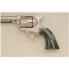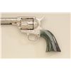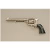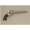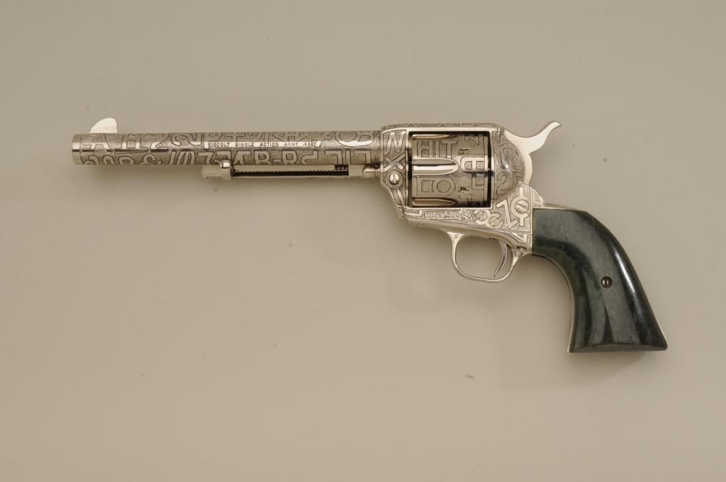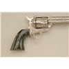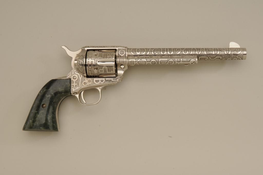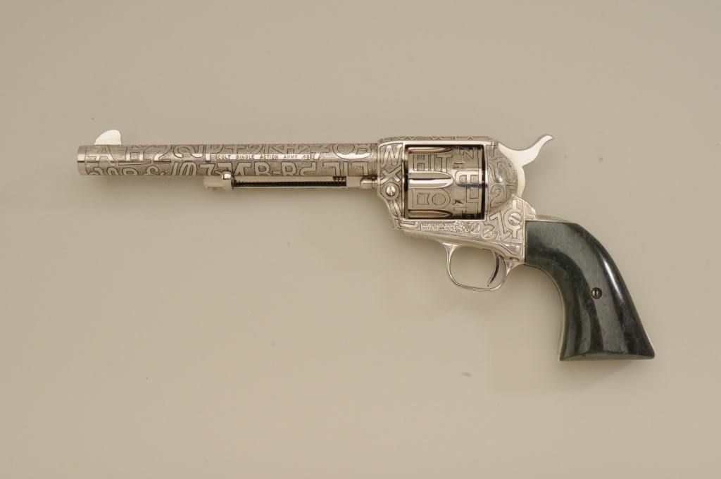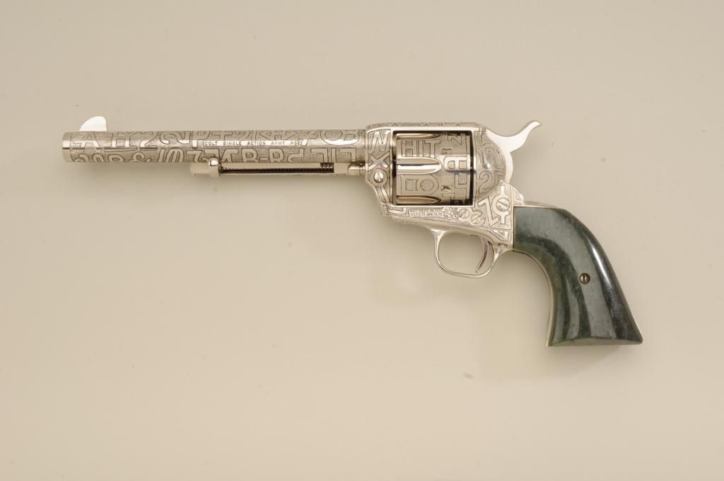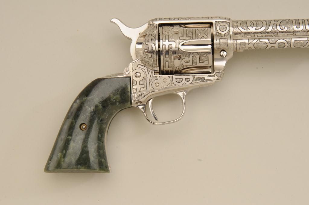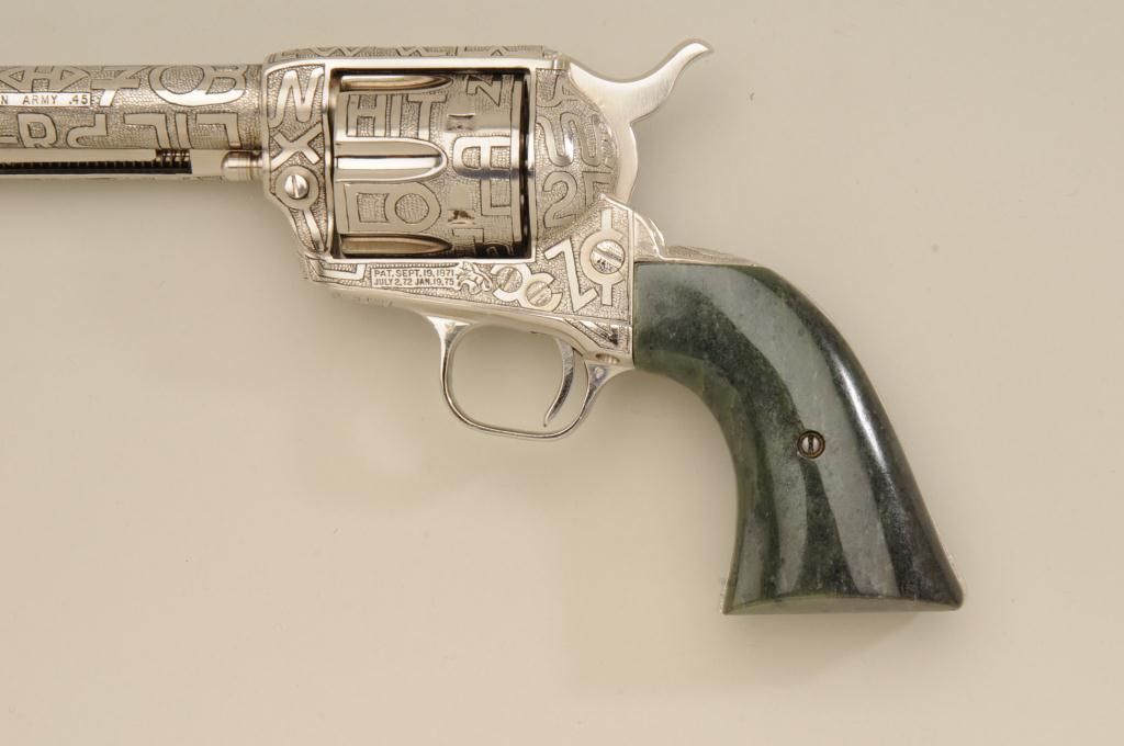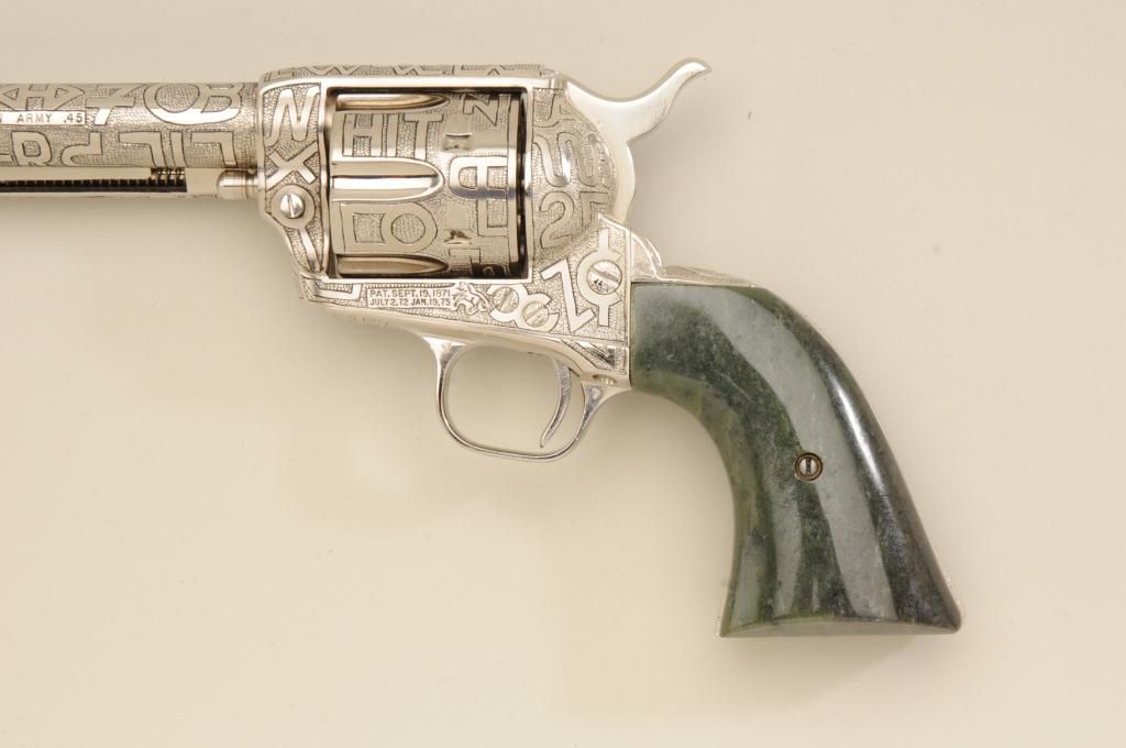 Colt SAA revolver, .45 cal., 7-1/2” barrel, custom cattle brand engraving by Weldon Bledsoe, nickel finish, Wyoming jade grips, #64132SA. This gun is in overall fine condition showing full coverage of cattlebrands with stippled background, 99% re-finish remaining, bright bore, crisp action and markings, fine custom grips; a beautifully accomplished piece of Western artwork! From the Texas collection of EddieGlover, Jr. Est.: $2,500-$5,000.