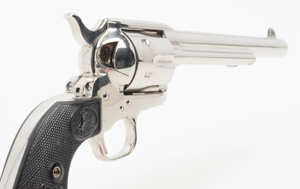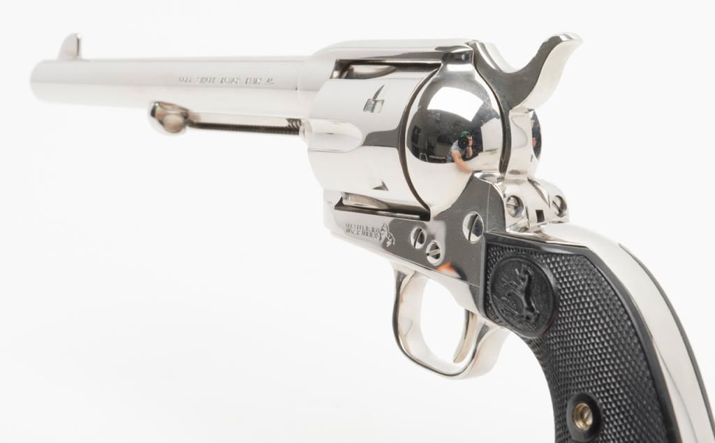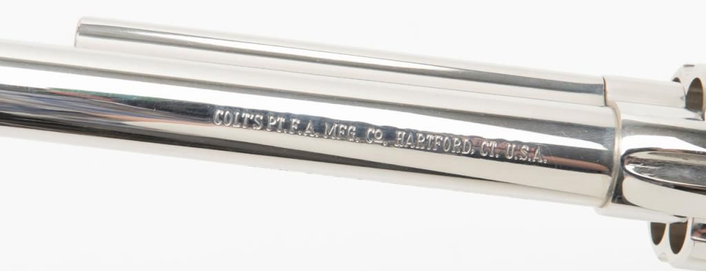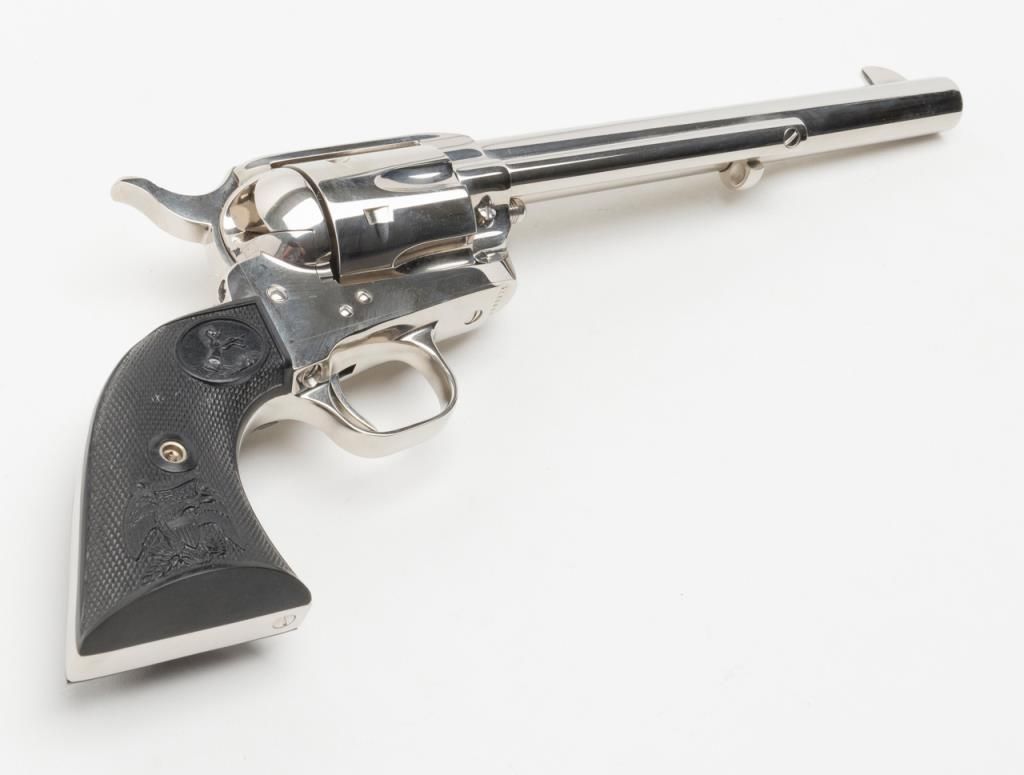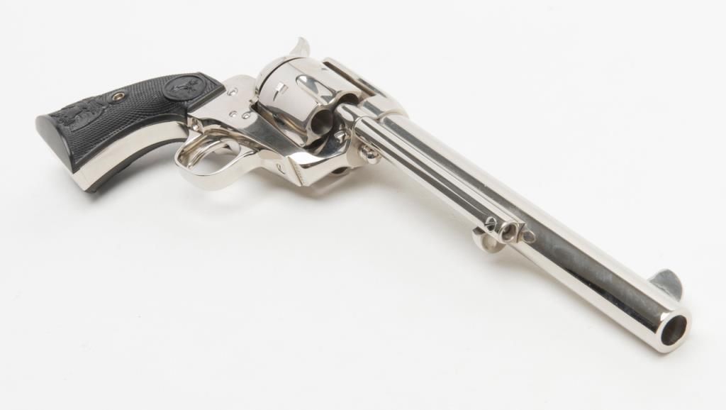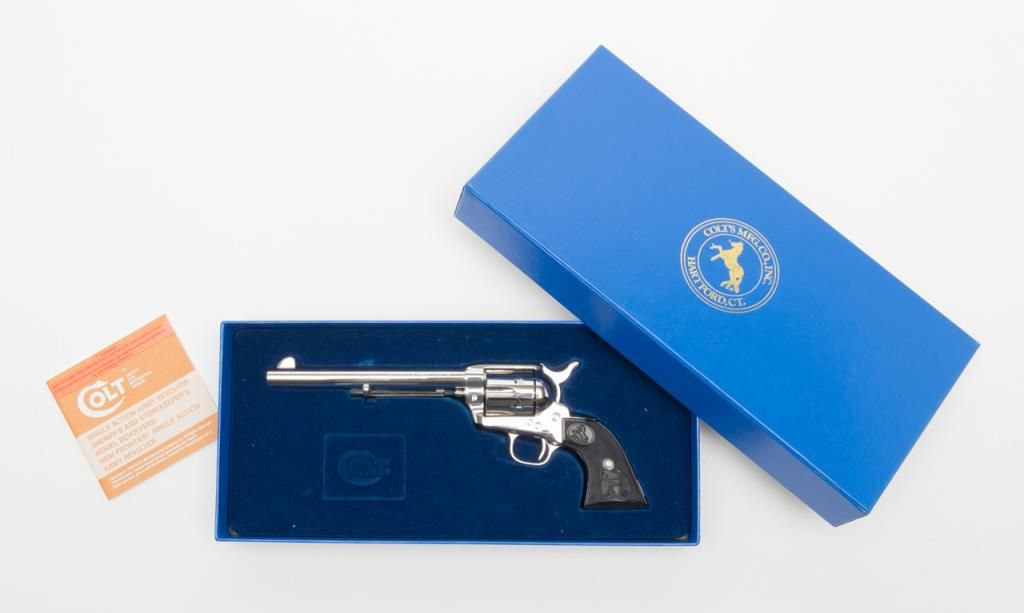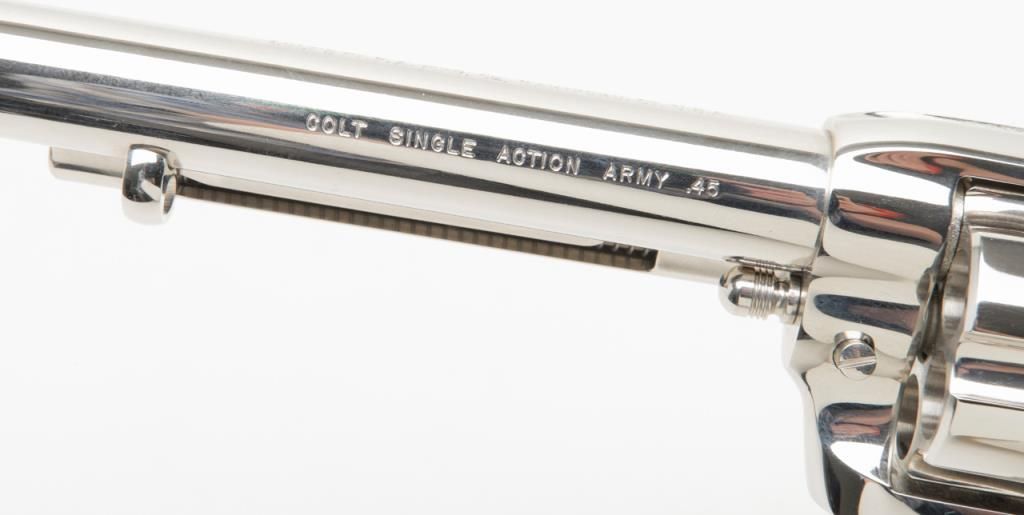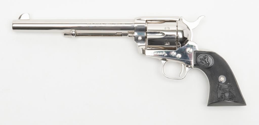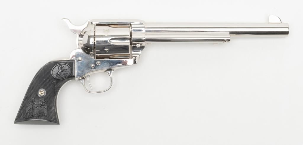 Colt SAA revolver, .45 cal., 7-1/2” barrel, nickel finish, checkered hard rubber eagle grips, 4th Generation, #S27366A in like new to mint condition in factory two piece blue box with inserts, instructions and misc. paperwork; exterior factory cardboard sleeve also included with end label numbered to this gun. No nickel plated SAAs are currently available from the factory except on custom order; previously in the Joe Kiser collection. (C&R/PPT). Est.: $1,200-$1,800.