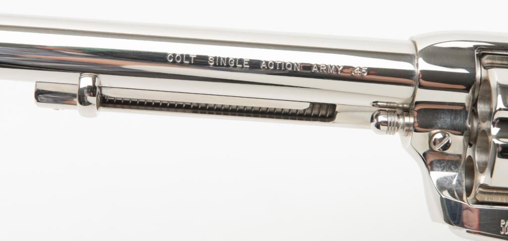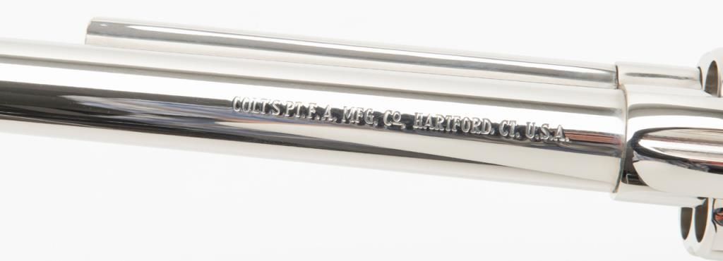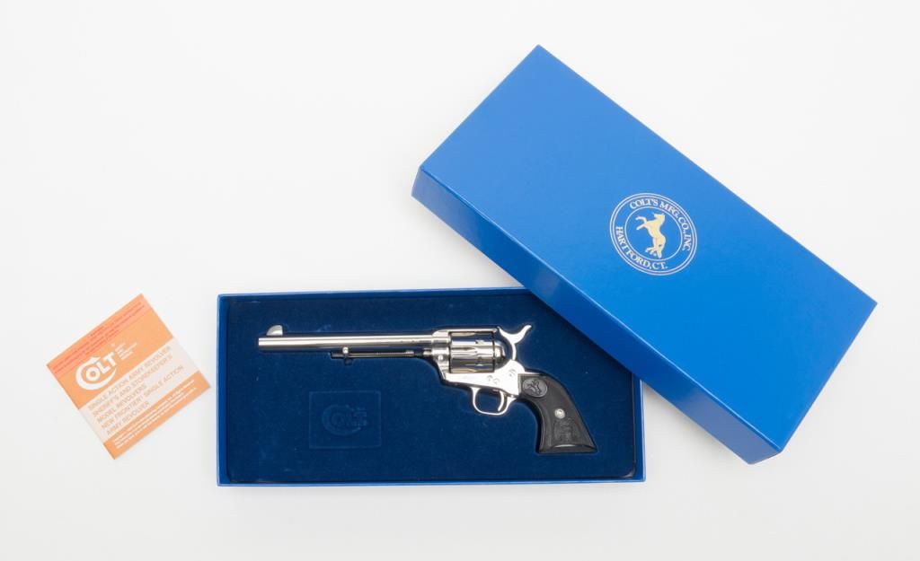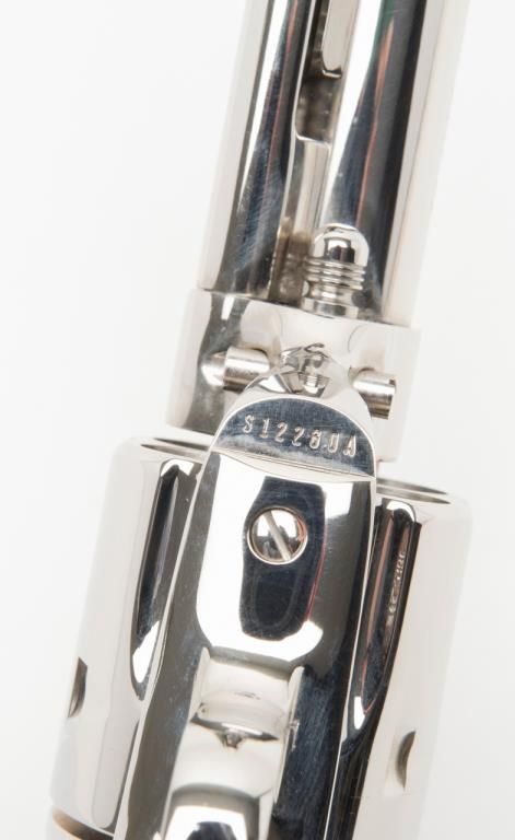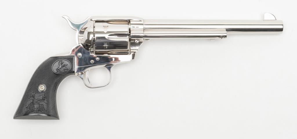 Colt SAA revolver, .45 cal., 7-1/2” barrel, nickel finish, hard rubber eagle grips, 4th Generation, #S12260A in excellent to near new condition in original blue two piece factory box with inserts, instructions and outer shipping sleeve with endlabel numbered to this gun; slight index line on cylinder. No nickel plated SAAs are currently available from the factory except on custom order; previously in the Joe Kiser collection. (C&R/PPT). Est.: $1,400-$2,800.