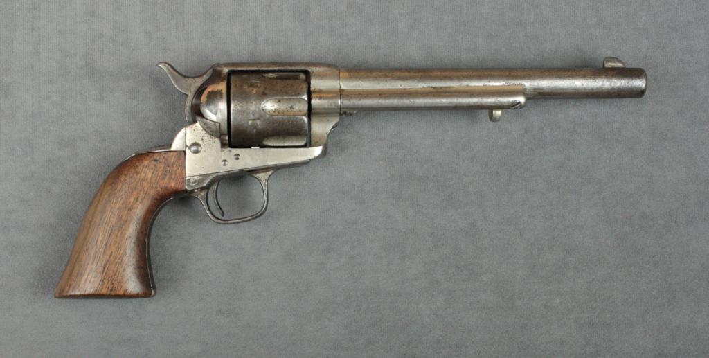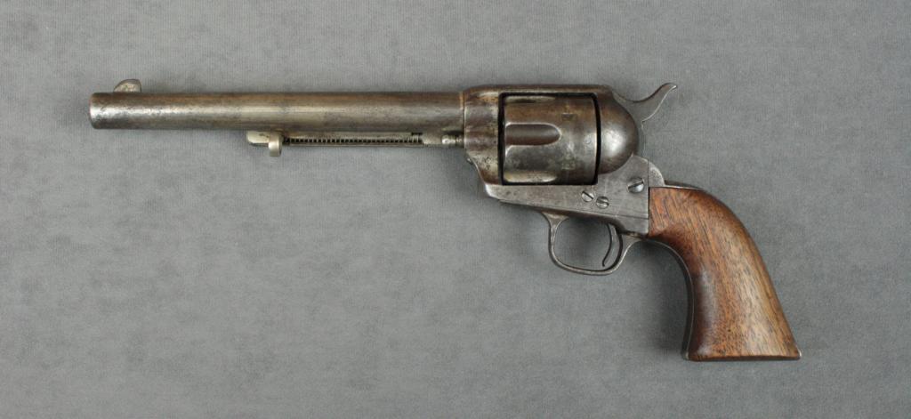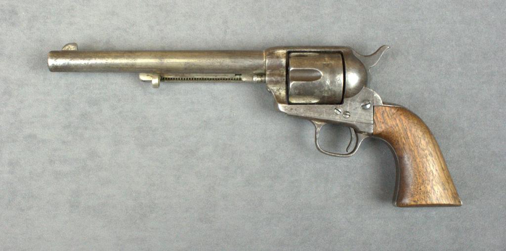 Colt SAA revolver, .45 cal., 7-1/2” barrel, nickel finish, wood grips, #26232. This gun is in overall very good condition showing approx. 30% original finish with balance gone to a grey patina with scattered areas oflight pitting and erosion; circa 1876 blackpowder, bore is fair and may clean to good, action is crisp, markings very good; grips appear to be of Colt manufacture but may not be original to this gun. A niceearly SAA. Est.: $2,750-$4,500.
