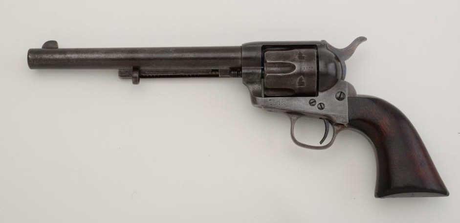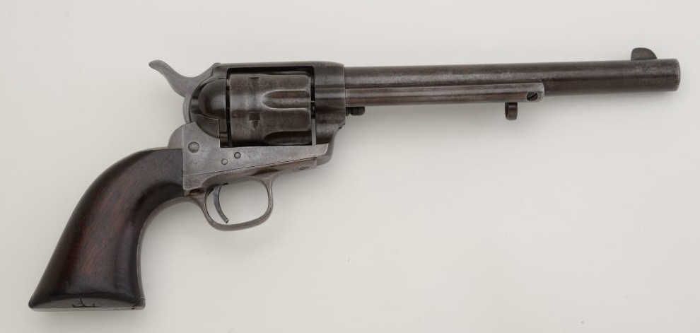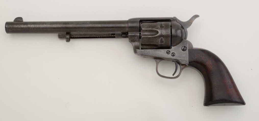 Colt SAA revolver, .45 cal., 7-1/2” barrel, wood grips, #61552. This gun is in overall very good condition showing an even dark patina on metal surfaces, all matching visible serial numbers including the barrel,good bore, action, markings and grips with an old letter “T” carved into the bottom of the right grip; traces of case color on the hammer. Est.: $1,400-$2,800.