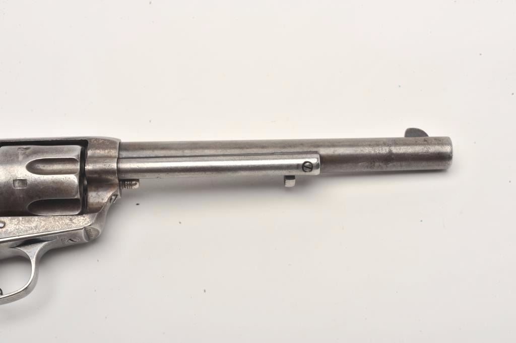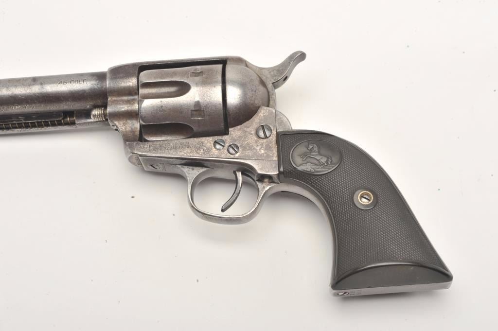 Colt SAA revolver, .45 caliber, 7.5” barrel, blued and case hardened finish, checkered hard rubber grips, S/N 136652, in overall very good condition displaying traces of original blue and case colors in protectedareas, good bore, crisp action, sharp markings and very good grips. Accompanied by a Colt factory letter confirming features (stocks “Not Listed”), shipped to J.P. Lowers Sons, Denver, CO. on November 29, 1890,forty guns in shipment. (Antique). Est.: $2,500-$5,000.