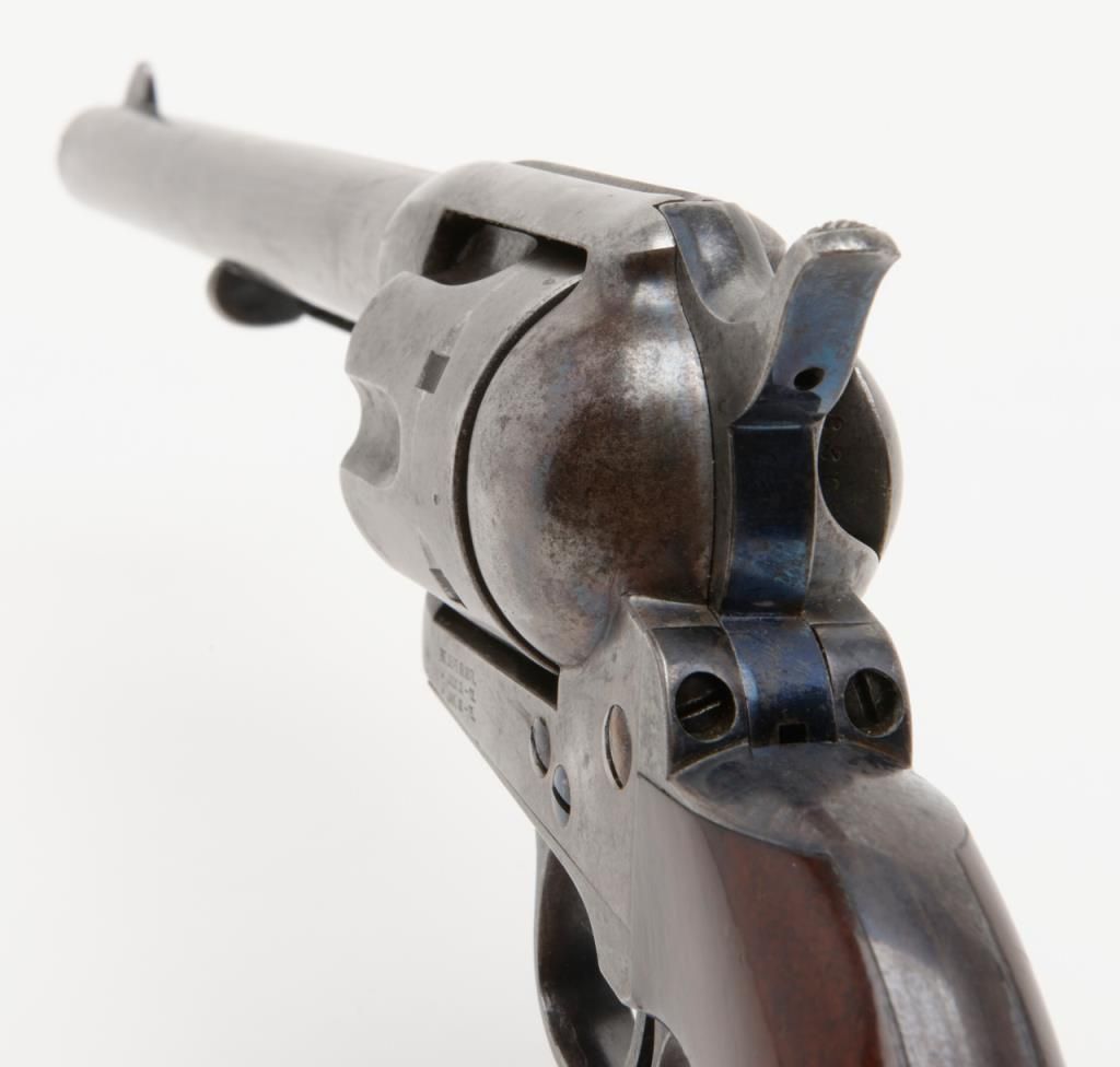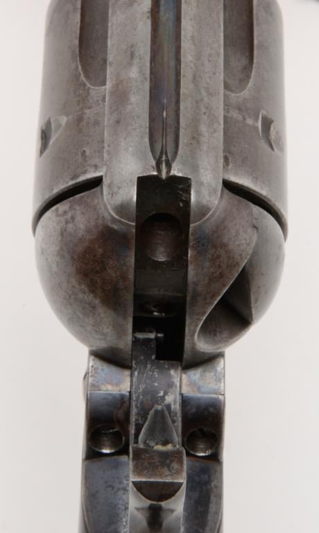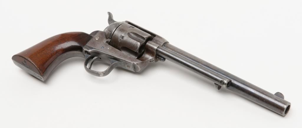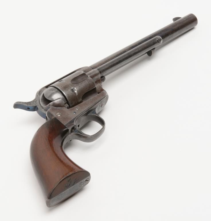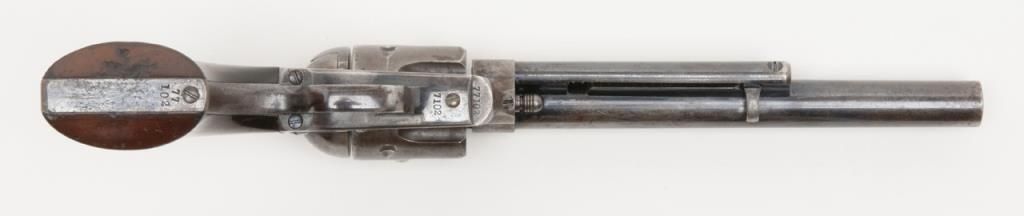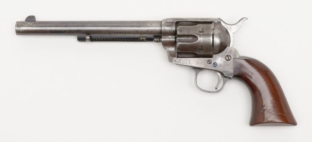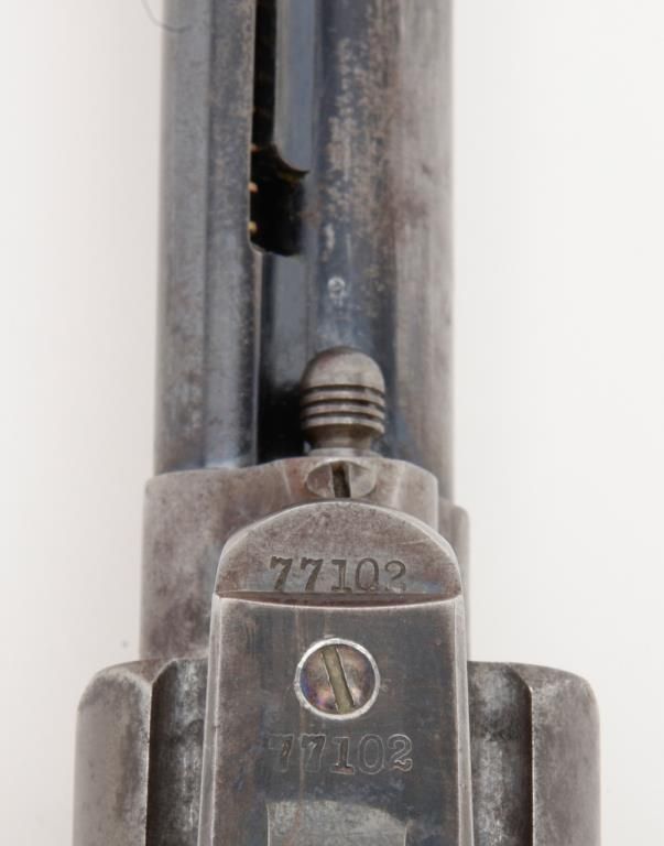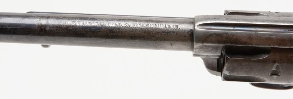 Colt SAA revolver, .455 Eley cal., 7-1/2” London address barrel, blue and case hardened finish, wood grips, #77102 with three separate factory letters dated March 16, 1979, July 2, 1985 and September 6, 2013 confirming caliber and finish,barrel length and type of stocks “Not Listed”, shipped to Colt’s London Agency, London, England on January 26, 1882, 56 guns of same type in shipment (Remark on Sept. 6, 2013 letter notes 7-1/2” barrel length was considered standard issue for that time period.). This gun is in overall very good + condition showing approx. 30% original blue finish on the barrel; approx. 55% original finish on the ejector housing, approx. 50% original finish on the trigger guard, 20% original finish on the backstrap and traces of original case colors in protected areas of the frame with the hammer gone to a silvery tone; the bore is fine, the action crisp and the markings very good including the British proofs; the grips areoverall very good to near fine with the majority of their original finish remaining; a couple mars to the left side of the grip and some knackering to the bottom of the right grip. This exact gun is pictured in Wilkersons & Hoyt’s book, The