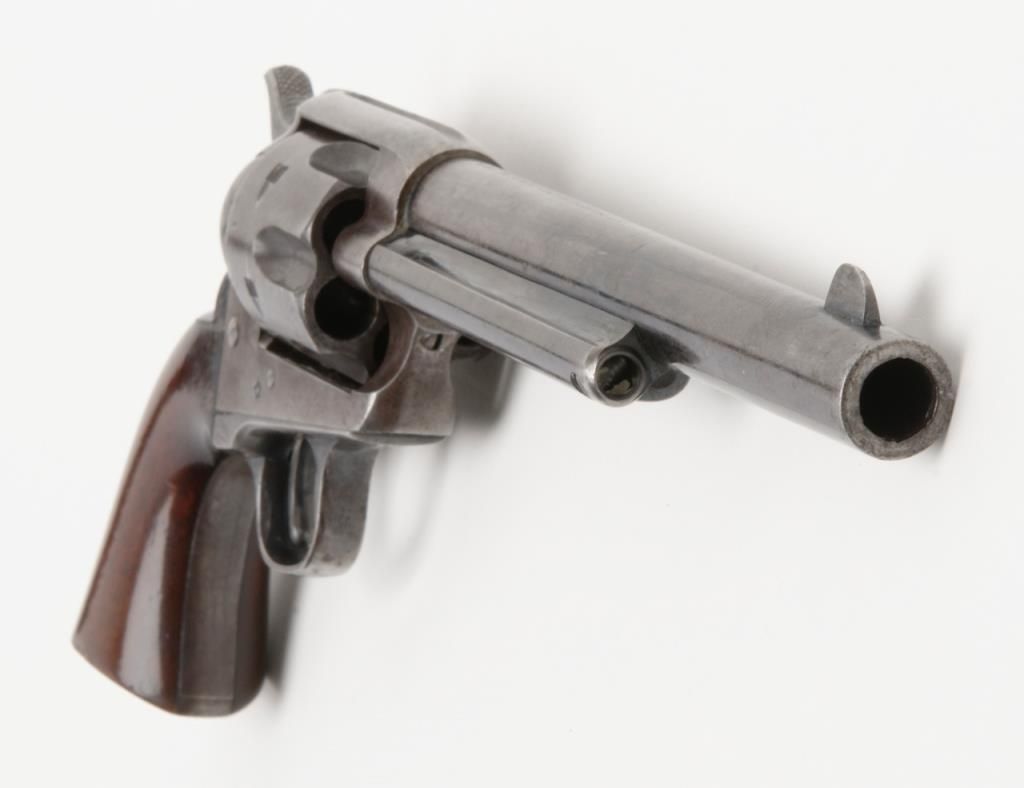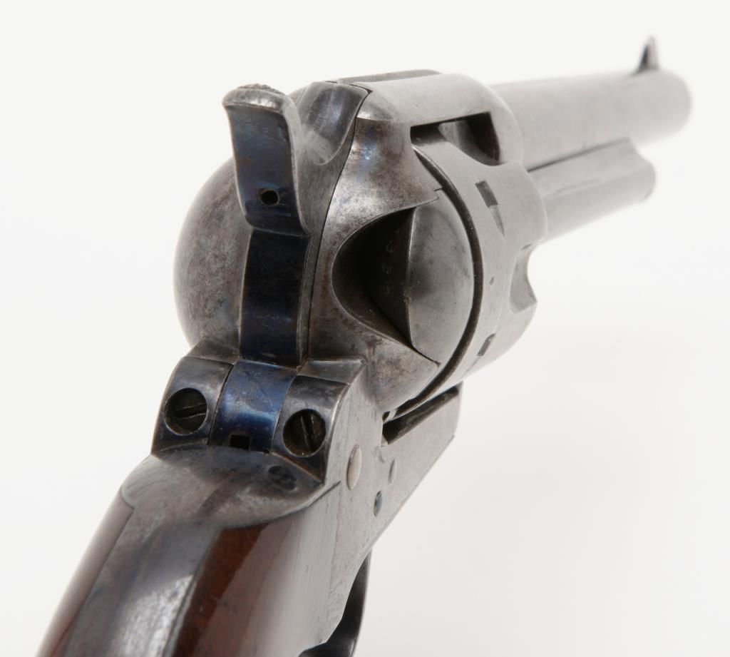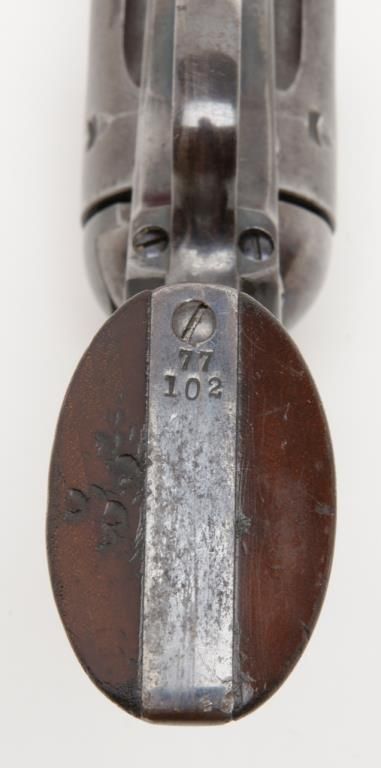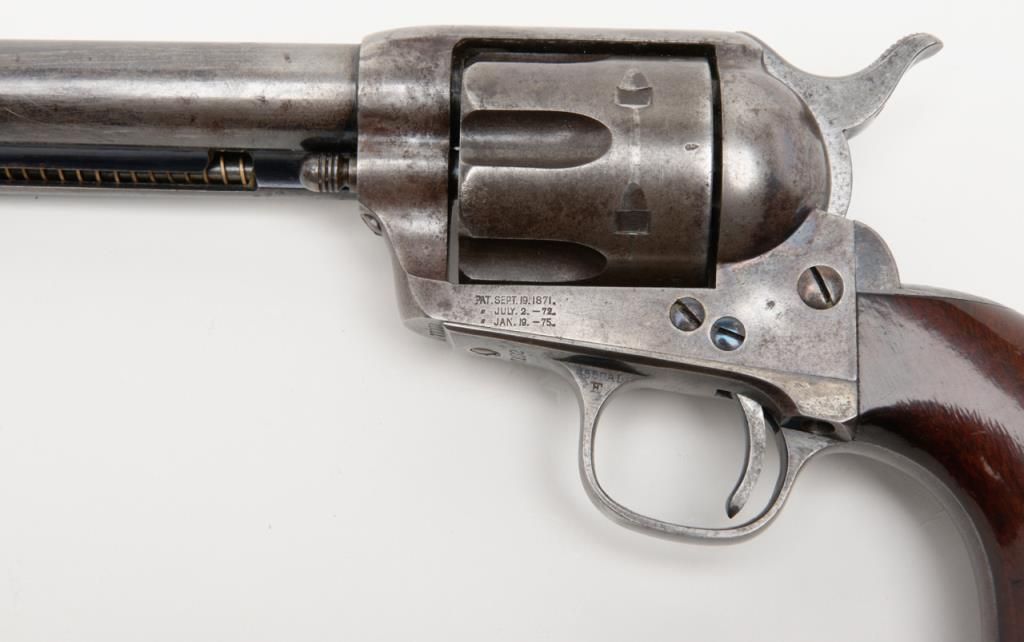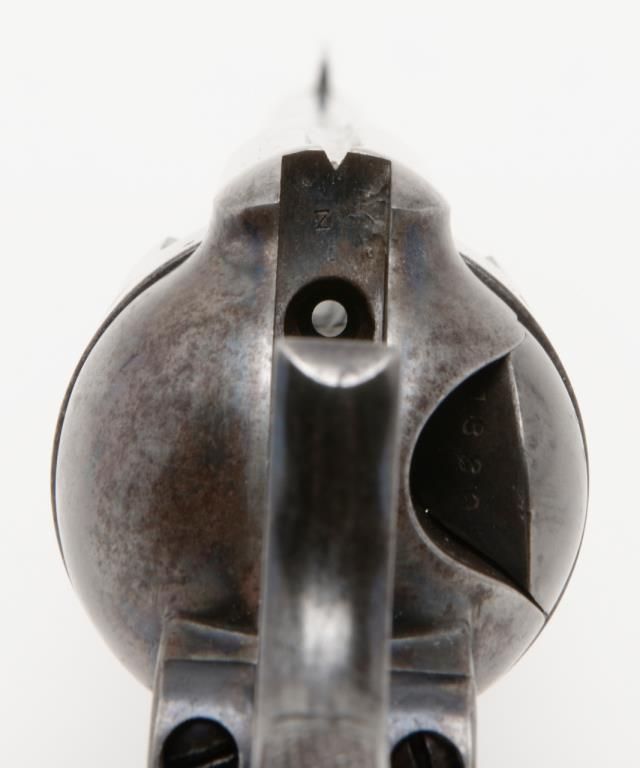 Colt SAA revolver, .455 Eley cal., 7-1/2” London address barrel, blue and case hardened finish, wood grips, #77102 with three separate factory letters dated March 16, 1979, July 2, 1985 and September 6, 2013 confirming caliber and finish,barrel length and type of stocks “Not Listed”, shipped to Colt’s London Agency, London, England on January 26, 1882, 56 guns of same type in shipment (Remark on Sept. 6, 2013 letter notes 7-1/2” barrel length was considered standard issue for that time period.). This gun is in overall very good + condition showing approx. 30% original blue finish on the barrel; approx. 55% original finish on the ejector housing, approx. 50% original finish on the trigger guard, 20% original finish on the backstrap and traces of original case colors in protected areas of the frame with the hammer gone to a silvery tone; the bore is fine, the action crisp and the markings very good including the British proofs; the grips areoverall very good to near fine with the majority of their original finish remaining; a couple mars to the left side of the grip and some knackering to the bottom of the right grip. This exact gun is pictured in Wilkersons & Hoyt’s book, The