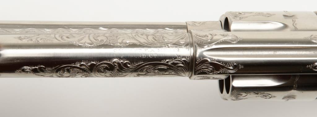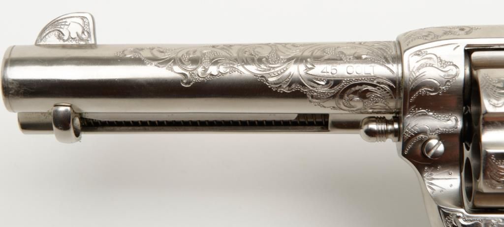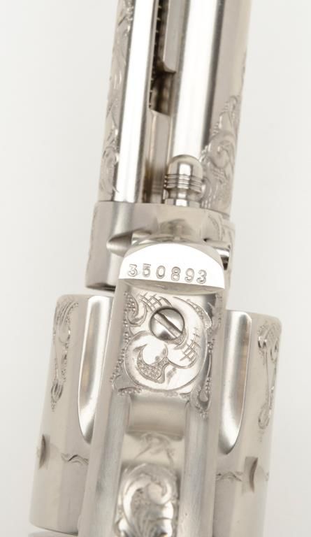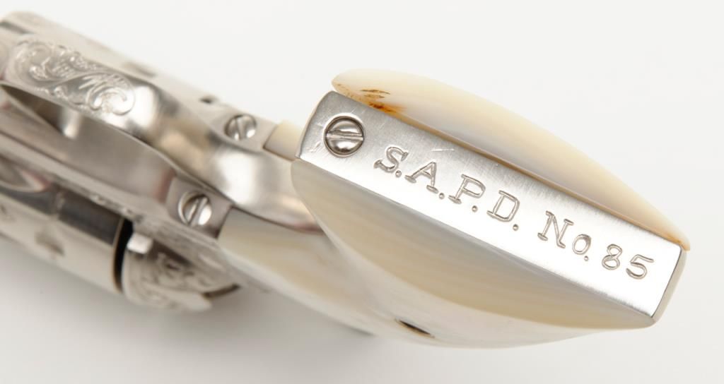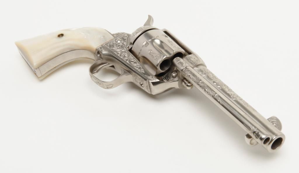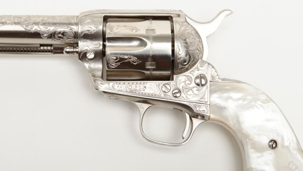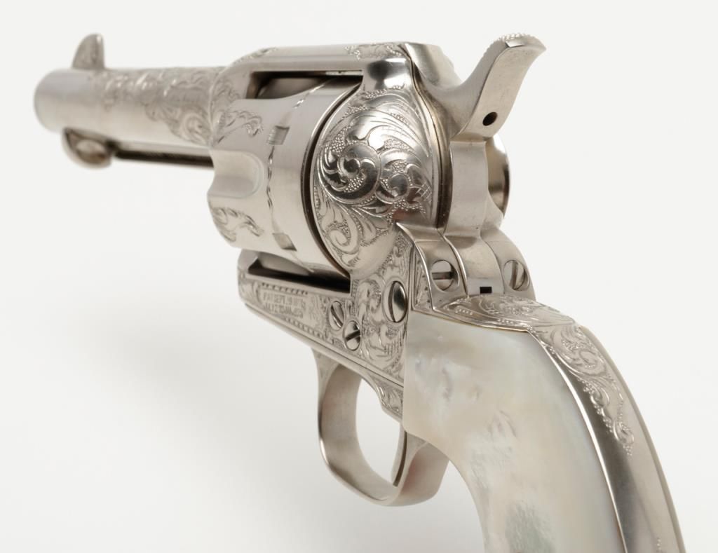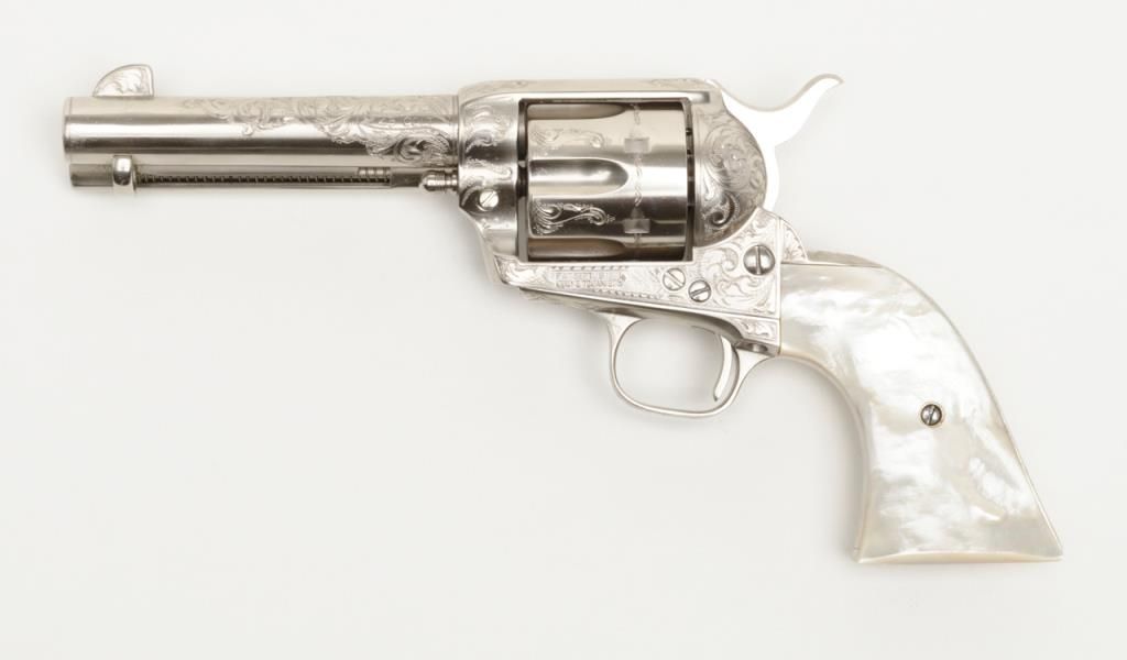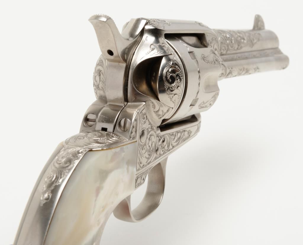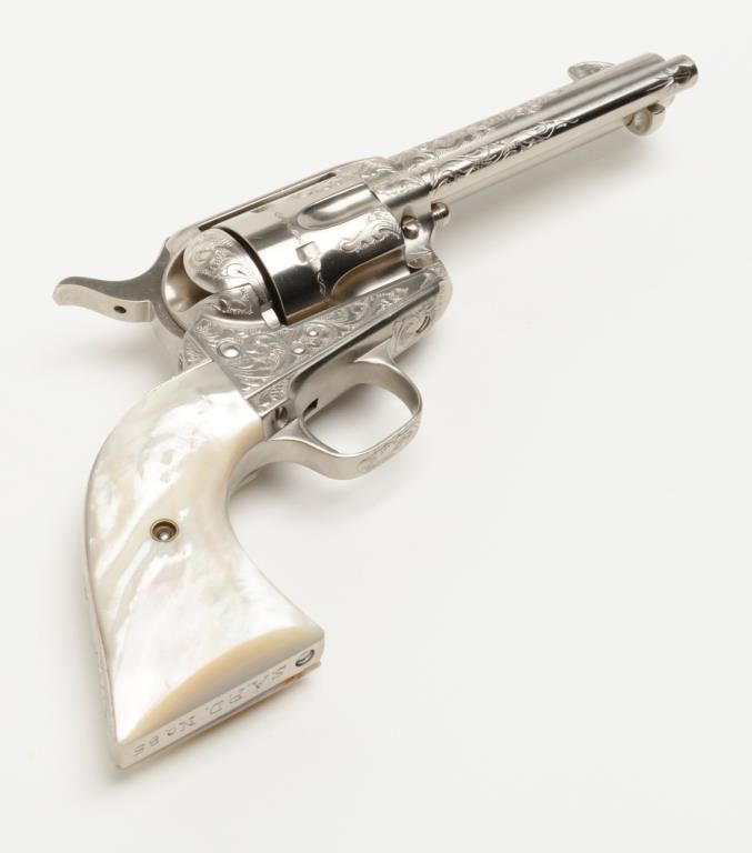 Colt SAA revolver, John Adams engraved, .45 Colt cal., 4-3/4” barrel, nickel finish, pearl grips, #350893 with factory letter confirming caliber and barrel length and indicating originally finished in blue with hard rubber grips and factoryengraved “S.A.P.D. #85” on butt, shipped to City of San Antonio Police Dept., San Antonio, Texas on Nov. 17, 1927, order #137778/50, 50 guns in shipment; revolver is in overall fine condition as restored showing beautifully executed engravingincluding “S.A.P.D. No. 85” on butt strap, near fine bore, crisp action, very good markings and fine iridescent pearl grips; also accompanied by authentication letter signed by Master firearms engraver John Adams, Sr. noting his completion of“C” coverage custom engraving and nickel finish on this gun (referenced by serial number) on Jan. 22, 2014. A beautiful work of artistry on a historic Texas firearm! (C&R). Est.: $3,500-$7,000.