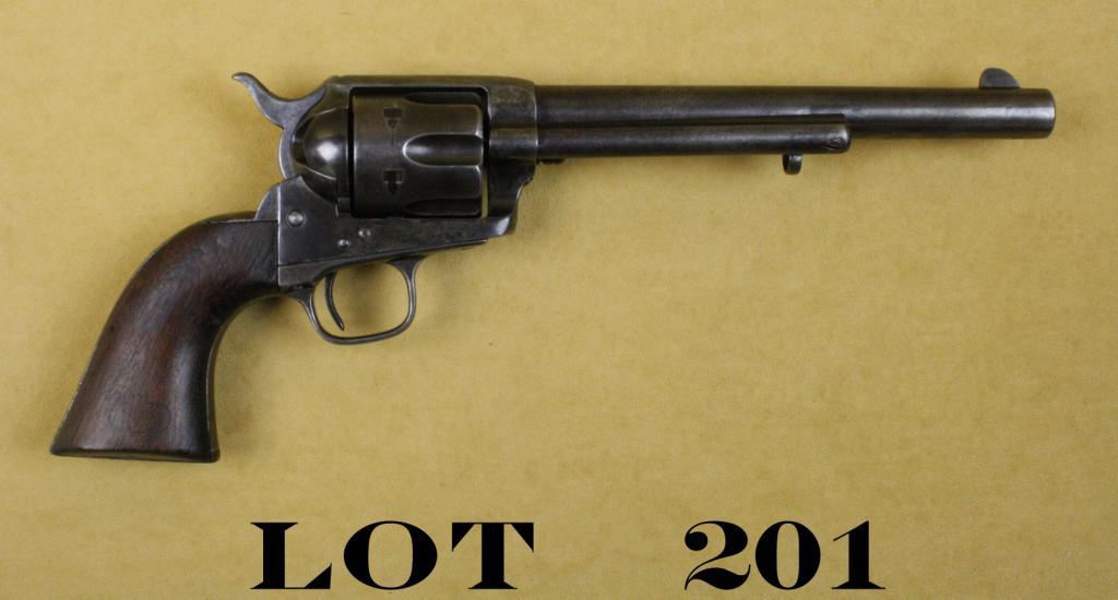 Colt SAA revolver, U.S. marked, .45 cal., 7-1/2” barrel, blue and case hardened finish, wood grips, #34196. This gun has seen restoration including lengthening of the barrel, re-stamping of some numbers andinspector initials; gun displays a gray/brown patina overall from a muted re-finish, good action, fair bore, grips are overall good with traces of inspector cartouches on both grips and the number “25” stamped on the topportion of the left grip; grips appear somewhat undersized and possibly from another Colt; accompanied by a Colt Factory Letter indicating serial number 34196 was sold and delivered to the U.S. Government Inspector at the Colt factory on January 10, 1877, one of 200 guns. Est.: $2,500-$5,000.