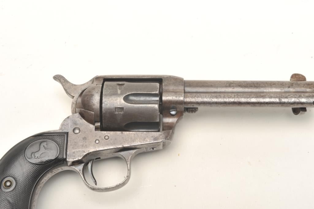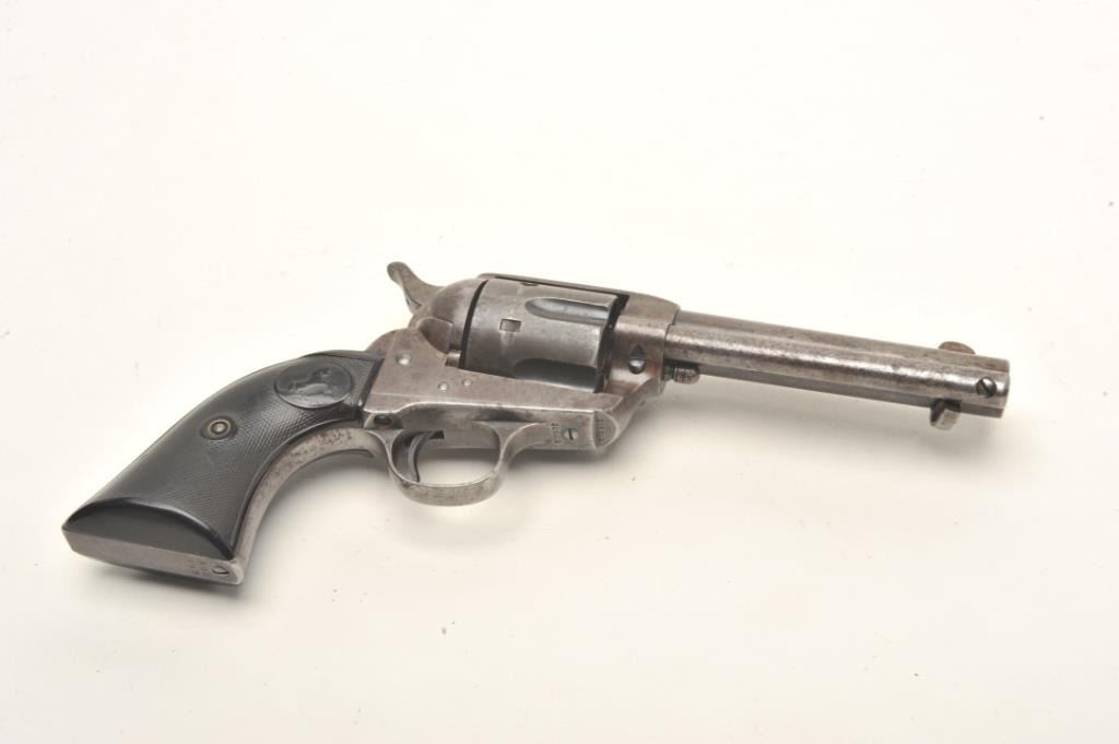Colt SAA revolver in .45 L.C. caliber with a 4 ¾” barrel, S/N 305992 and made about 1908. The pistol remains in good to very good original condition with traces of finish drifted to patina with good markings. Thegrips are good with edge wear. The action is great and the bore is fair to good. Sight has been slimmed slightly. All matching and authentic with holster marked “Hibbard”. Territorial period. (C&R/PPT) Est.:$2000-$4000