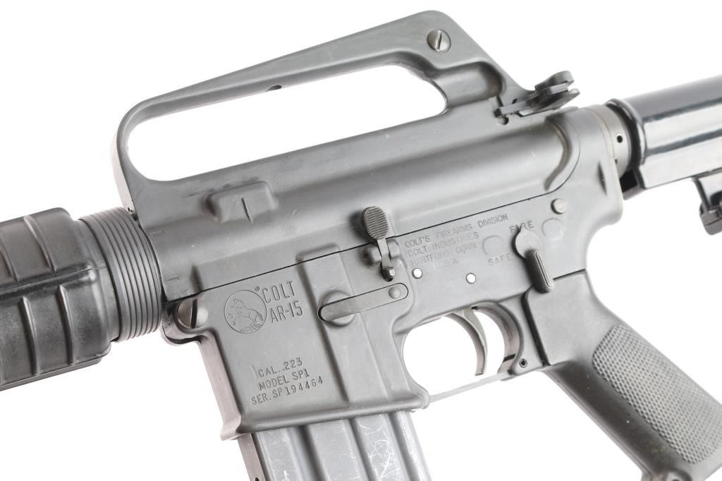 'R6001' Semiautomatic rifle manufactured circa 1985, last year of production. The R6001 SP1 Carbine is the carbine-length version of the R6000 SP1. Features parkerized finish, black plastic furniture, two position collapsing stock with slot for sling, round carbine hand guards, 16" lightweight barrel, 6 flute flash suppressor, bayonet lug, adjustable sights (front post sight with protector ears, rear L-flip peep), early "slick side" A1 type upper receiver without forward assist, spring loaded ejection port cover, early style lower receiver without fence around magazine release, dual screw style front take down pin, manual safety, sling swivel on front sight base. Barrel appears earlier 1-12 twist, hard chrome lined, marked "C MP CHROME BORE". Bore is very good condition. Overall external appearance is very good with few blemishes, retains 95% finish, with minor edge losses, scratches,Plastic furniture is very good condition with scuffs and other minor blemishes. Includes one 20 rd magazine, black nylon web sling.