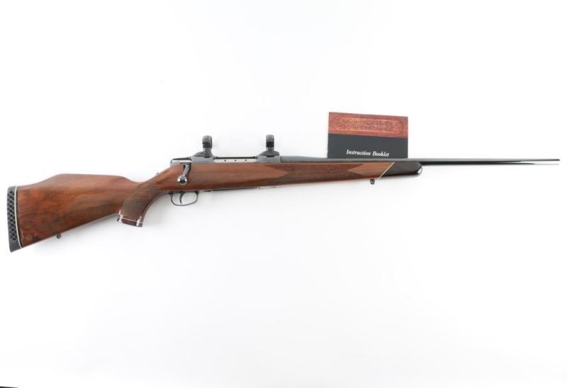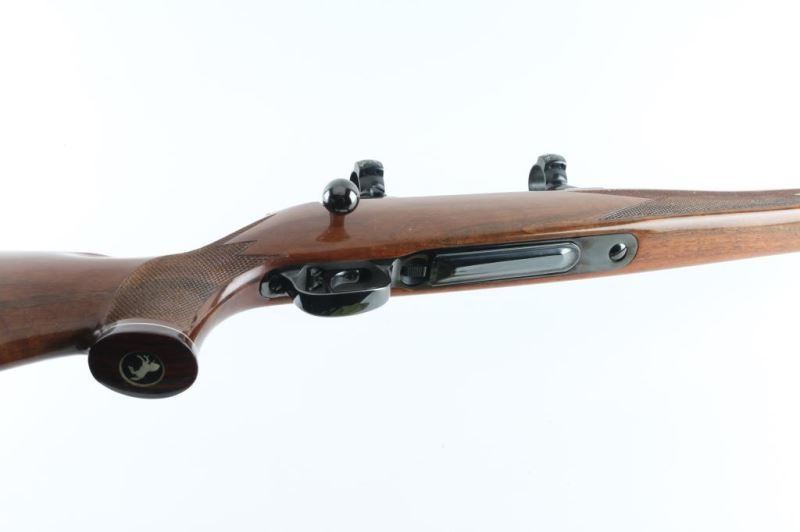 High quality bolt action sporting rifle manufactured in West Germany by J.P. Sauer & Sohn circa 1974, imported by Colt. Features a polished blued finish, 24" barrel without provisions for sights, installed bases and engraved rings (no scope provided), polished non-rotating bolt with cocked indicator, serrated trigger, factory detachable box magazine, sliding tang safety, and checkered Monte Carlo style walnut stock with forend/grip caps, swivel studs & ventilated rubber recoil pad. Bore is excellent. Retains 98% finish with few handling marks, slight edge wear. Wood is very good condition with one observed dent to right side of butt. Includes manual. Condition is NRA Excellent *** Modern Firearm *** [From the Jim Sigmon Collection]