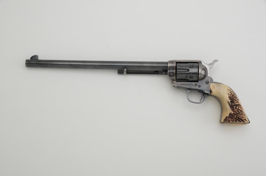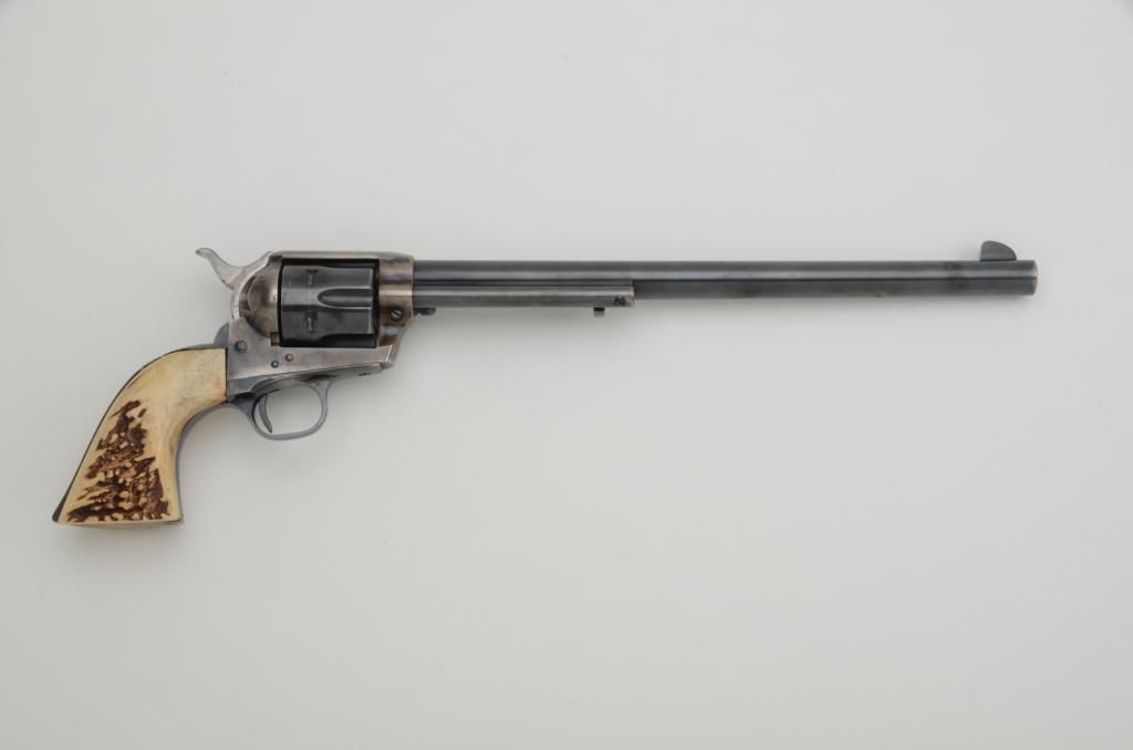 Colt Second Generation SAA Buntline Special revolver, .45 cal., 12” barrel, blue and case hardened finish, stag grips, #17125SA. This gun is in overall fine condition showing the majority of its original finish, bright bore, crisp action, sharp markings and thick stag grips that are in fine condition, slightly undersized for this gun. Est.: $1,000-$2,000.