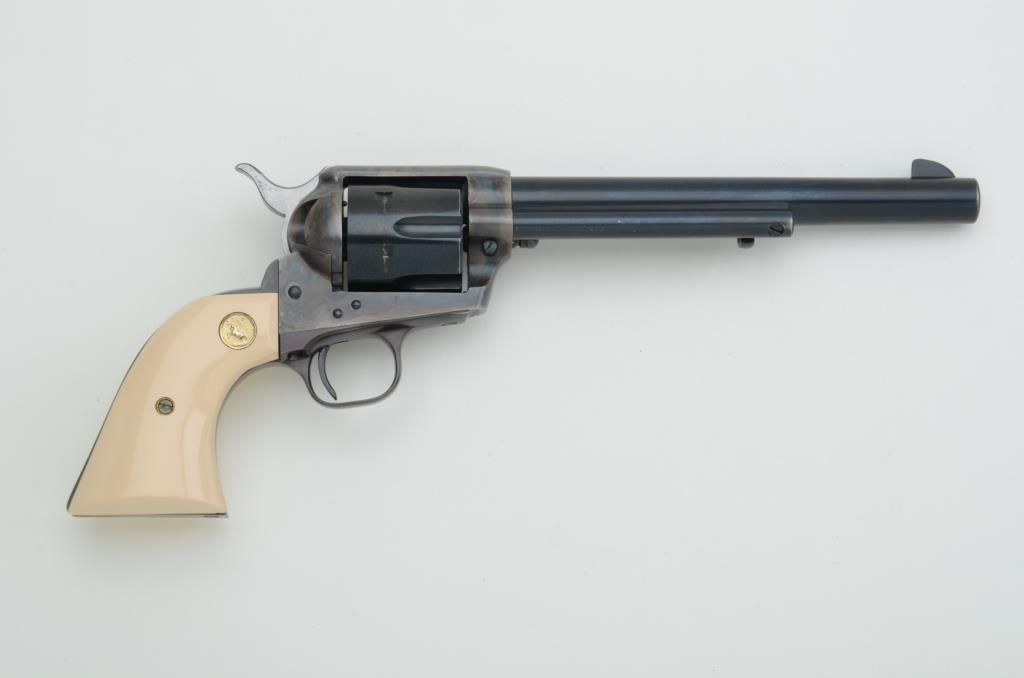 Colt Second Generation SAA revolver, .357 Magnum cal., 7-1/2” barrel, blue and case hardened finish, thick faux ivory Colt medallion grips, #69680SA. This gun is in overall excellent condition showing approx.98% original finish, mirror bright bore, crisp action, sharp markings and fine grips that are Colt, but not fitted exactly to this gun. Est.: $800-$1,600.