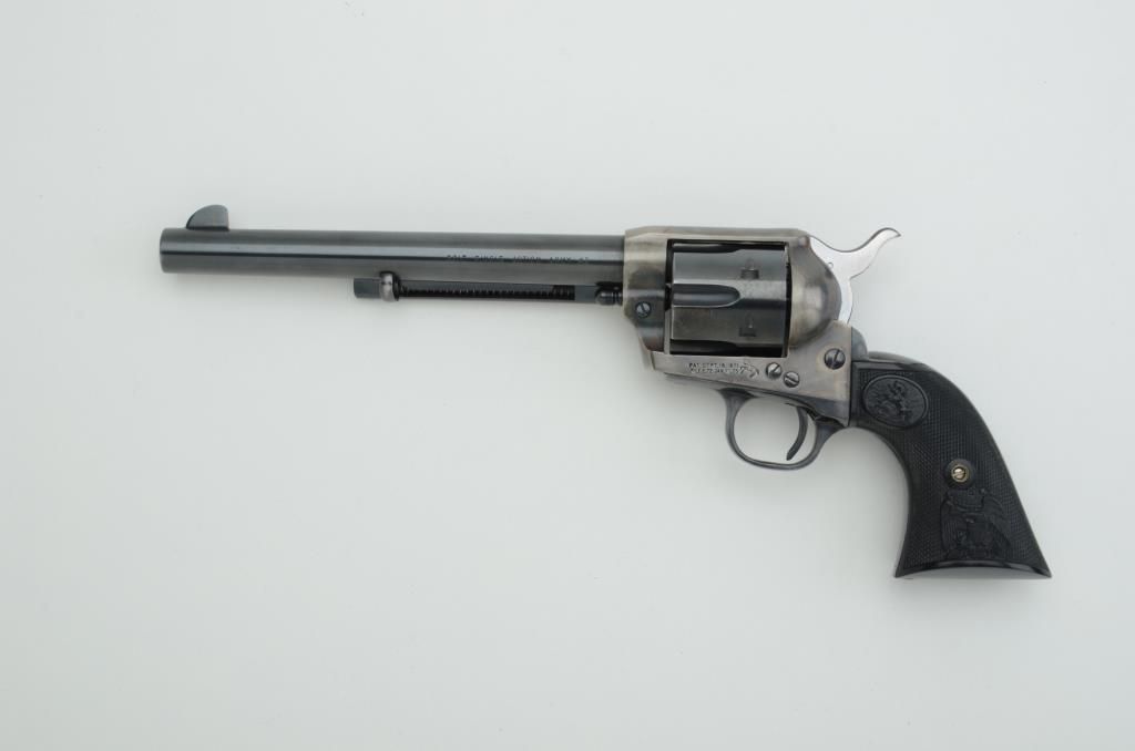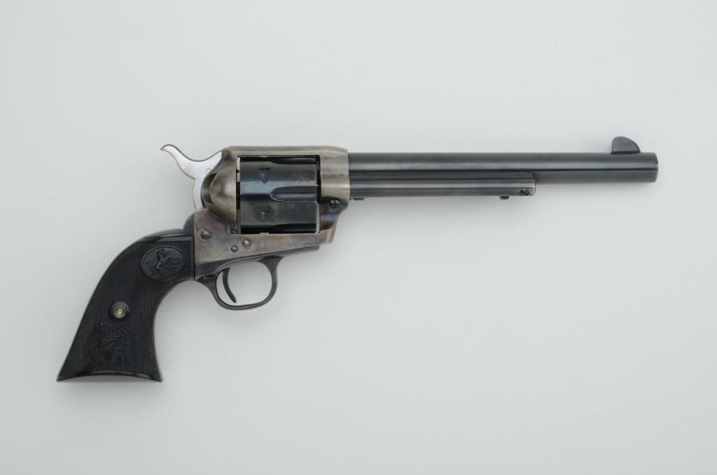 Colt Second Generation SAA revolver, .45 cal., 7-1/2” barrel, blue and case hardened finish, checkered hard rubber eagle grips, #57104SA. This gun is in overall excellent condition showing approx. 98% original blueand approx. 95% original case colors; bright bore, crisp action, sharp markings and excellent grips. Est.: $700-$1,400.