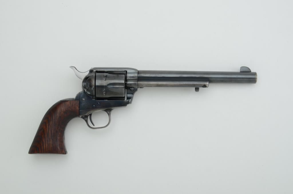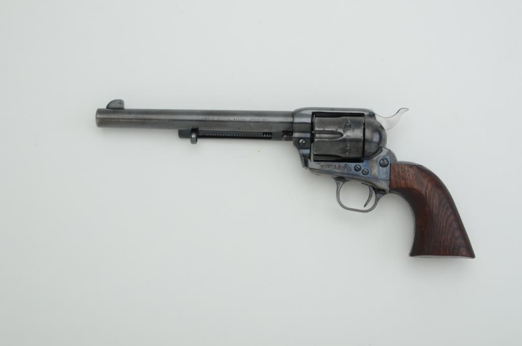 Colt Second Generation SAA revolver, .45 cal., 7-1/2” barrel, blue finish, replacement hardwood grips, #94536SA. This gun is in overall very good + condition showing considerable blue finish with holster wear to the barrel, ejector rod house, loading gate and high points; loss of finish to straps and trigger guard area; bright bore, crisp action and markings; good grips. Est.: $500-$1,000.