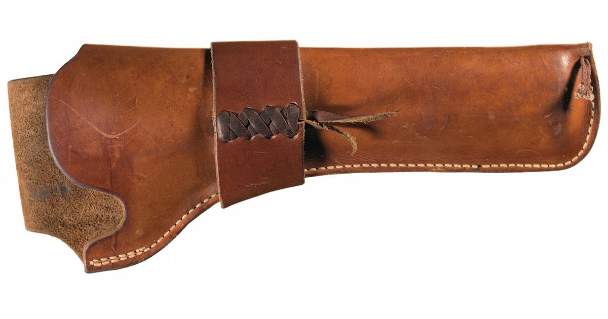 Very fine. The barrel, trigger guard and back strap retains 90% of the faded original blue finish . Faint drag line on the cylinder. The frame retains 85% of the original case colors. Minor handling marks and edge wear overall. The grips are excellent. The box is good with split corners, edge wear and some flaking. The holster is very good with some light scuffs and tight stitching.