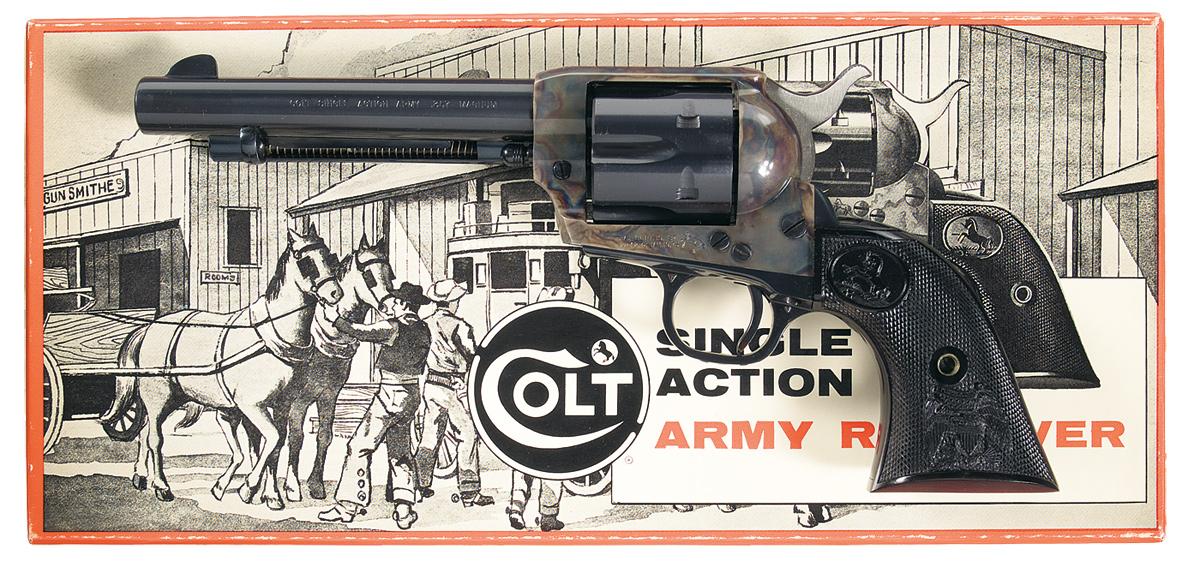 Manufactured in 1970 with standard markings. Blue barrel, grip straps and trigger guard with a casehardened frame. Fitted with black checkered "Rampant Colt/Federal Eagle" grips. Complete with stagecoach box with cardboard sleeve.