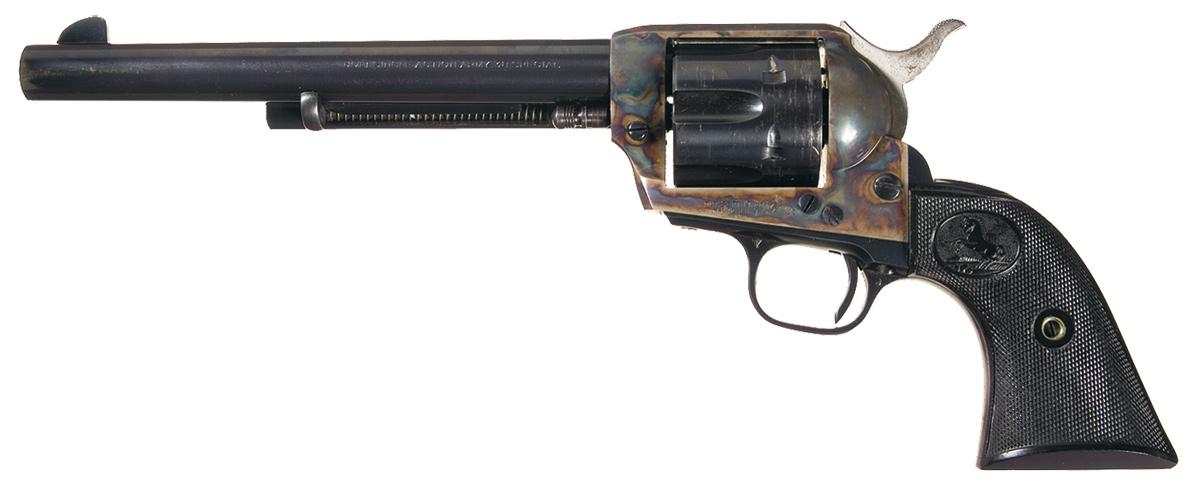 Manufactured in 1957, the second year of post war production. Fixed sights, with the one line Hartford address on top of the barrel and "COLT SINGLE ACTION ARMY .38 SPECIAL" on the left side. The left side of the frame is marked with the two line, three dates patent markings followed by the Rampant Colt. Matching serial number on the bottom of the frame and left side of the front strap and backstrap under the grip. Fitted with plastic checkered two piece grips with the Rampant Colt in an oval at the top.