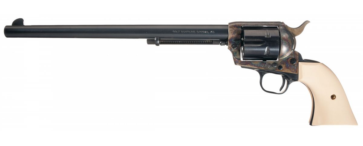 Condition: Excellent. The revolver retains 99% plus of the original blue and casehardened finish with a light drag line and cycling scratches on the cylinder. The grips are a bit oversized and in excellent condition. Mechanically excellent.