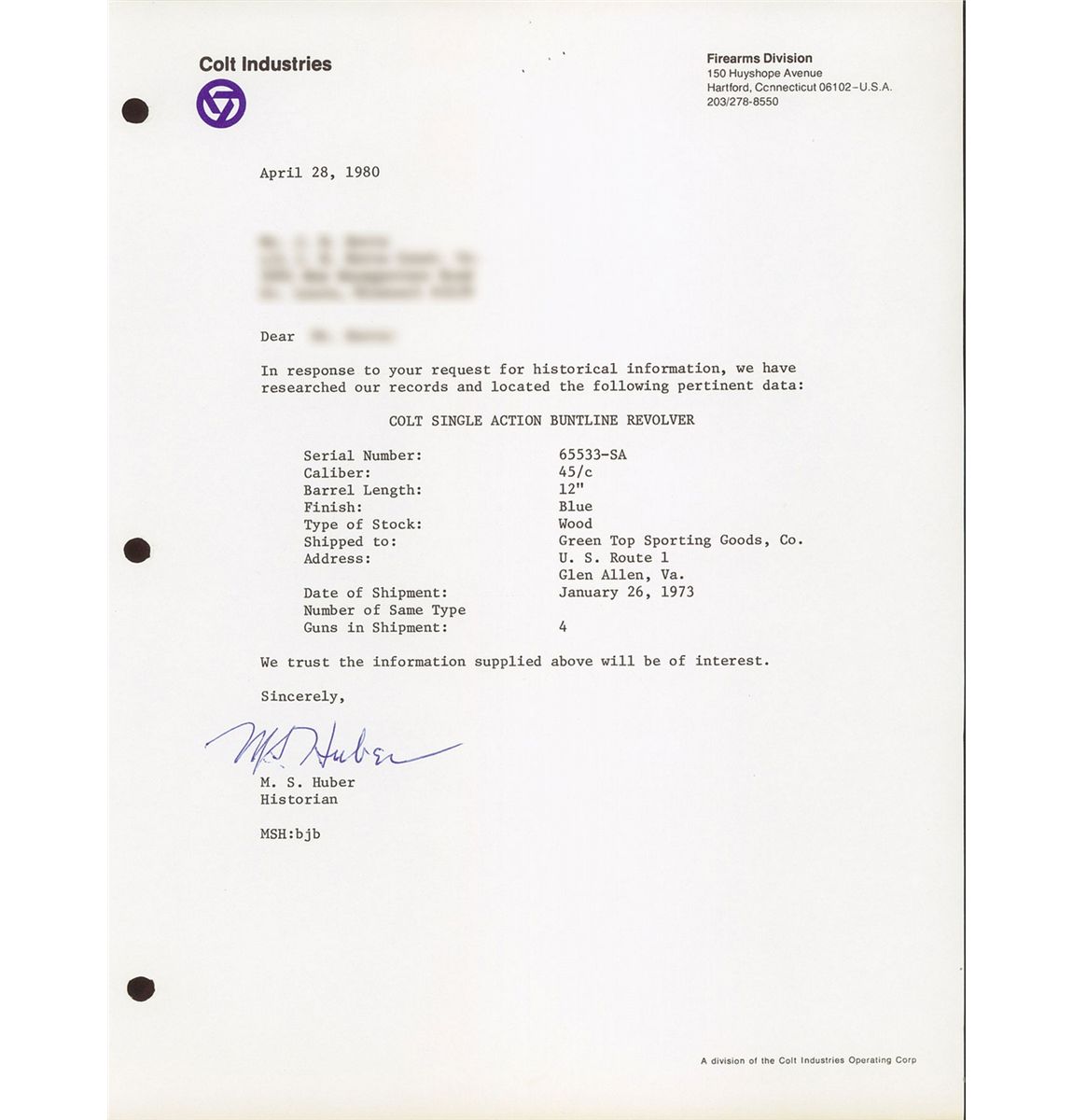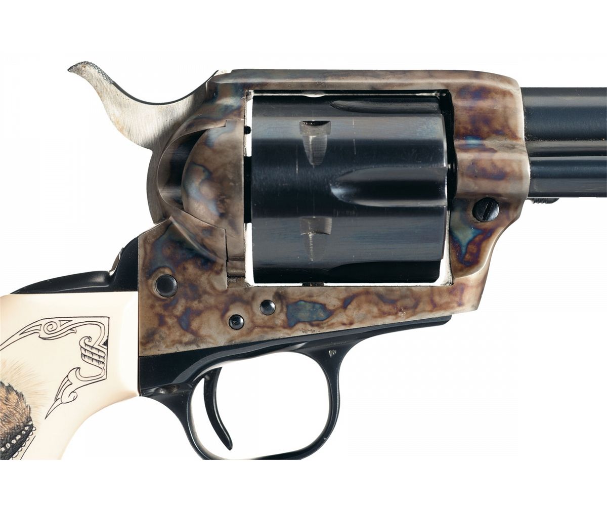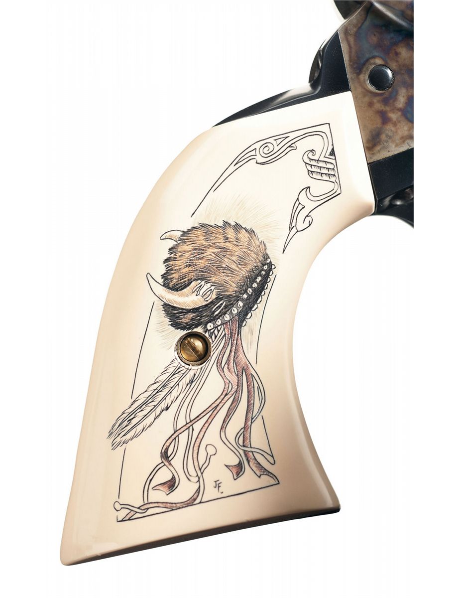 Manufactured 1973. Standard markings and features. Matching serial numbers on the frame and left side of grip straps under the grip. Fitted with smooth plastic grips with a scrimshaw buffalo headdress on the right grip. The accompanying factory letter confirms the serial number, caliber, barrel length, wood grips and blue finish. The revolver was shipped on January 26,1973 to Green Tree Sporting Goods, U.S. Route 1, Glen Allen, VA.