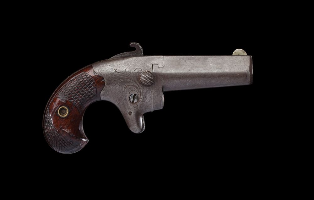 British proofed, as most center fires were, shipped to London. Iron frame is marked correctly for the rare caliber. Smooth surfaces have turned plum, excellent checkered wood grips. Serial #8006.