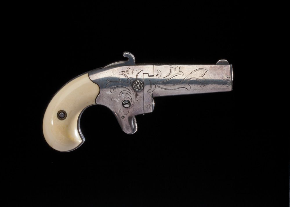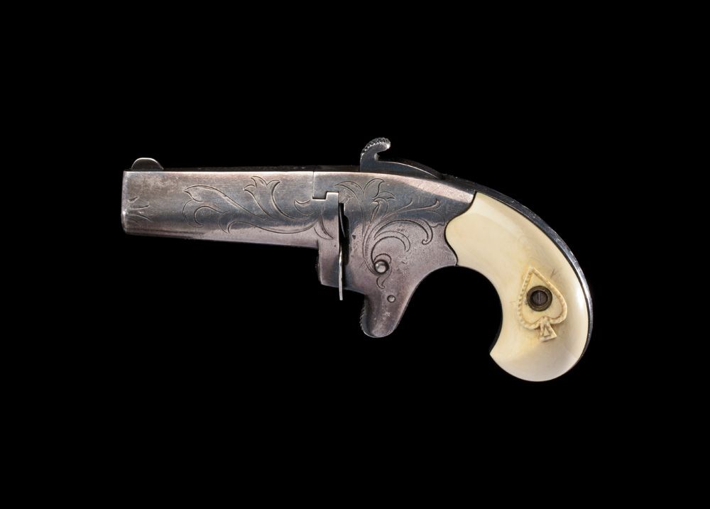 .41 cal RF, Serial #5833, no loading notch, factory floral engraving extends to the barrel. 95% silver wash on frame and barrel, card suits engraved on the backstrap. Ivory grips with raised carved spade show age and fit well, no numbers on the grips. VG bore.
