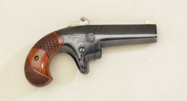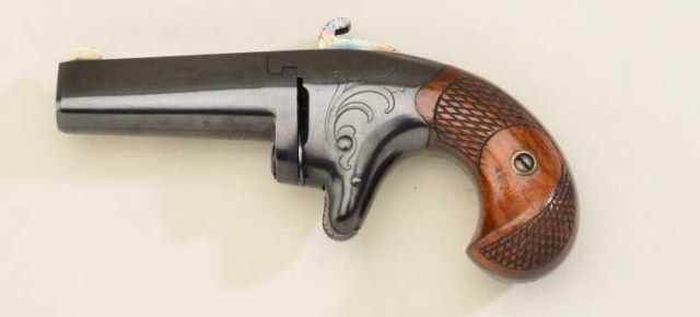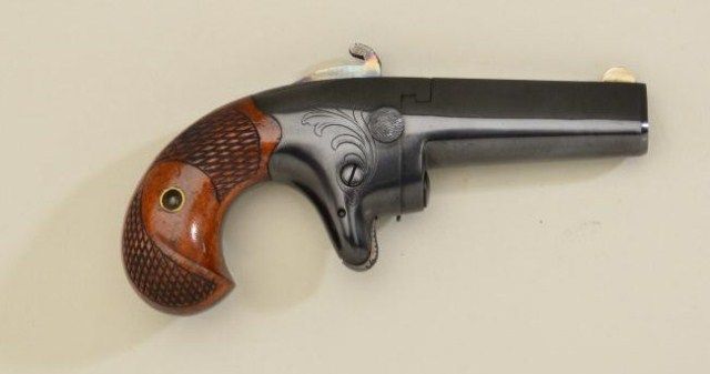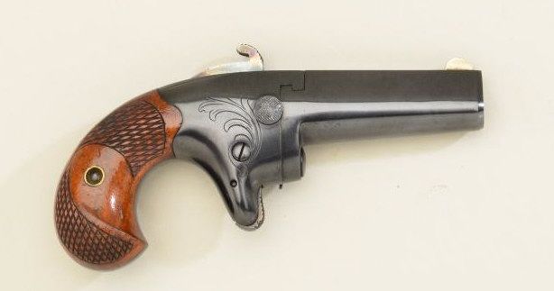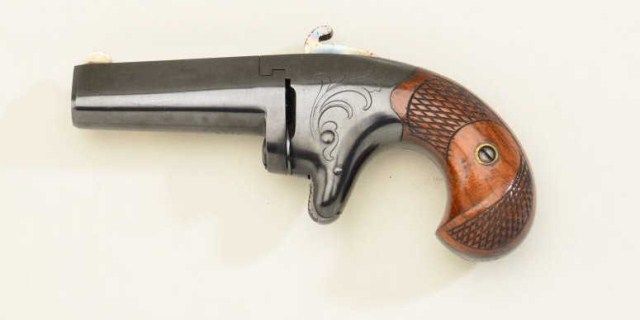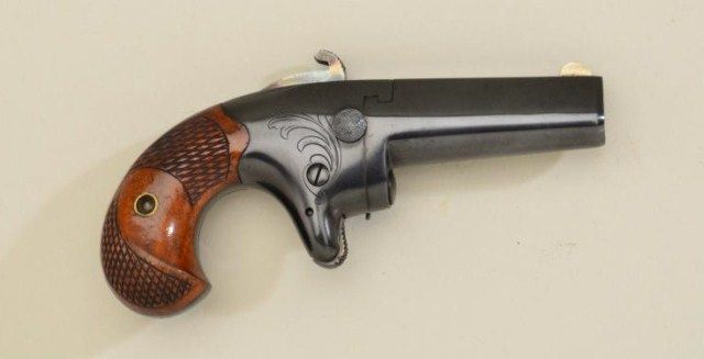 Colt Second Model derringer, .41 cal., 2-1/2” barrel, quality re-blue finish, checkered wood grips, #6372. This gun is in overall very good condition as re-finished showing the majority of that blue, crisp action, very good markings, good bore with some scattered light pitting; fine grips. Est.: $500-$1,000.