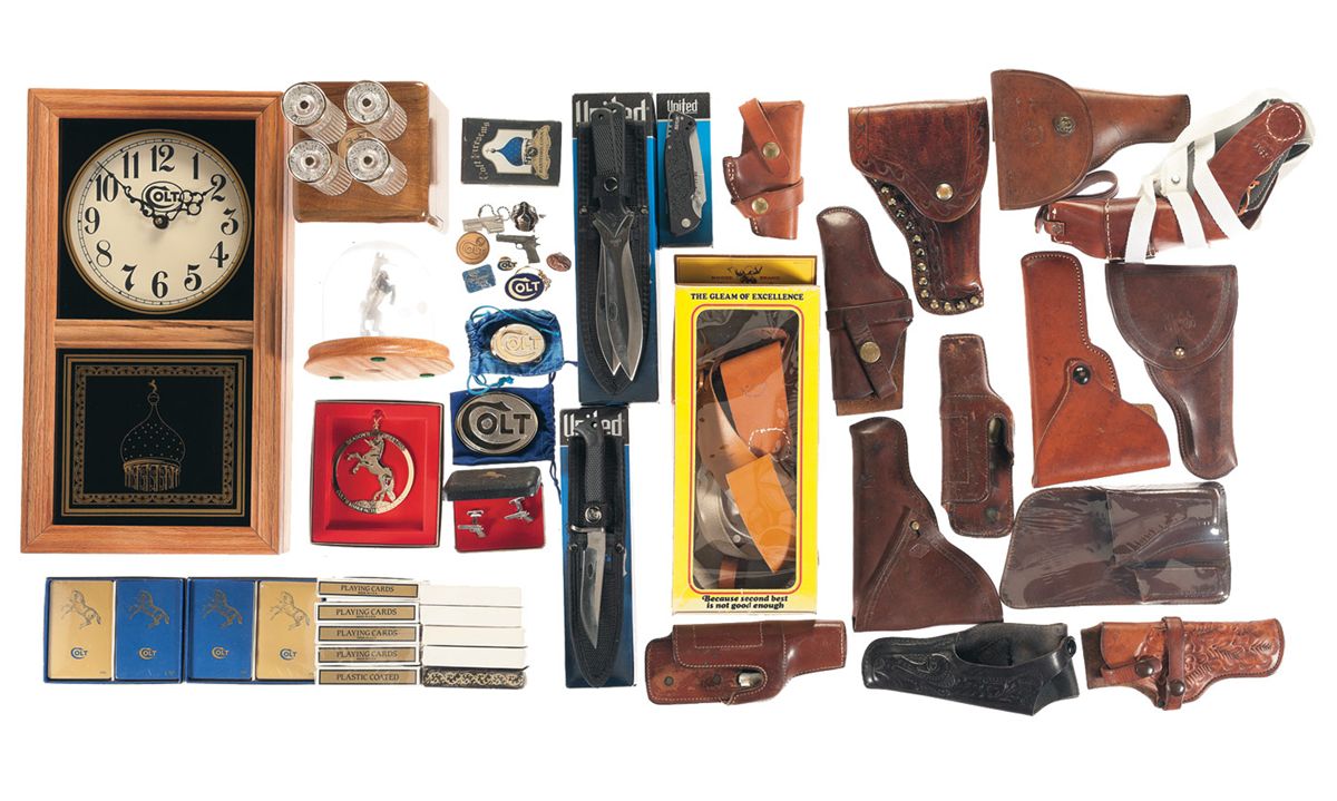 All holsters are leather and are for mostly Colt Model 1903 and 1908 pistols. Includes Black Sheep Brand, Abercrombie & Fitch (2x), Audley (2x), unmarked, Brauer Brothers (4x), Heiser (2x), Biffar, V.L.&A. Overall in very good to better condition. 1 4" tall Rampant Colt statue on a wood base with glass dome, 1 set of 4 gold accented Colt shot glasses that look like shotgun shells in a hinged wooden case, 8 unopened decks of Colt cards, 4 unopened decks of cards in boxes, 3 opened decks of Colt cards, 1992 Colt Safety Committee style clock with black Colt logo, 1 Francolini sterling silver pin, 1 set of silver 1911 cufflinks in case, 1 Colt Thrower Combo knives in box with sheath, 1 Trailscout Hunter knife with box and sheath, 1 Colt AR15K knife with box, 1 copper Colt pin, 1 Colt military style folding can opener, 1 small gold belt buckle, 1 large gold belt buckle, 1 Colt Christmas tree ornament in box, 1 small metal 1911 trinket, 1 Colt keychain, 1 Colt medallion and 2 small Colt pins.