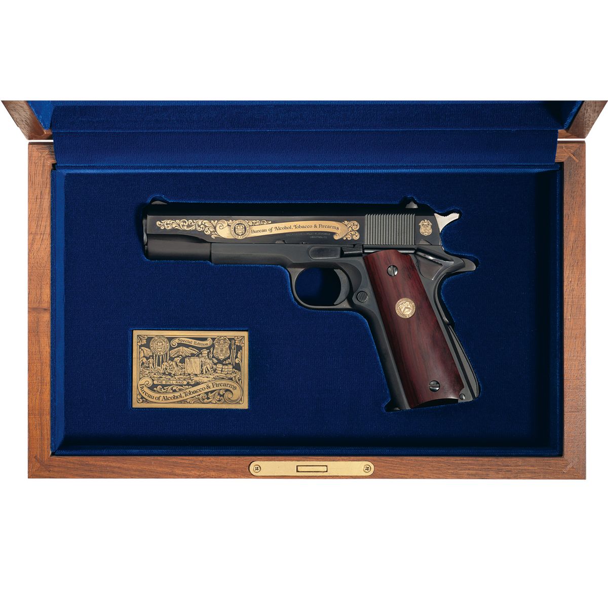 Standard markings and features of the ATF commemorative pistol. Complete with original Colt "wood grain" box numbered to gun and commemorative display case lined with blue velvet.