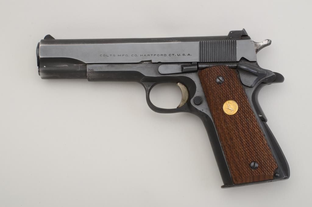 Colt Series 70 semi-auto pistol with Colt conversion unit, .22LR cal., 4-3/4” barrel, blue finish, checkered wood medallion grips, #17397G70. This gun is in overall very good to fine condition as converted showing themajority of its original finish with high point wear and some spots of pitting on the frame, very good bore, crisp action, sharp markings and fine grips. From an old estate. Est.: $325-$650.