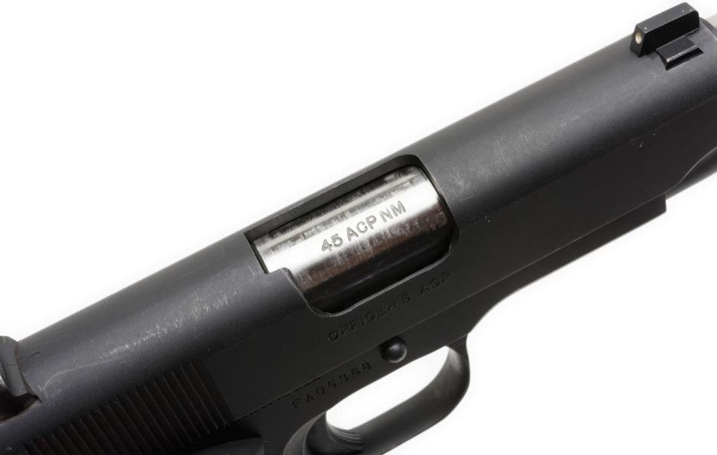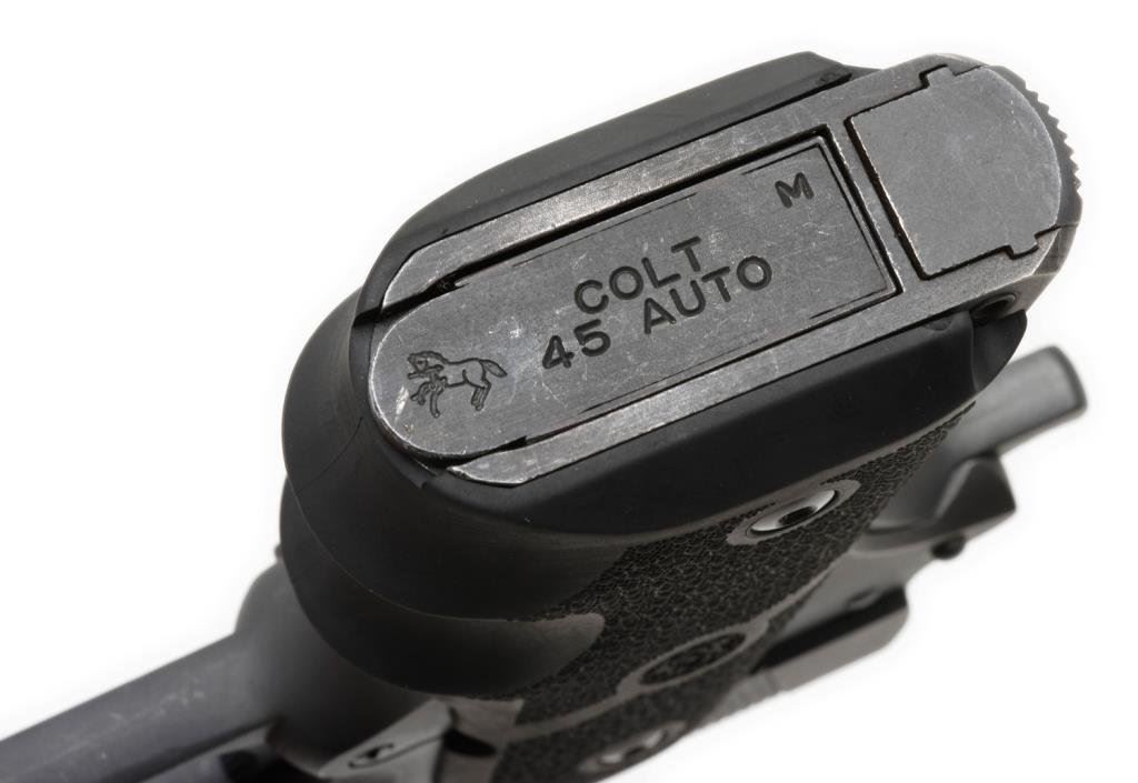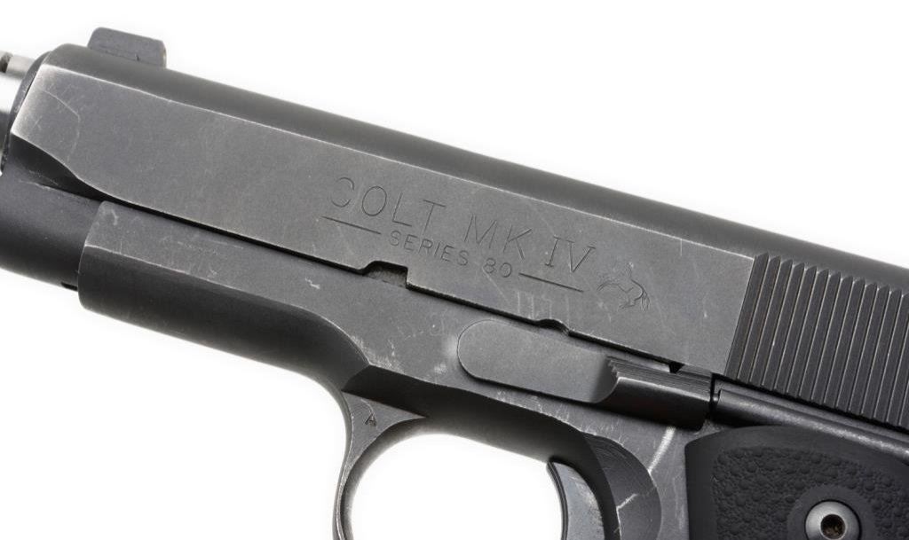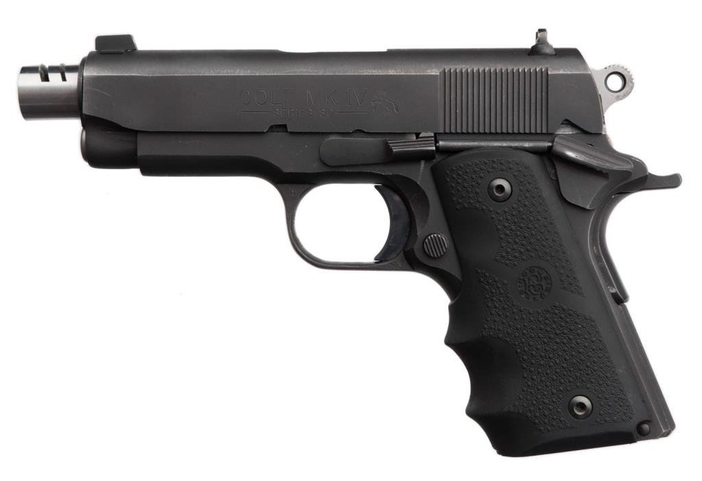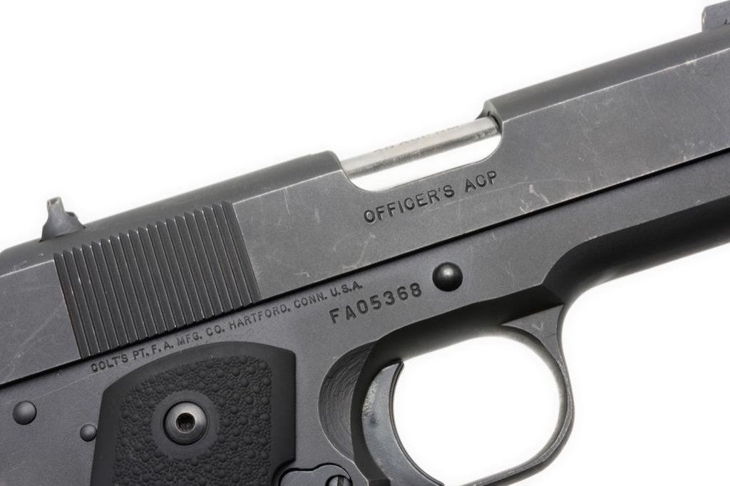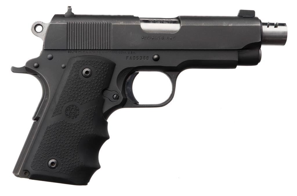 Colt Series 80 MK IV Officer’s Model, semi-automatic pistol, .45 ACP caliber, serial #FA05368. The pistol is in overall very good condition with a 4 3/8” ported barrel. The pistol retains nearly all of its blued finish with edge wear and loss of finish at the muzzle. The Hogue finger-grooved rubber grips are in very good condition showing little use. The bore is very good, action crisp and markings sharp on this nice Officer’s Model. The pistol comes with one Colt marked magazine. Est.: $400-$800.