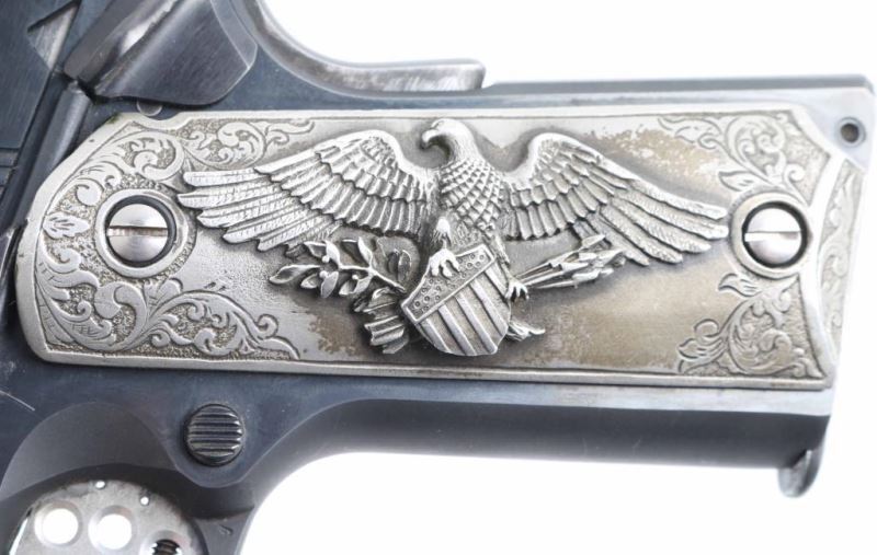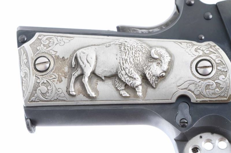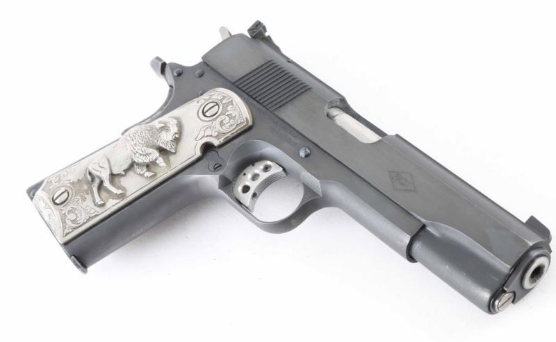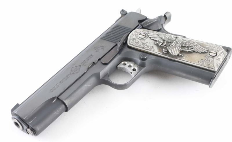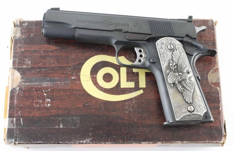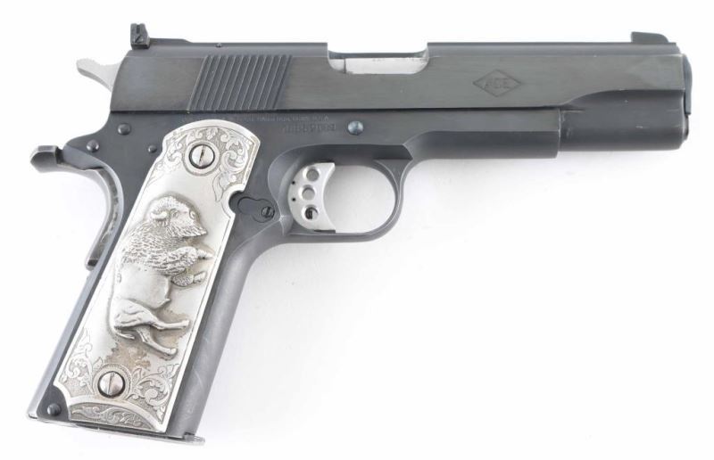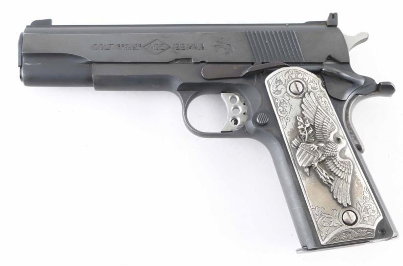 Pistol. Semi-Automatic. 10-rd magazine. Manufactured 1983. (Government model MK IV/Ace) Designed to allow inexpensive practice while maintaining the feel of a 1911. 5" barrel. Blade/ adjustable notch sights. Grip, frame mounted thumb safeties. Smooth, straight mainspring housing. Skeletonized trigger with adjustable stop. Left slide marked "Colt Service Model Ace in diamond .22 Long Rifle". Right slide marked with "Ace" in diamond. This pistol has what appears to be Pewter (?) grips with floral designs. The left panel has the American Eagle clutching shield/arrows. The right panel has a Buffalo/Bison. Grips are somewhat tarnished. Blued finish is about 97% with some slight edge wear/scratches. Slide action is smooth/tight. Bore appears excellent/bright. One magazine "Colt Cal. 22 L.R." Mag has cosmoline in it, and needs to be cleaned. Comes in the original Colt wood grain factory box with manual/paperwork. Box has some tears/scuffs. NRA condition-Very good. Modern firearm.