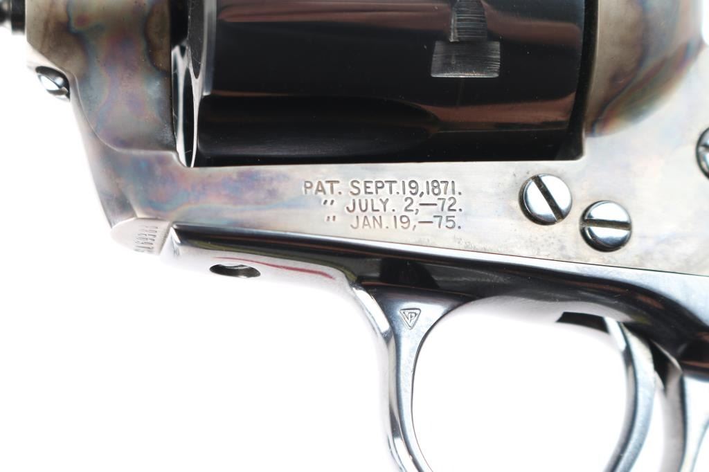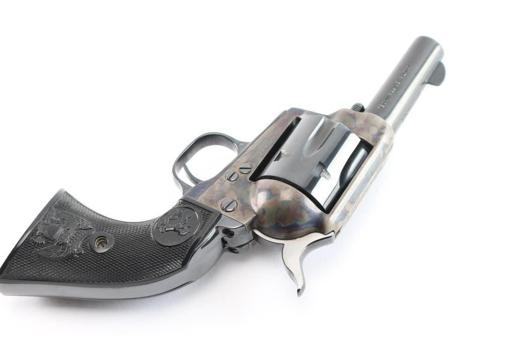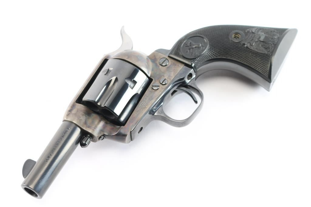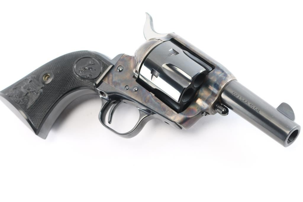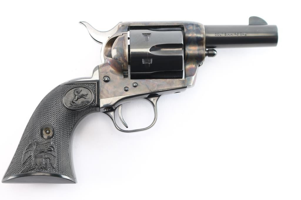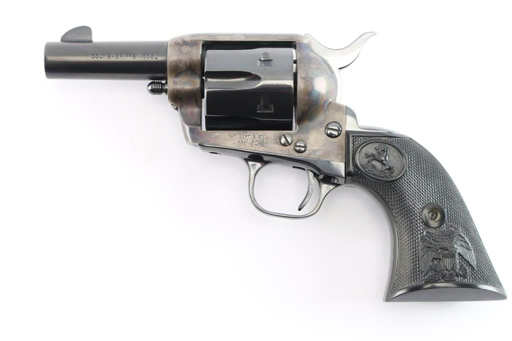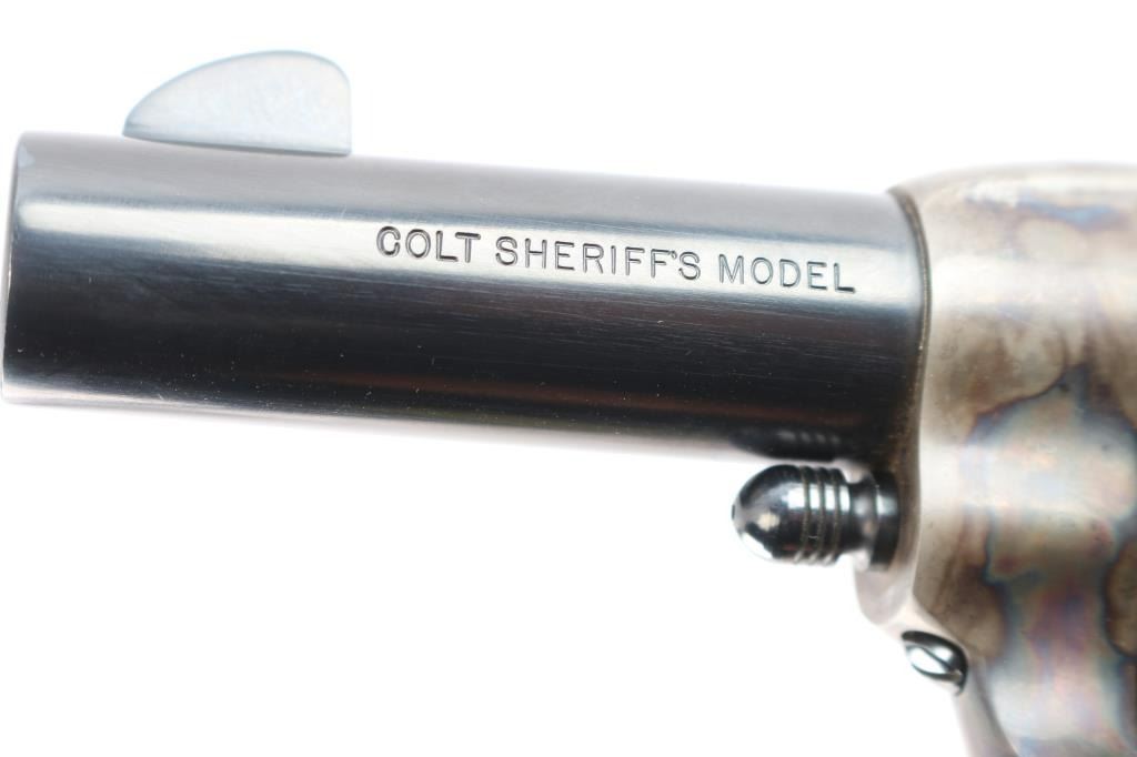 'Third Generation' Sheriffs Model, a beautiful American made ejector-less short barreled single action revolver chambered in .45 Long Colt, manufactured circa 1985 in Hartford, CT. The 'Third Generation' Sheriff's Models were produced from 1980-1985. Featuring a high polish blued finish, 3" barrel with two-line address on the top, blade front sight, notched frame rear sight, smooth curved thin trigger, two-toned hammer, checkered hammer spur, fluted six-shot cylinder, collard cylinder pin head, color-case hardened frame, smooth grip straps, and two-piece checkered black hard rubber grips with the rampant horse and spread eagle. Frame is color-case hardened with the rest of the pistol having a blued finish. Revolver exhibits approximately 99% of it's original color-case finish showing nothing remarkable. The blued finish is also excellent with only a few superficial scratches, and some along the right side of the barrel. Action is smooth and crisp with a tight fit. The bore is bright with strong rifling, and the cylinder chambers are also excellent. Hard rubber grips are excellent.