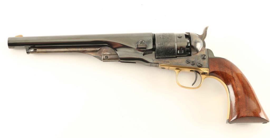 SN: 214774 'Third Generation' Single action percussion revolver chambered for .44 caliber ammunition, manufactured circa 1994-2002 Features a blued & case hardened finish, 8" barrel, brass blade front sight, 'v' notch rear sight cut in the hammer lip, smooth thin trigger, knurled hammer spur, non-fluted six shot cylinder with roll stamped naval engagement scene, loading lever, brass triggerguard, provisions for a shoulder stock, Sam Colt's signature engraved on the backstrap and one-piece varnished walnut grip. Includes a factory one-piece grey cardboard box. Revolver exhibits approximately 95% of it's original finish showing scattered light scratches, some muzzle wear and wear on the front cylinder face from rubbing on the barrel. Action is crisp, the bore is excellent and the wood grip is Very Good. Condition is NRA Very Good++. ***Modern Firearm***