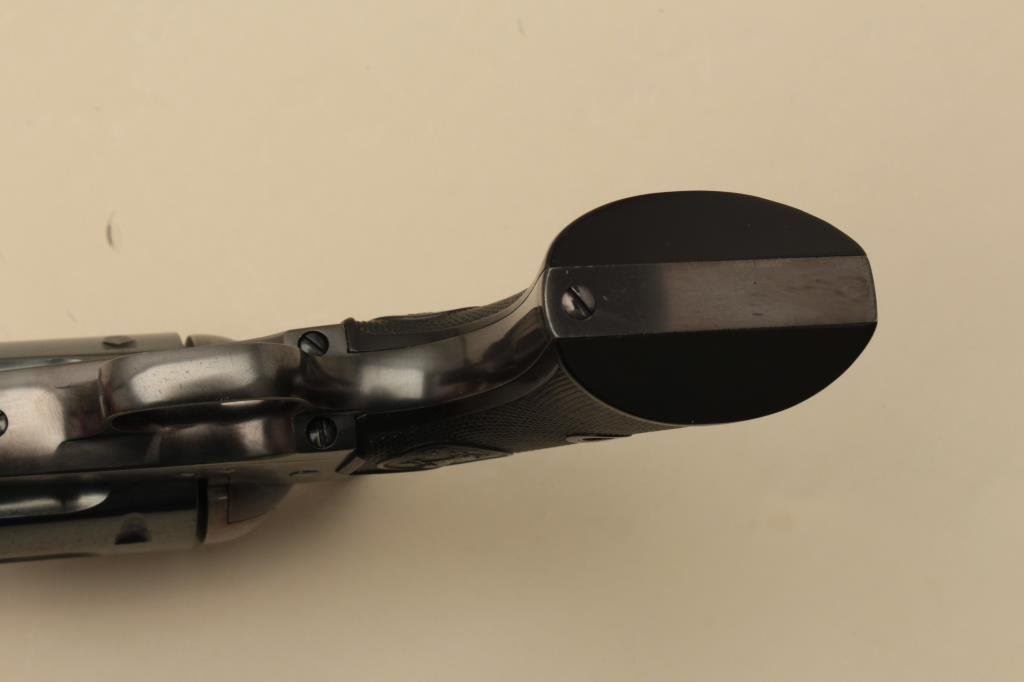 with a 4 ¾” barrel in fine original condition, S/N 340645. Factory letter confirms caliber and configuration. Shipped to “Shapleigh Hardware, St. Louis, MO, Nov. 20, 1920, 12 guns in shipment”. The revolver retains 955-98% original blue with shark fin (Late and proper) front sight of full height. The cylinder shows very light index line. The frame shows 80%-90% original case colors just toning slightly. The hammer shows 90%-95% bright and fiery case. The grips are excellent. Proper last 2 digits on the cylinder and matching beneath the grips on the straps. A 9+ on a 42745 scale and collector’s quality. (C&R/PPT) Est.: $5,000-$10,000