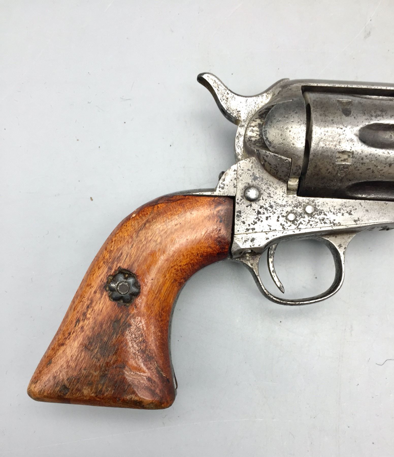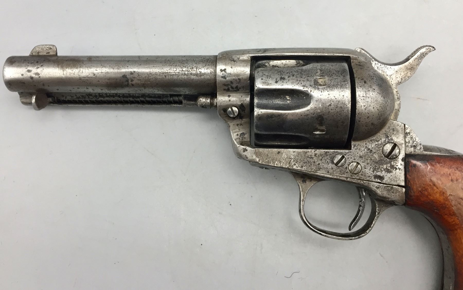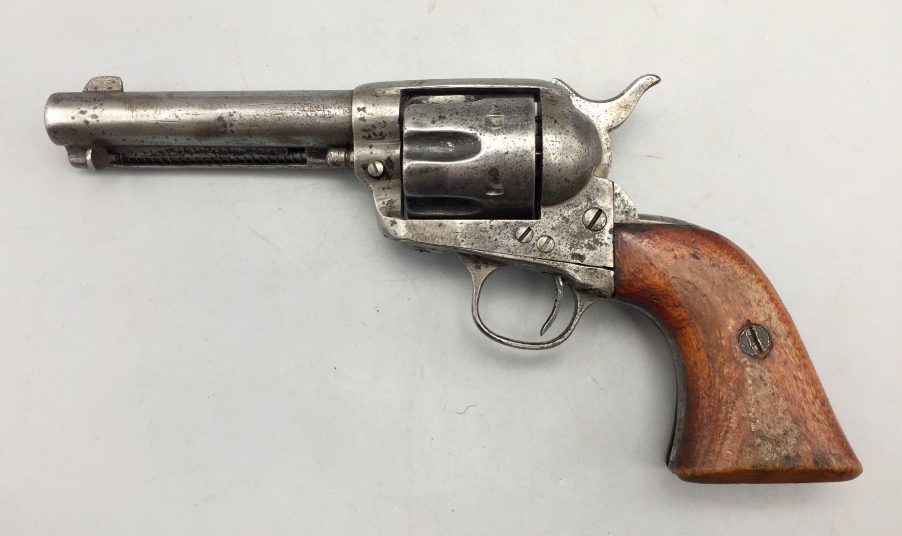 Description: Presented for sale in this lot is a Colt Single Action revolver in .45 caliber. It comes with a brown leather belt and holster. The cylinder does not cycle properly when cocked. Grips are not original. Most of the markings are hard to read. Maker: Colt. Approx. Age: 1898. serial # 177584. Size: Barrel measures 4 ½†with an overall length of 11-1/4â€. Belt measures 40â€. Condition: Poor. Please look closely at the pictures - they are an important part of our description. Shipping: There will be a $15 handling / packaging fee for shipping this lot. The actual cost of postage will be added on top of that. *****This ANTIQUE firearm DOES NOT REQUIRE an FFL Transfer*****
