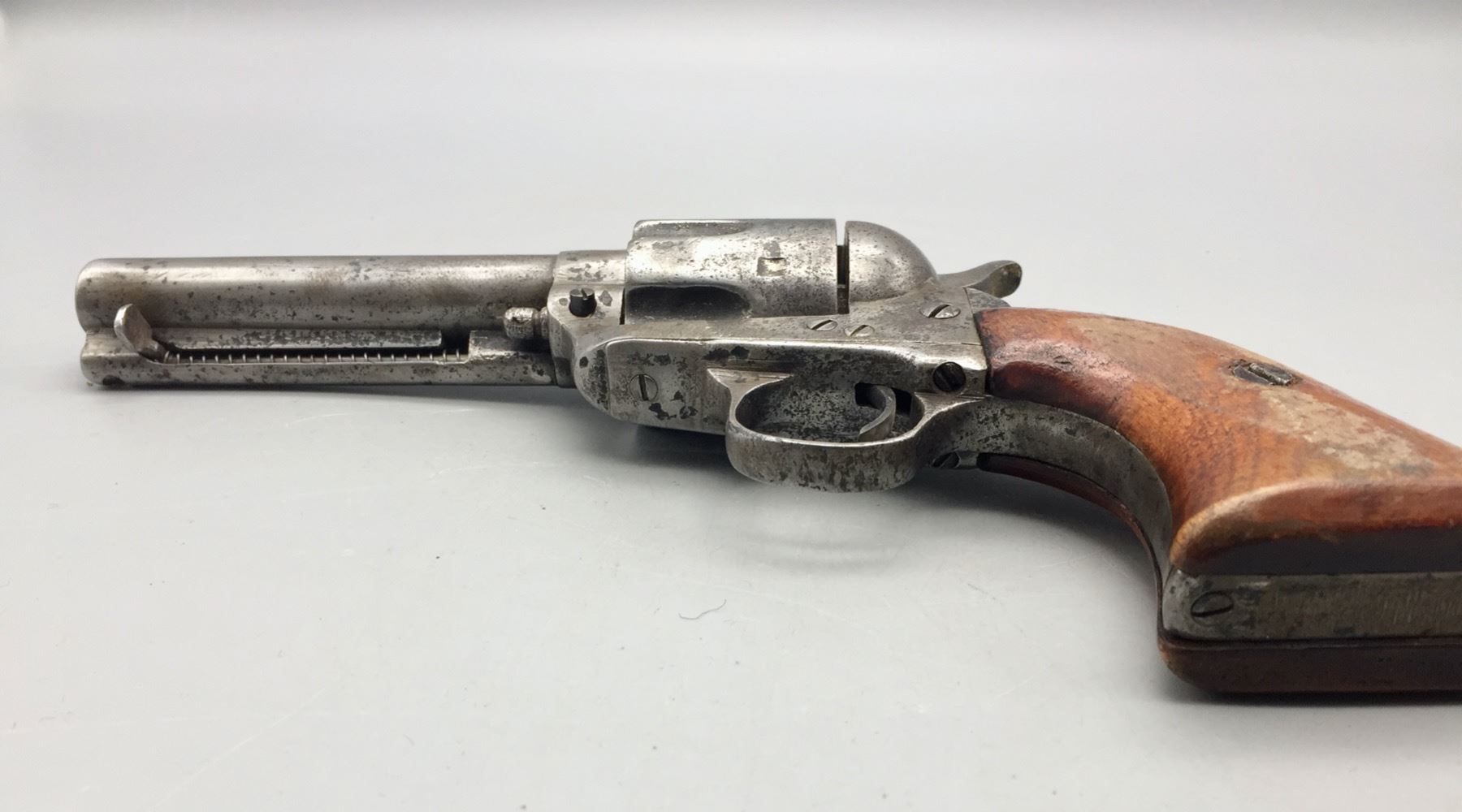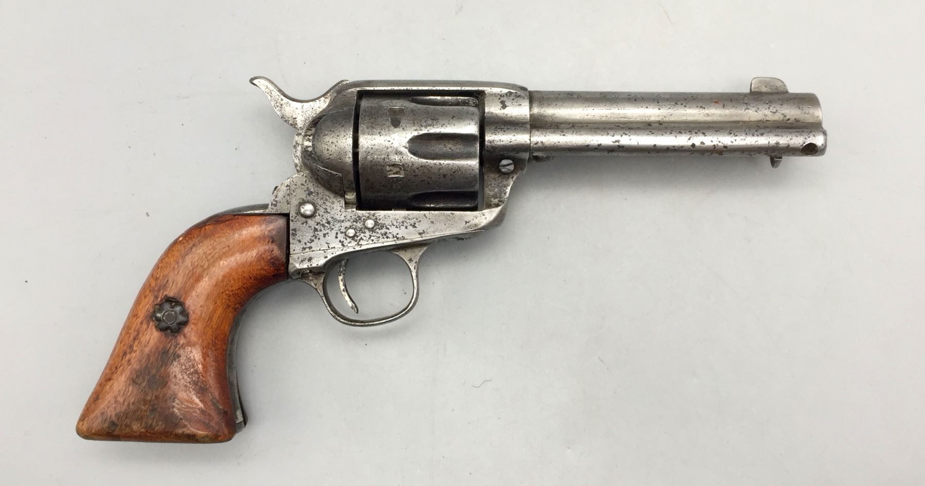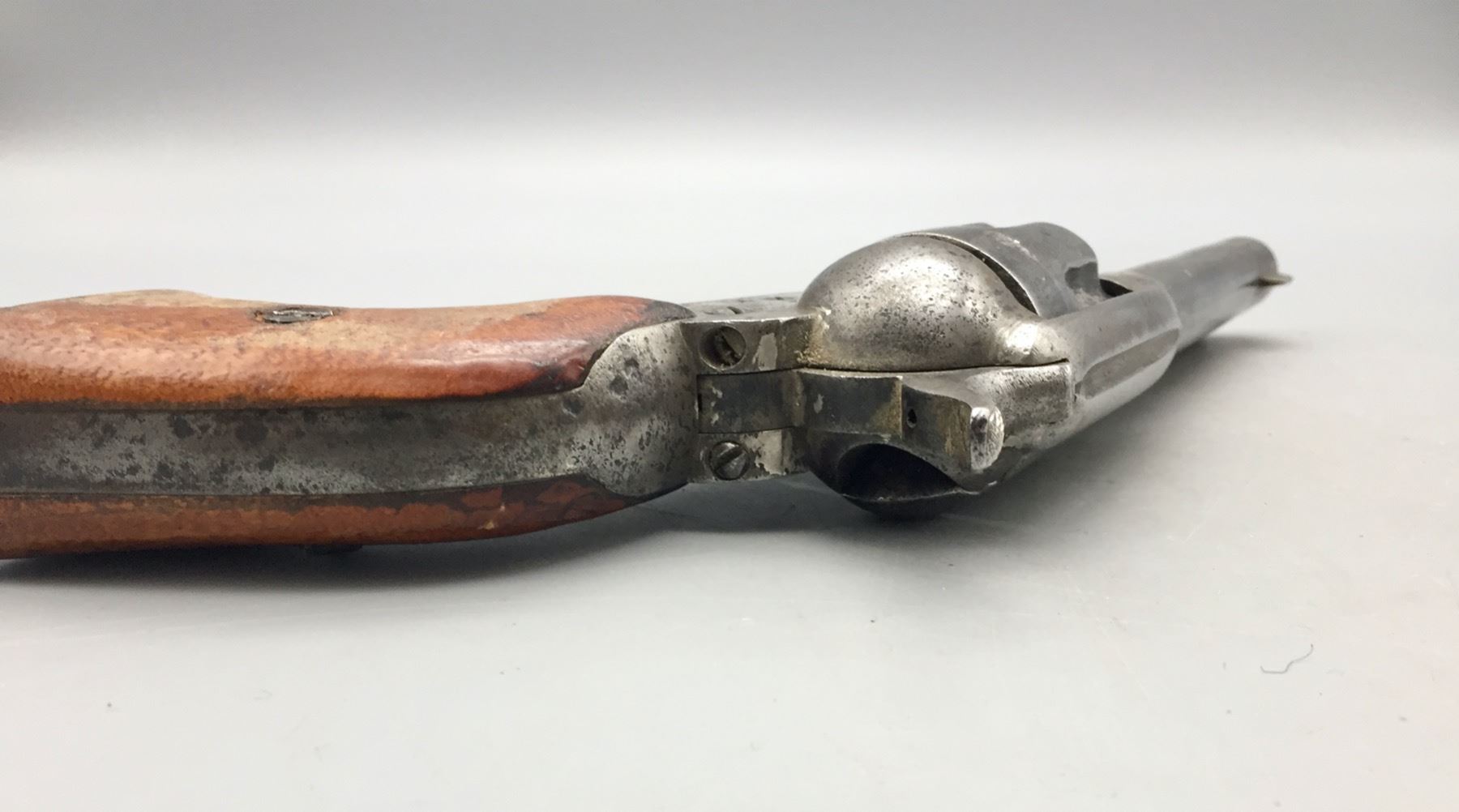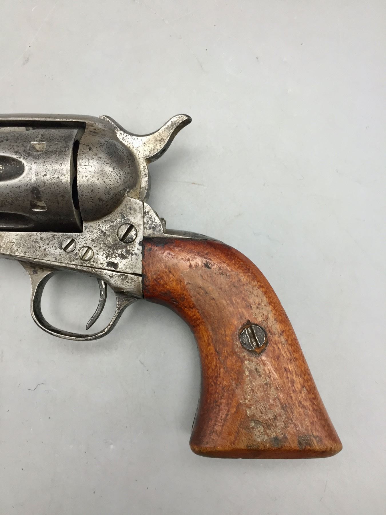 Description: Presented for sale in this lot is a Colt Single Action revolver in .45 caliber. It comes with a brown leather belt and holster. The cylinder does not cycle properly when cocked. Grips are not original. Most of the markings are hard to read. Maker: Colt. Approx. Age: 1898. serial # 177584. Size: Barrel measures 4 ½†with an overall length of 11-1/4â€. Belt measures 40â€. Condition: Poor. Please look closely at the pictures - they are an important part of our description. Shipping: There will be a $15 handling / packaging fee for shipping this lot. The actual cost of postage will be added on top of that. *****This ANTIQUE firearm DOES NOT REQUIRE an FFL Transfer*****