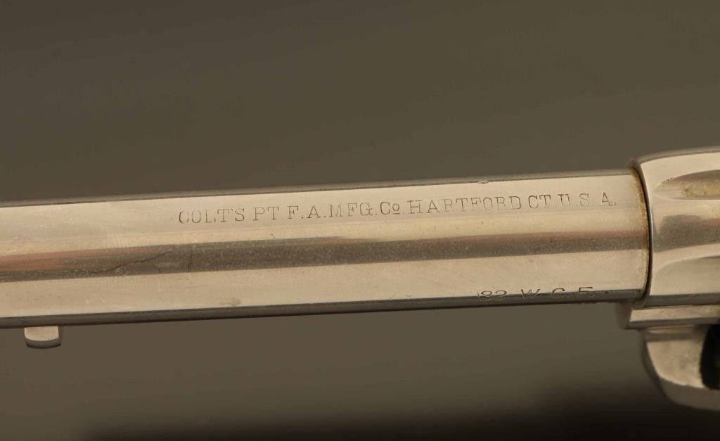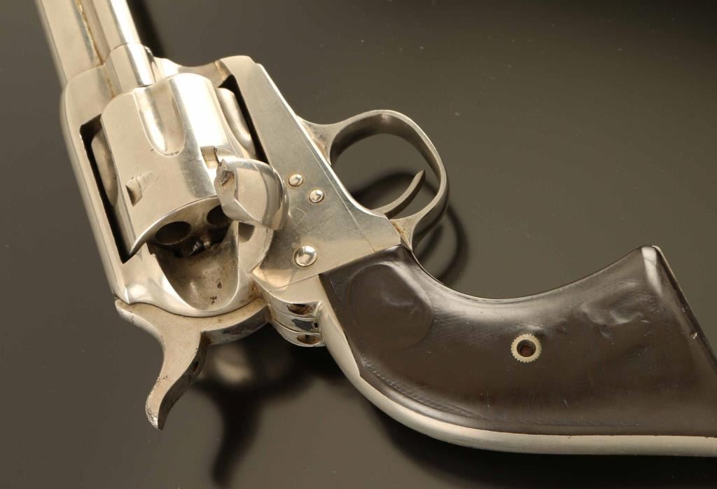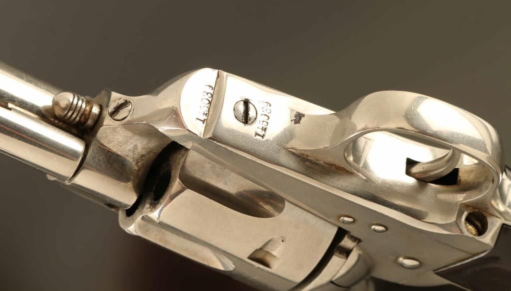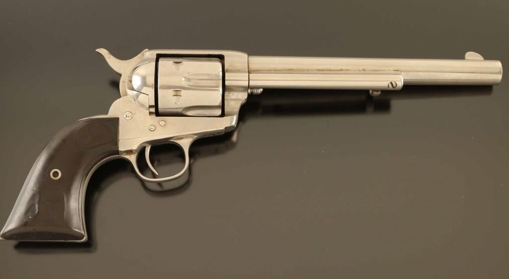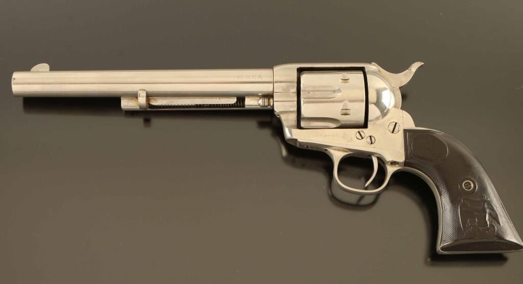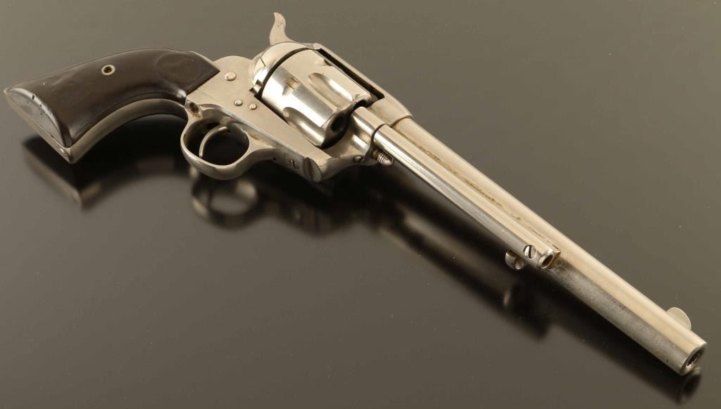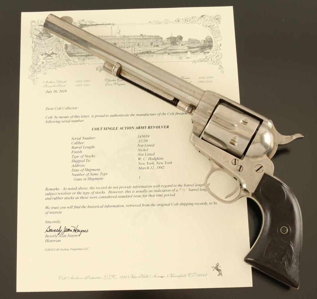 'First Generation' Antique American made single action revolver chambered for blackpowder .30-20 Winchester cartridges, manufactured circa 1892. Features a nickel plated refinish, 7 1/2" barrel with one-line address, ejector rod with half moon head, blade front sight, ‘u’ notched rear sight, smooth thin trigger, knurled hammer spur, fluted six-shot cylinder, and two-piece hard rubber federal eagle grips. Matching serial numbers have been observed full or in part on the frame, triggerguard, backstrap, rear face of the cylinder, barrel & ejector rod housing. Another set of markings, "489N" have also been found full or in part on the triggerguard, backstrap, front face of the cylinder, ejector rod, and ejector rod housing. Includes a Colt factory letter confirming that it left the factory as a nickel plated .32-20 revolver likely with a 7 1/2" barrel & rubber stocks as they were considered standard issue at the time. The letter lists the ship date as March 12, 1892 and the recipient a W. C. Hodgkins of New York, New York. Revolver retains approximately 95% of it's cloudy nickel plated finish showing small scattered losses. Action is sound with four clicks, the bore is bright with good rifling & some scattered light pitting, markings are faint and the hard rubber grips are good with heavy wear. Condition is NRA Good. ***Antique Firearm***
