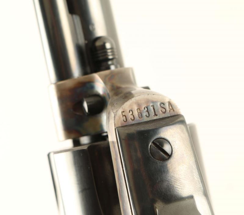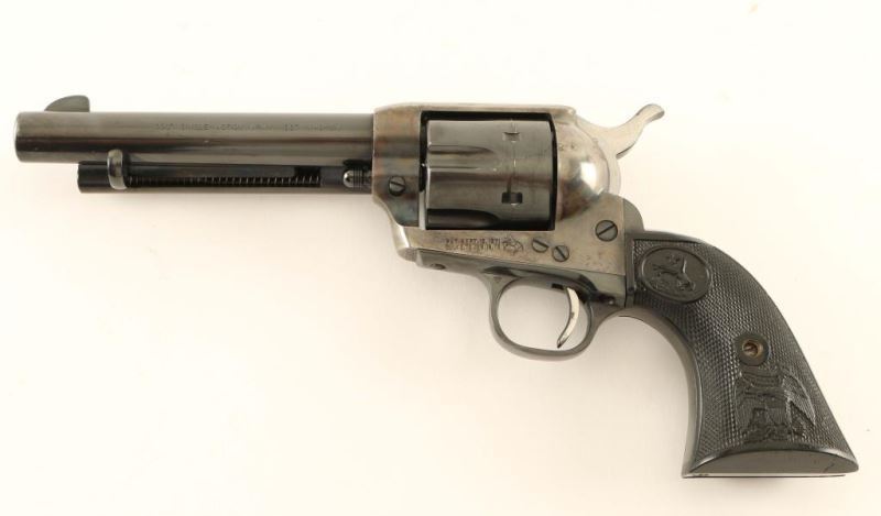 'Second Generation' Single action six-shot revolver chambered in .357 Magnum, circa 1970. Colt ceased production of the SAA at the beginning of WWII with no plans to restart production after the war, but due the increased popularity of western films they began manufacturing the SAA again in 1956. Features a blued & case hardened finish, 5 1/2" barrel with single line address, blade front sight, square notched rear sight, ejector rod, fluted cylinder, smooth trigger, knurled hammer spur, and two-piece checkered black hard rubber grips(marked "COLT'S HTFD, CONN") with federal eagle & Rampant Colt decor. Serial numbers match on the frame, grips(last three numerals scratched onto the back side of both panels), backstrap & triggerguard(found under the left grip.) Revolver exhibits approximately 88% of it's original finish showing muted case colors, light muzzle wear, scattered handling marks and light scattered oxidation on the frame. Action is crisp with tight lock-up, bore is bright with sharp rifling & minor traces of surface rust towards the muzzle, and the hard rubber grips are very good with some minor losses. Condition is NRA very good. ***Modern Firearm***