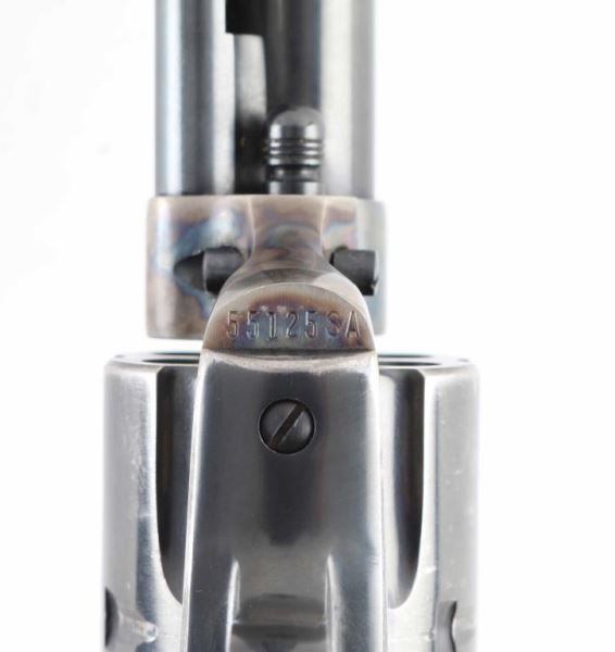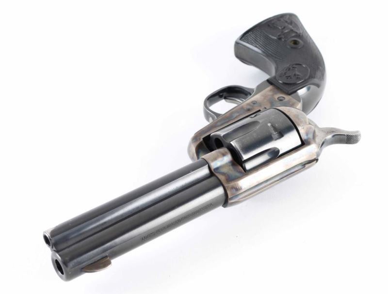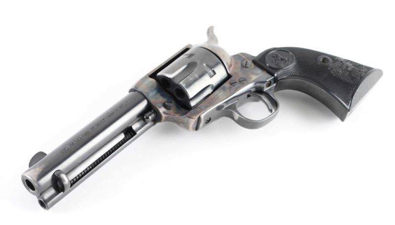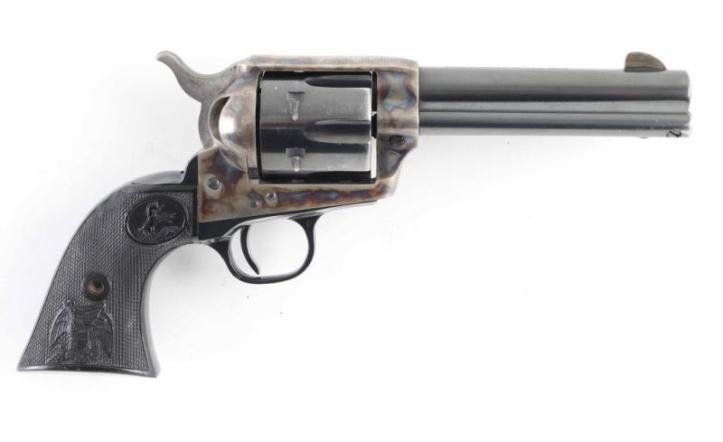 Revolver. Single-Action. 6 rd capacity. 2nd Generation. Manufactured 1970. 4.75" barrel with front blade, and top strap notched rear sight. Assembly # 575 on loading gate. Blued metal finish, with case-hardened frame. One line Colt Address on top of barrel. Side stamped "Colt Single Action Army .357 Magnum. 2 line patent dates, with Rampant Colt on left frame. Checkered black hard rubber grips with Rampant Colts, and American Eagles. Cylinder indexes properly, and hammer locks up tight. Metal finish is about 90%, with some holster wear to the muzzle, and ejector rod knob. There are a couple of light scratches on the barrel. There is slight surface rust spots on the right hammer. Cylinder has edge wear/scuffs, and tracking lines. Cylinders are very good. Bore is excellent/bright. The right grip has a scuff/dent near the rampant Colt. NRA Condition-Very Good. Modern Firearm.