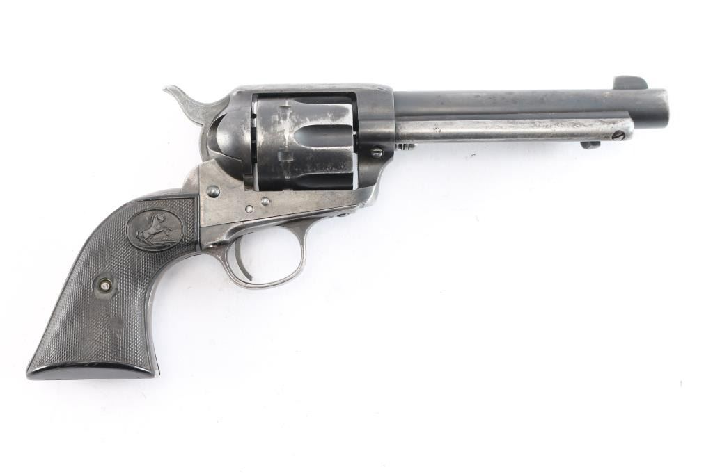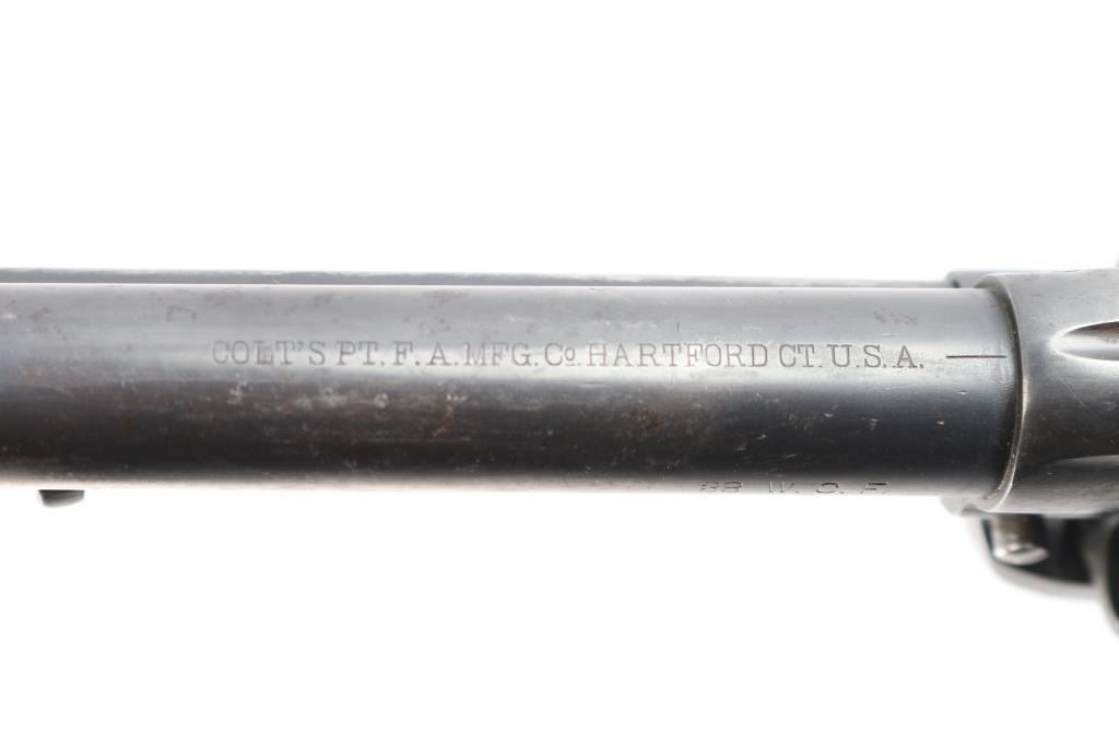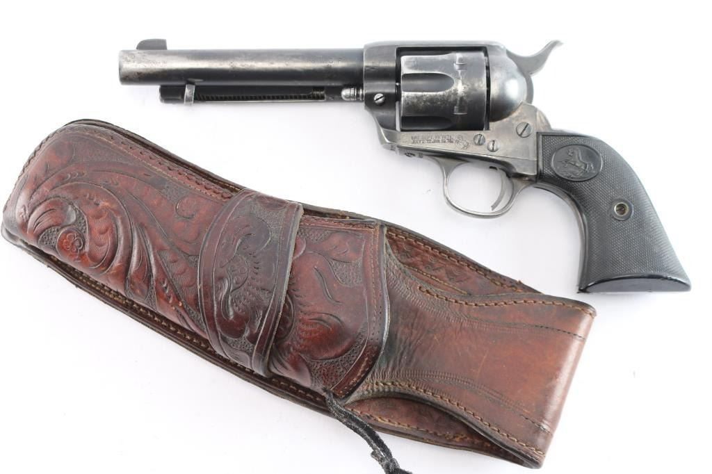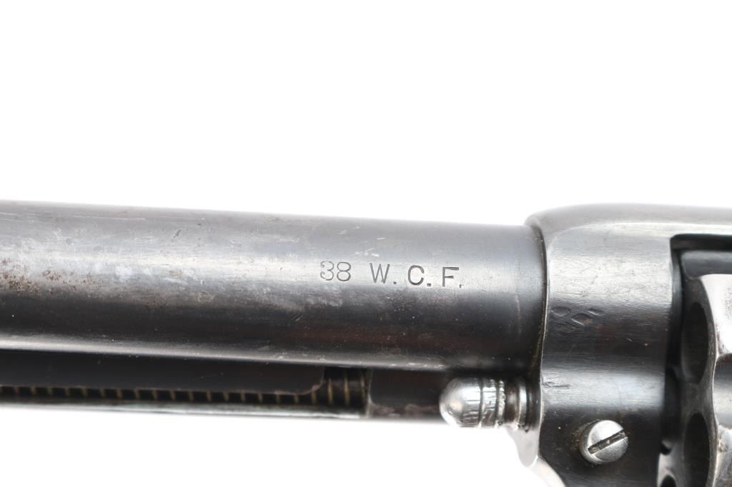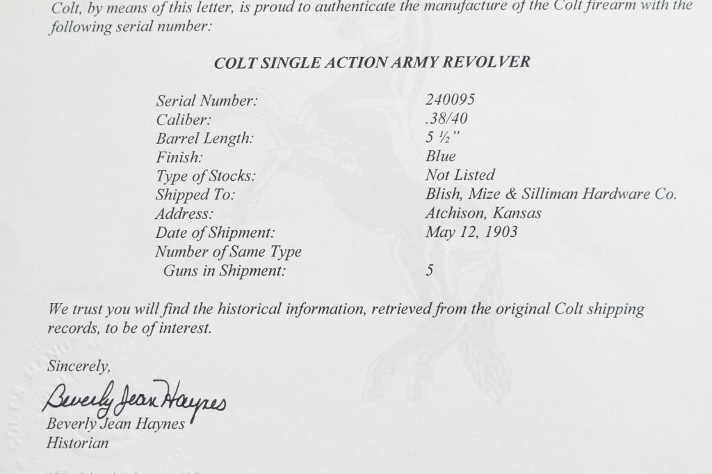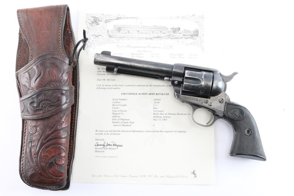 Vintage Colt Single Action Army chambered in .38 W.C.F.(.38-40). Manufactured 1903. 5 1/2" barrel, blued finish, checkered hard rubber grips with 'Rampant Colt' motifs. The top of the barrel is stamped "Colt's PT. F.A.MFG. Co. Hartford Ct. U.S.A", two line patent dates with 'Rampant Colt' in circle on left frame, left barrel stamped ".38 W.C.F." Matching serial number on frame, triggerguard and grip frame. Loading gate numbered "3127". Crescent (or "half-moon) ejector rod head, correct cylinder base pin. The trigger is a correct, newer replacement. The bore is overall very good/bright, strong rifling with a few minor patches of light pitting, the grips are very good with a couple of minor dings, the 4 cock hammer action works well and the original blue is about 60% with holster wear mostly effecting the left barrel and the ejector rod housing. Comes with a nice vintage hand tolled single loop holster, unmarked. Also included is a Colt factory letter confirming the barrel length and finish. It was shipped on May 12th, 1903 to Blish, Mize & Stillman Hardware Co. Atchison, Kansas. One of a five gun shipment.