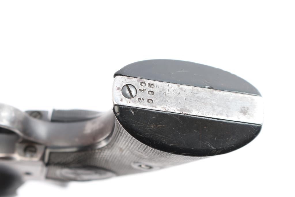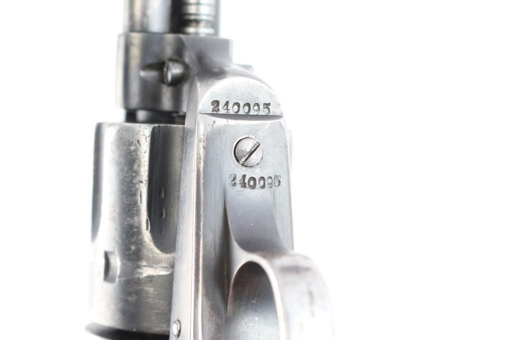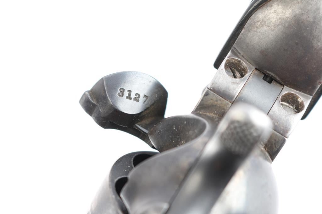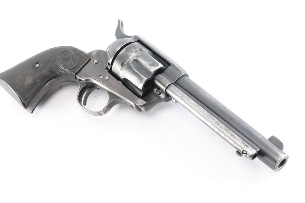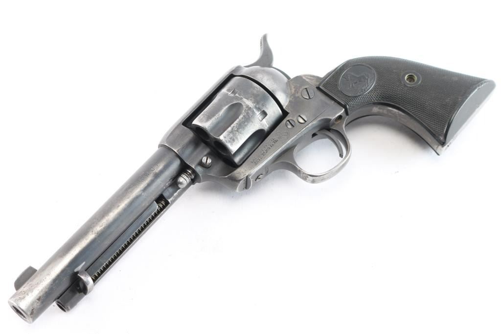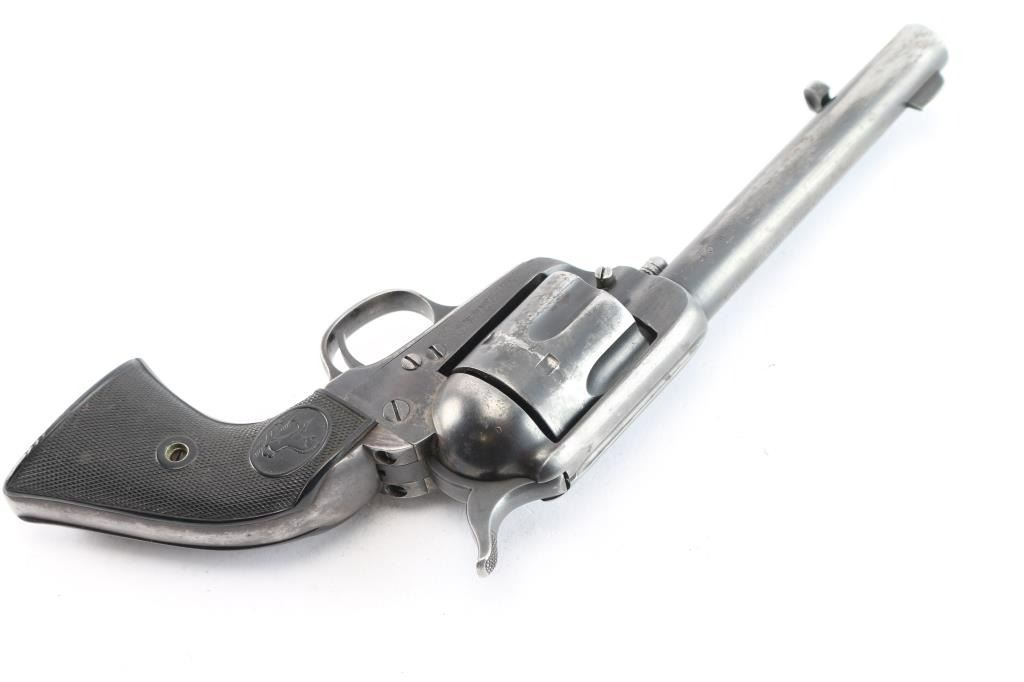 Vintage Colt Single Action Army chambered in .38 W.C.F.(.38-40). Manufactured 1903. 5 1/2" barrel, blued finish, checkered hard rubber grips with 'Rampant Colt' motifs. The top of the barrel is stamped "Colt's PT. F.A.MFG. Co. Hartford Ct. U.S.A", two line patent dates with 'Rampant Colt' in circle on left frame, left barrel stamped ".38 W.C.F." Matching serial number on frame, triggerguard and grip frame. Loading gate numbered "3127". Crescent (or "half-moon) ejector rod head, correct cylinder base pin. The trigger is a correct, newer replacement. The bore is overall very good/bright, strong rifling with a few minor patches of light pitting, the grips are very good with a couple of minor dings, the 4 cock hammer action works well and the original blue is about 60% with holster wear mostly effecting the left barrel and the ejector rod housing. Comes with a nice vintage hand tolled single loop holster, unmarked. Also included is a Colt factory letter confirming the barrel length and finish. It was shipped on May 12th, 1903 to Blish, Mize & Stillman Hardware Co. Atchison, Kansas. One of a five gun shipment.