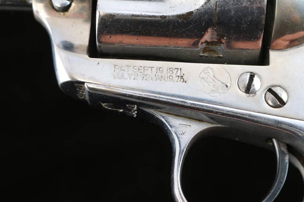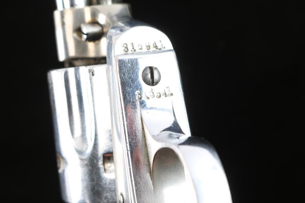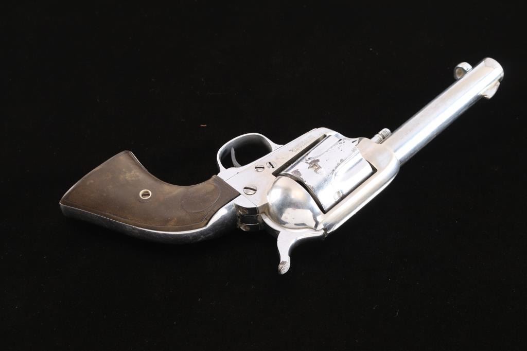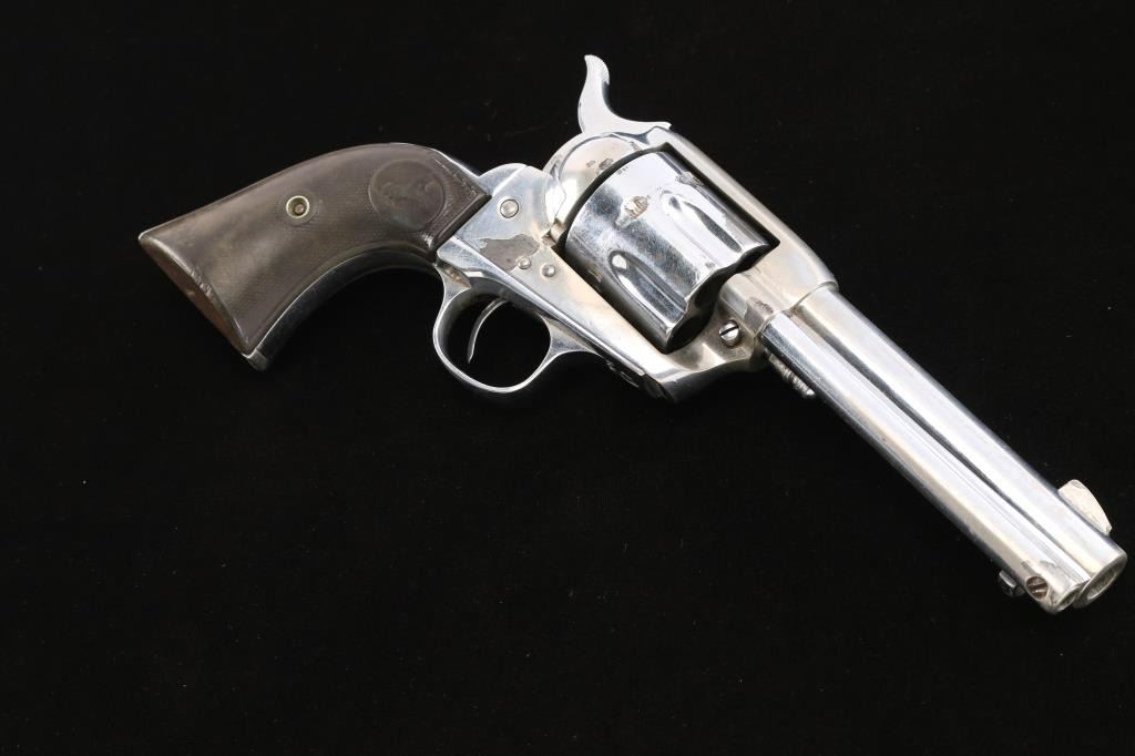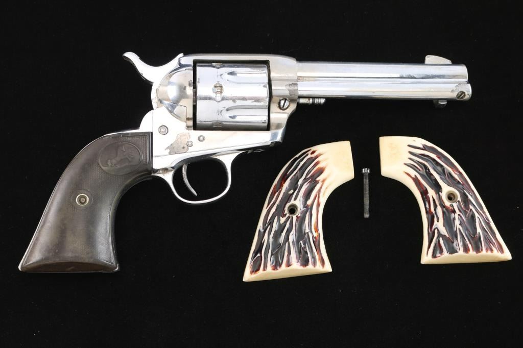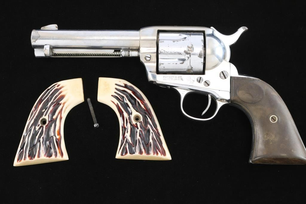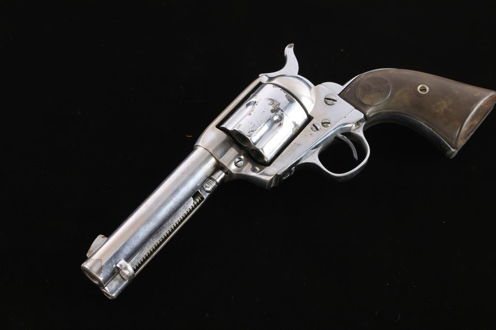 Refinished Colt SAA 1st Generation smokeless chambered in .38 W.C.F. (38-40). Manufactured 1911. Old nickel metal refinish, with checkered 'Rampant Colt' grips. 4 3/4" barrel, with open iron sights. V-notched frame. The two-line Colt barrel markings are feint with the second line obscured by the refinish, faint but readable caliber markings on the left barrel patent dates/Rampant Colt on left frame and serial numbers are clear. Serial numbers match on frame, triggerguard and backstrap. Assembly number is clear on the loading gate. (487). Bore is fair with rifling, some light scattered pin-prick pitting. Nickel refinish shows patches flaking at the muzzle, ejector rod housing, right frame and cylinder. Correct ejector with crescent knob, the grips are mostly worn smooth with feint Rampant Colt motifs, turning brown, the action is smooth with tight lock-up Comes with a pair of good condition faux stag grips.