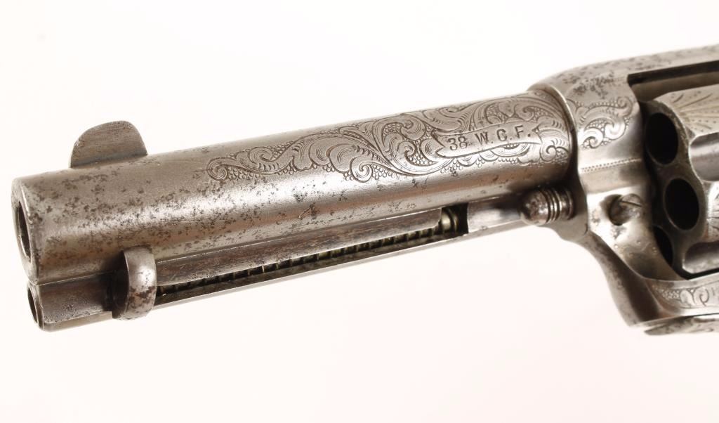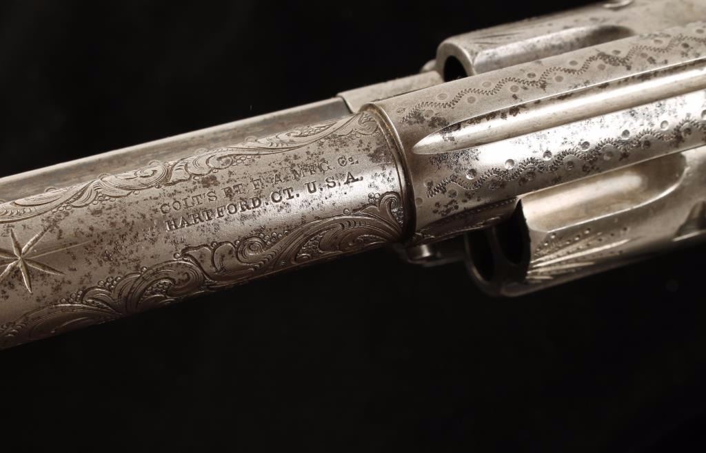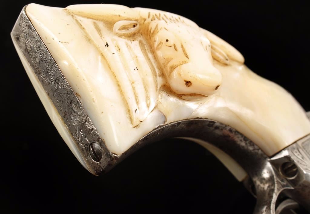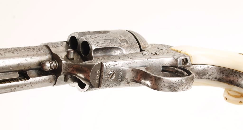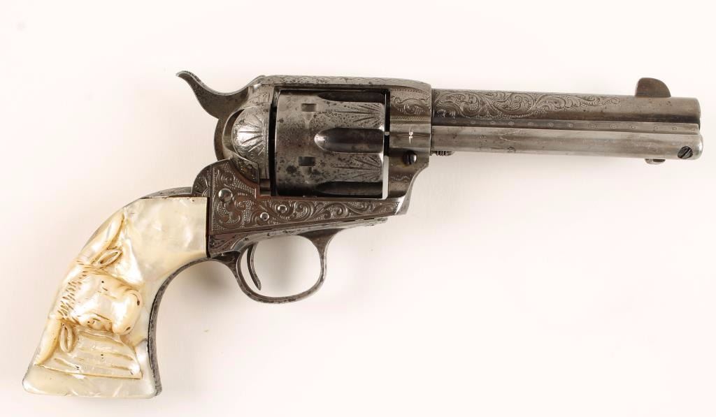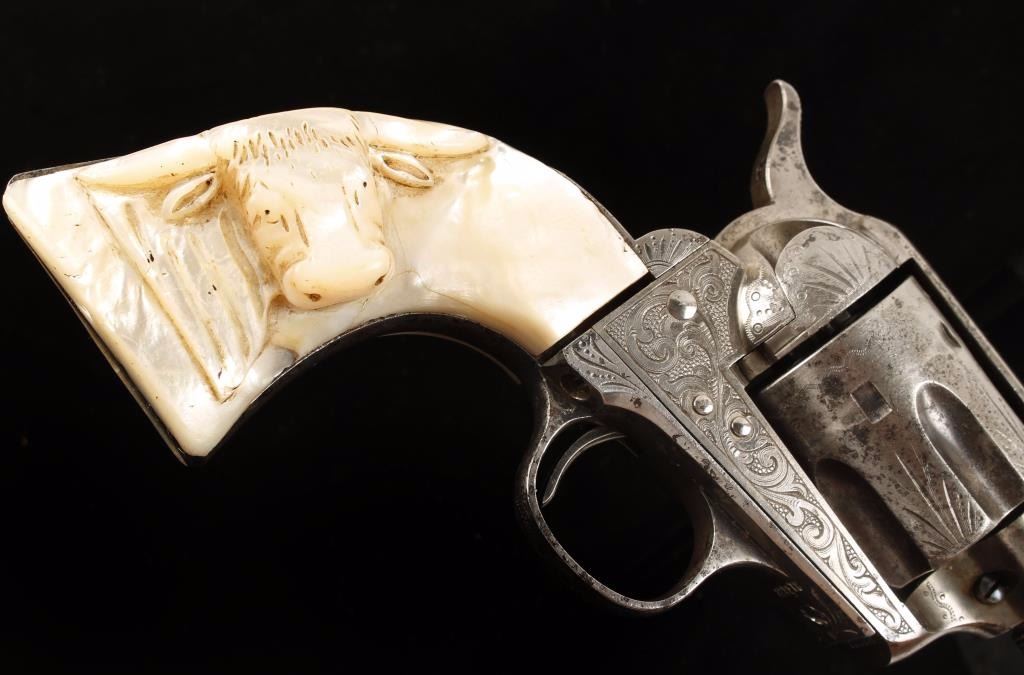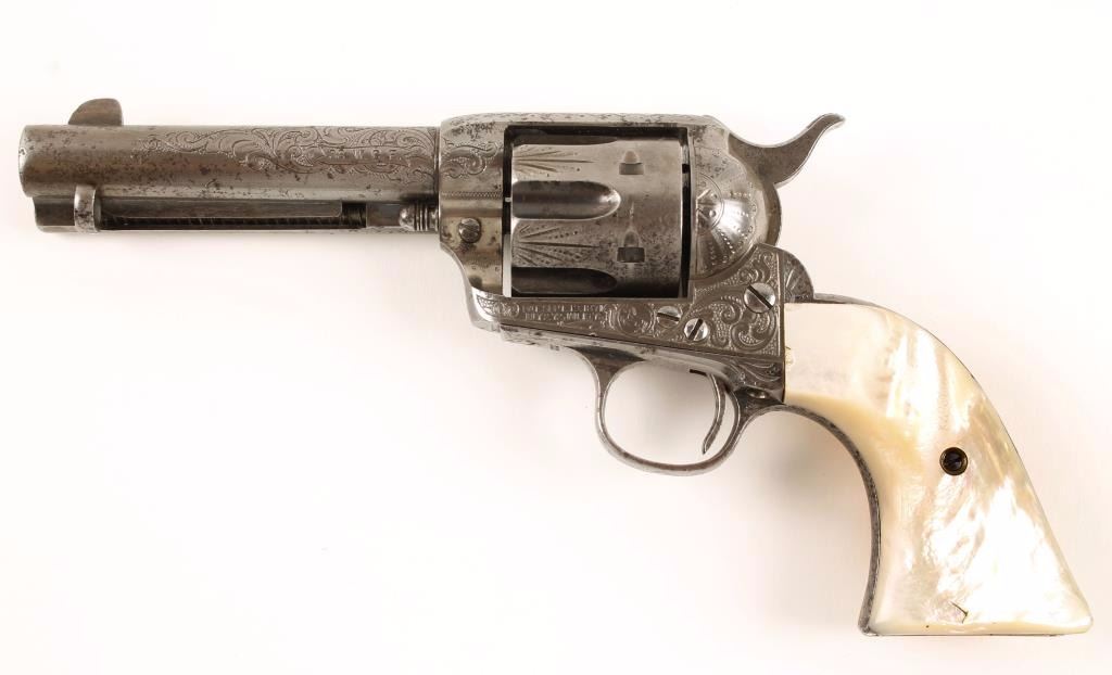 Colt Single Action Revolver,Factory engraved,blued finish, carved pearl grips with steer head, Shipped to Simmons Hardware Co, November 20 1901 with factory letter verifying all features. Traces of original finish within natural gray patina. All matching, blue finish Colt SAA that are engraved are rare and desirable.