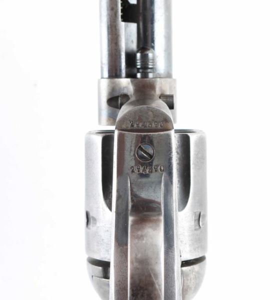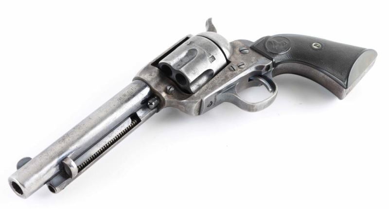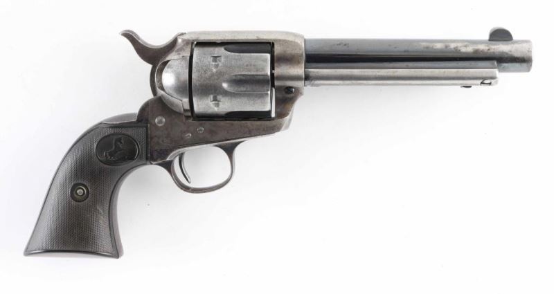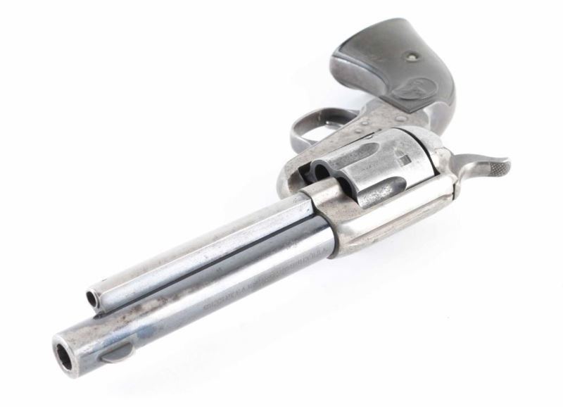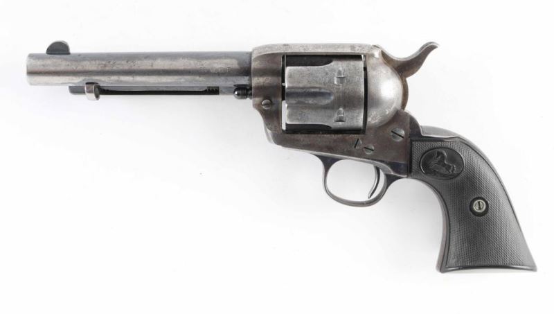 Revolver. Single-Action. 6 rd capacity. 1st Generation. Manufactured 1907. 4.75 barrel with front blade, and top strap notched rear sight. Assembly # 736 on loading gate. Blued metal metal finish. One line Colt Address on top of barrel. Side stamped "38 W.C.F.. 2 line patent dates, with Rampant Colt on left frame. Black checkered Rampant Colt grips. Cylinder indexes properly, and hammer locks up tight. Metal finish is about 20% with traces on barrel/ejector housing, triggerguard, cylinder flutes, and recessed areas. Cylinders are very good. Bore is good with good rifling, but has some small patches of light pitting. Grips are very good. Matching Serial # 's. NRA Condition-Good. Modern Firearm.